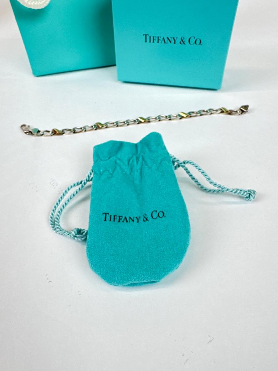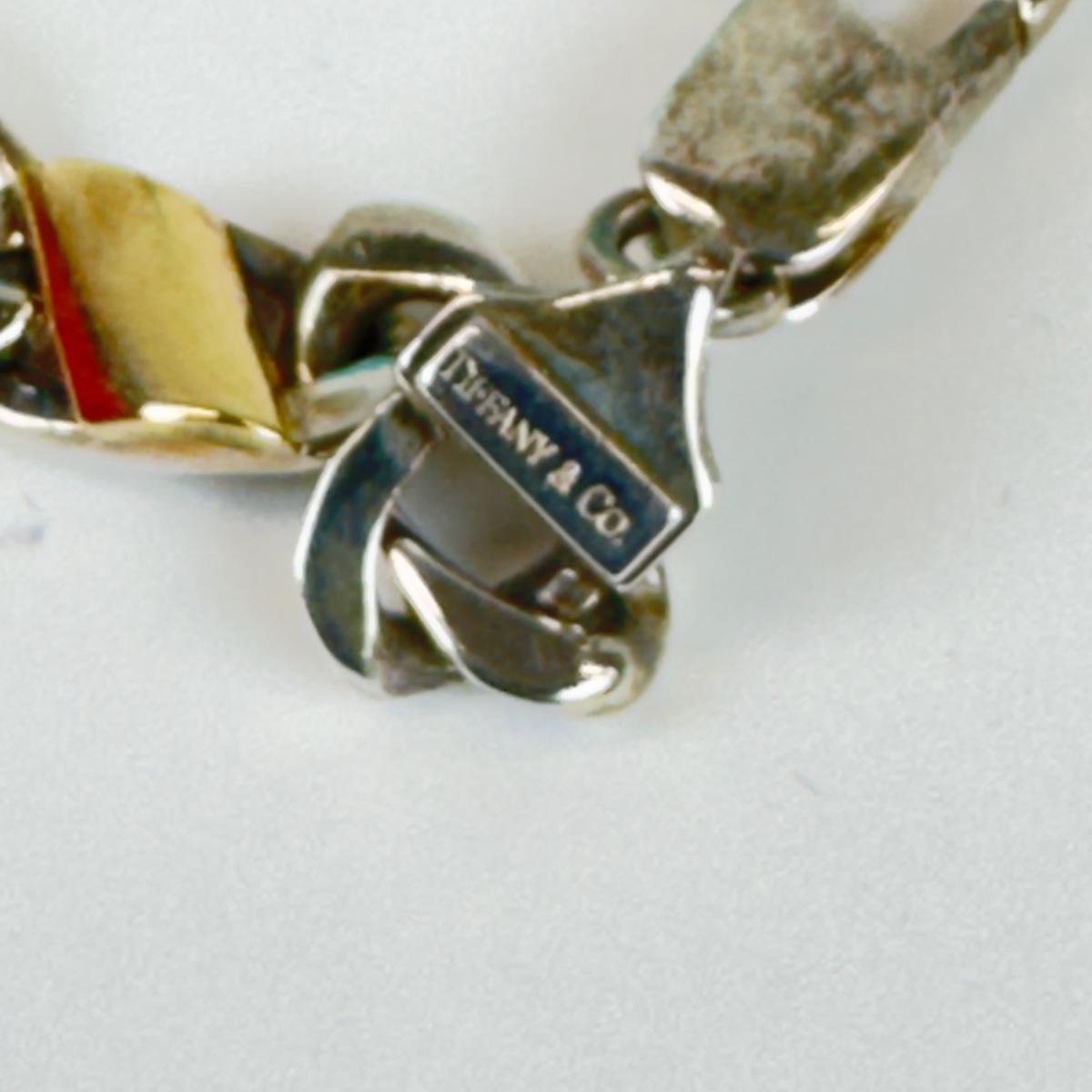Stamped 750 under Gould link and 925 Italy with Tiffany and Company stamp comes with box bag and pouch measuring 7.5 inches in length