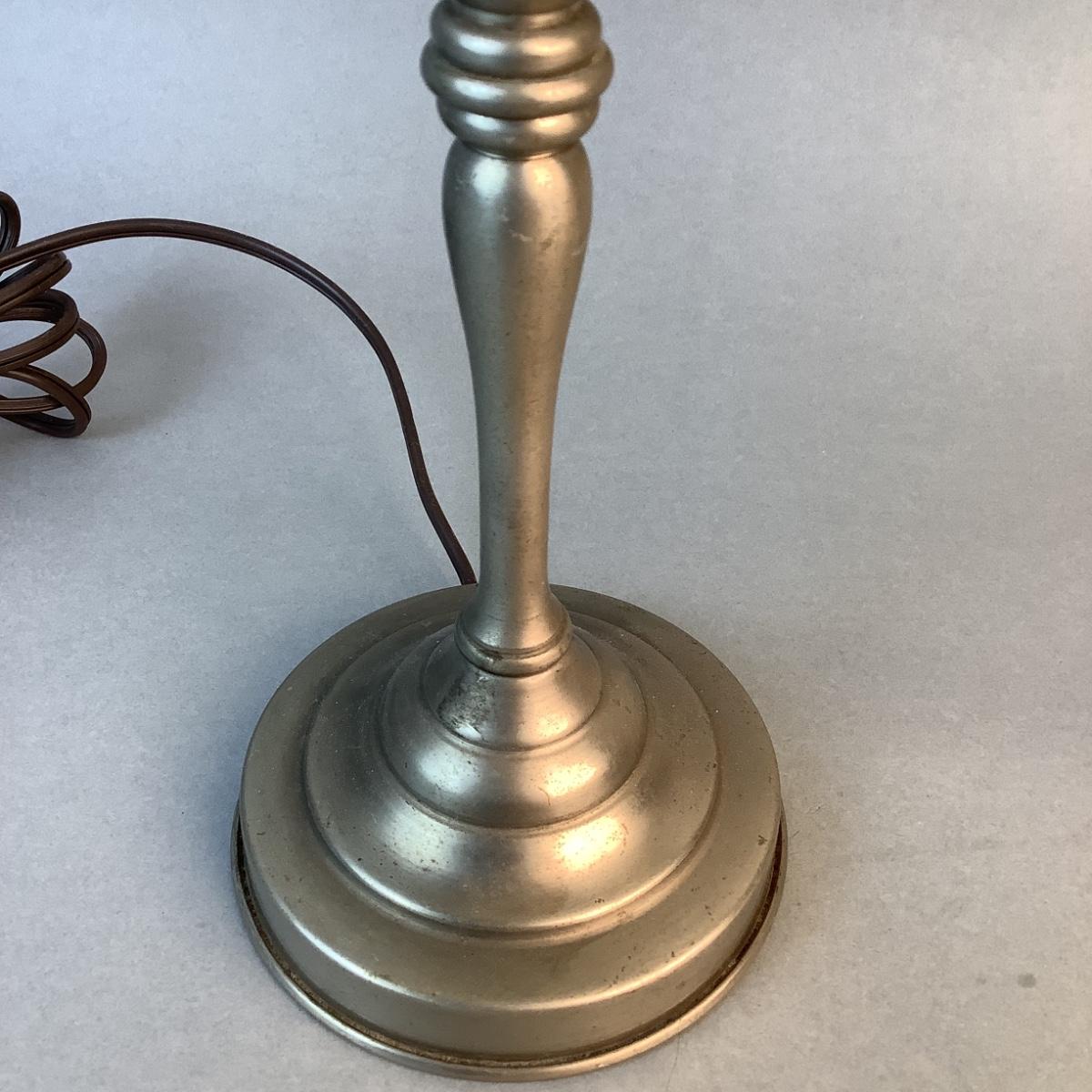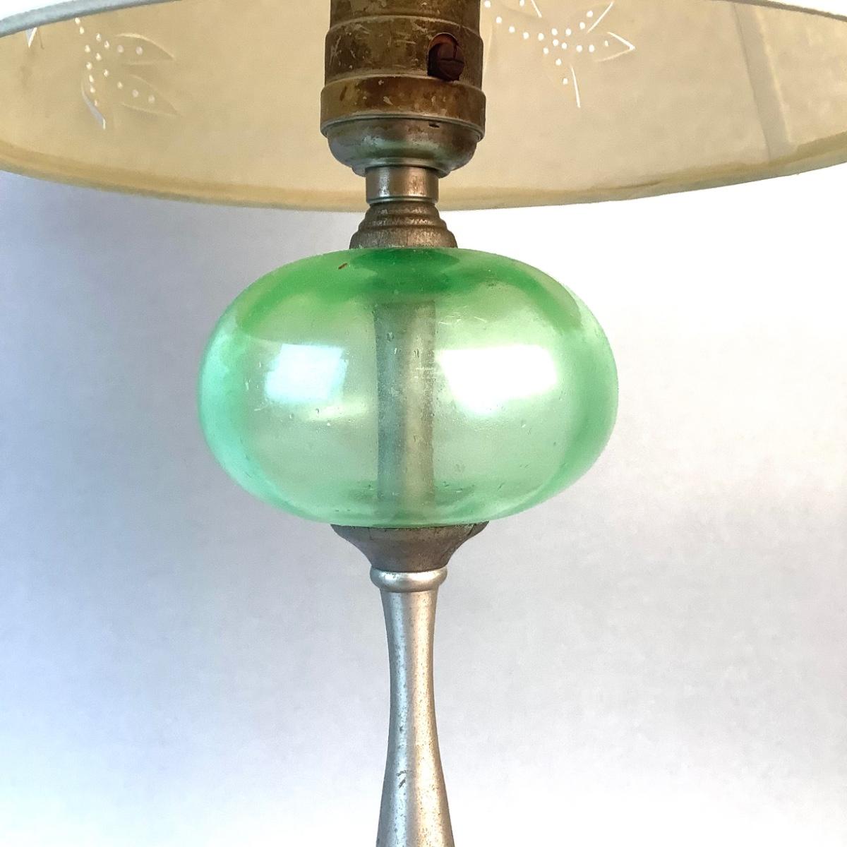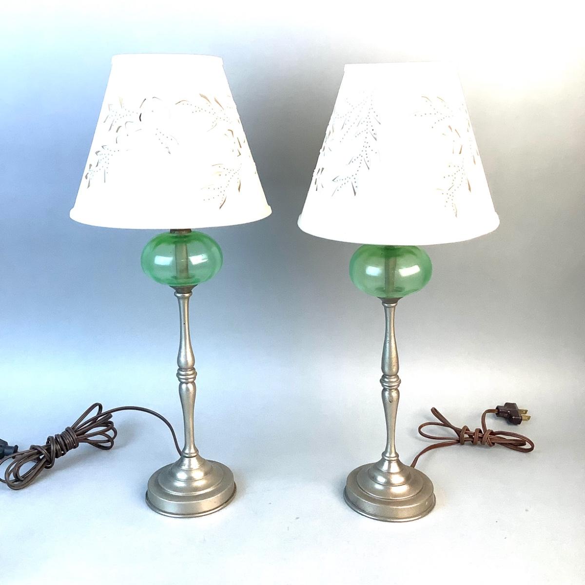 1068 Pair of Vintage Pewter and Green Glass Candlestick Lamps