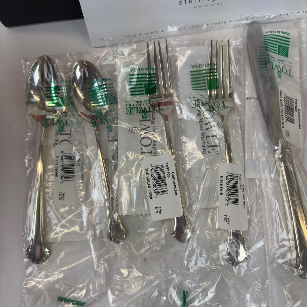 new in box comes with dinner and salad fork, knife, oval soup spoon and place spoon in the chippendale pattern