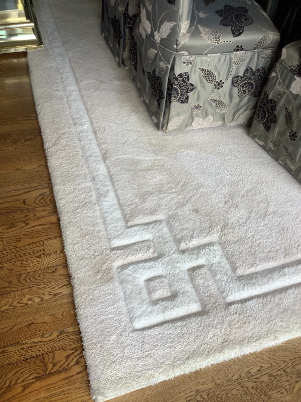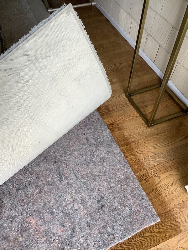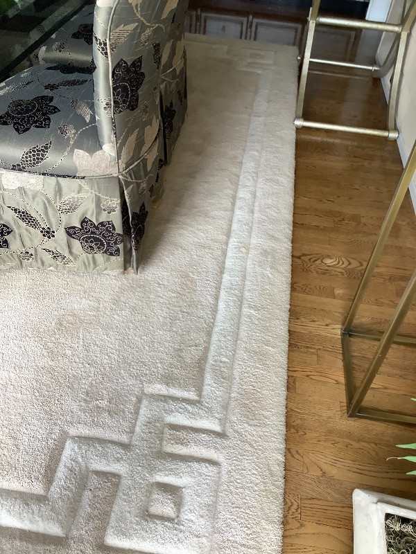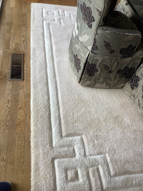 Large Rug with neutral tones measuring 102” wide x 133” long includes rug pad shown in pictures