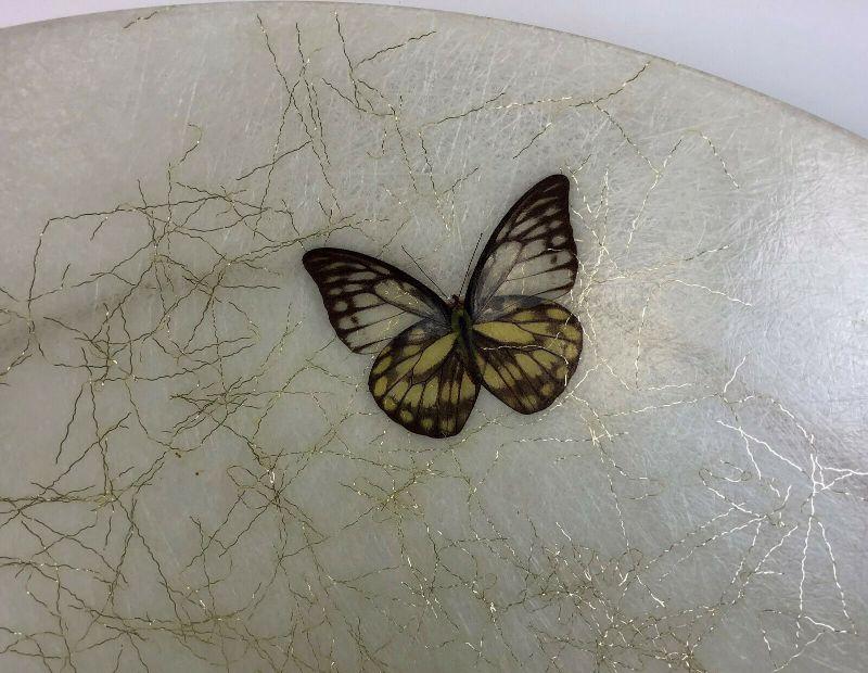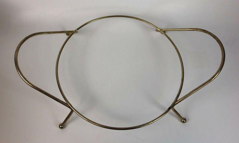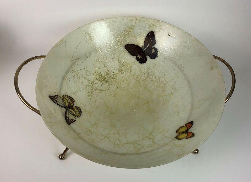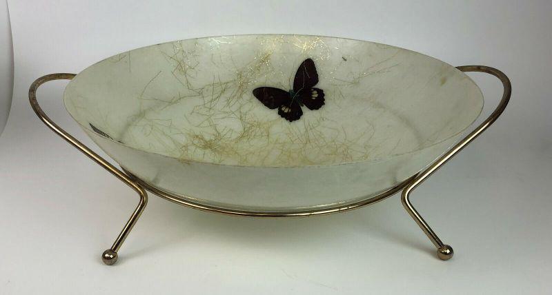 From the Mid Century here is a large molded fiber glass serving bowl and brass rack from art line of california...Measures 14.5" wide..Metal rack 17.25"...Unbreakable..Washable...Adorned with gold threads and butterflies...Unique vintage serving ware..offered with no reserve...