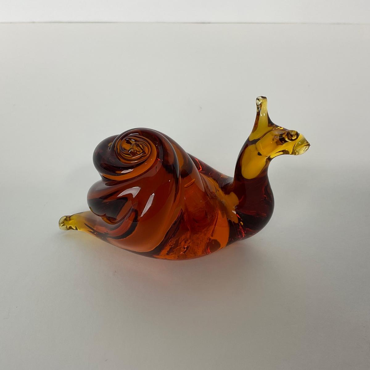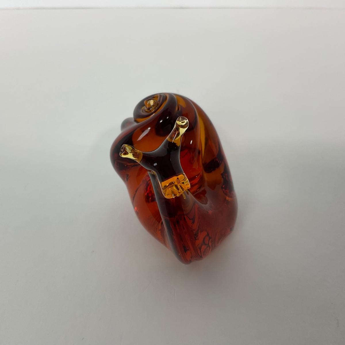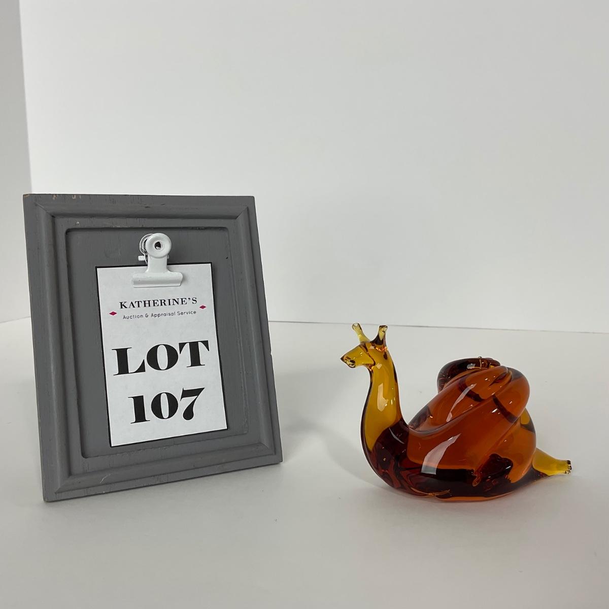 One amber colored Pilgrim snail paperweight. This piece does have a small chip on the tail but is in otherwise great shape. 2 1/2 inches tall by 4 1/2 inches wide. Please see photos for details and condition. Any condition statement is given as a courtesy to a client, is an opinion, and should not be treated as a statement of fact. Reference to condition written, oral or within a condition report shall not be regarded as a full account of condition and may not include all defects, alterations, or restorations. Absence of a condition report does not imply a lot is flawless or lacking imperfections or damage. Katherine’s Auction & Appraisal Service shall have no responsibility for any error or omission. Returns shall not be accepted on the basis of condition. ::: Shipping is available on this lot. If you require shipping you must let us know at the close of the auction. We will coordinate with you after the item has been won. Shipping fees will include insurance up to or exceeding the value of all items being mailed. If you have any questions regarding this lot please contact the auctioneer either via this website, by direct email or by phone. PICK UP TIMES and other important information can be found in the TERMS and DESCRIPTION of the auction. Please take a look for pertinent information. Thanks!