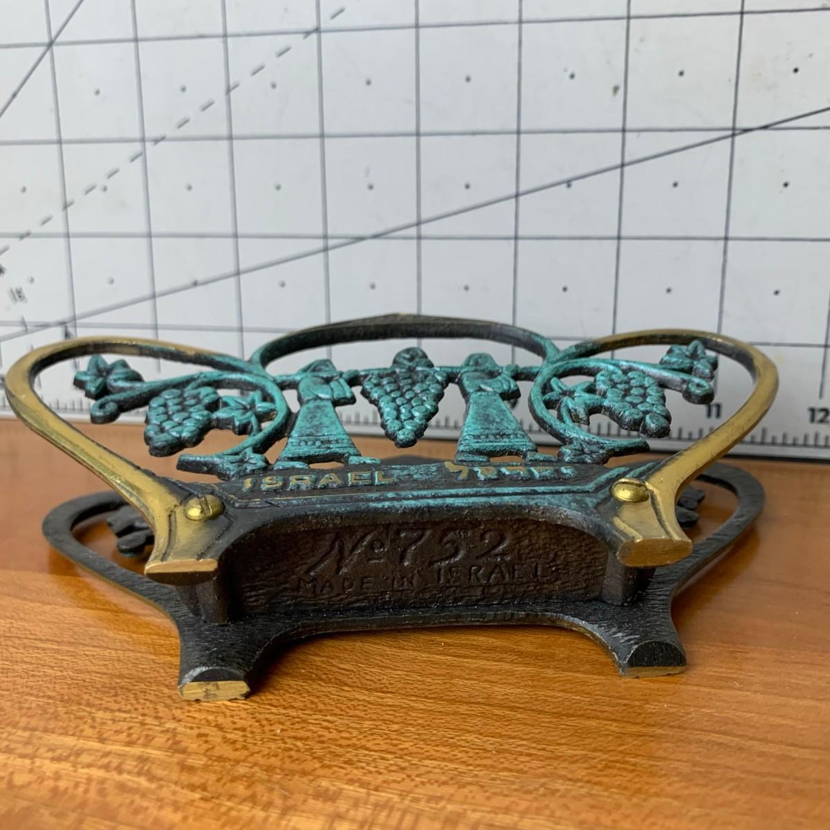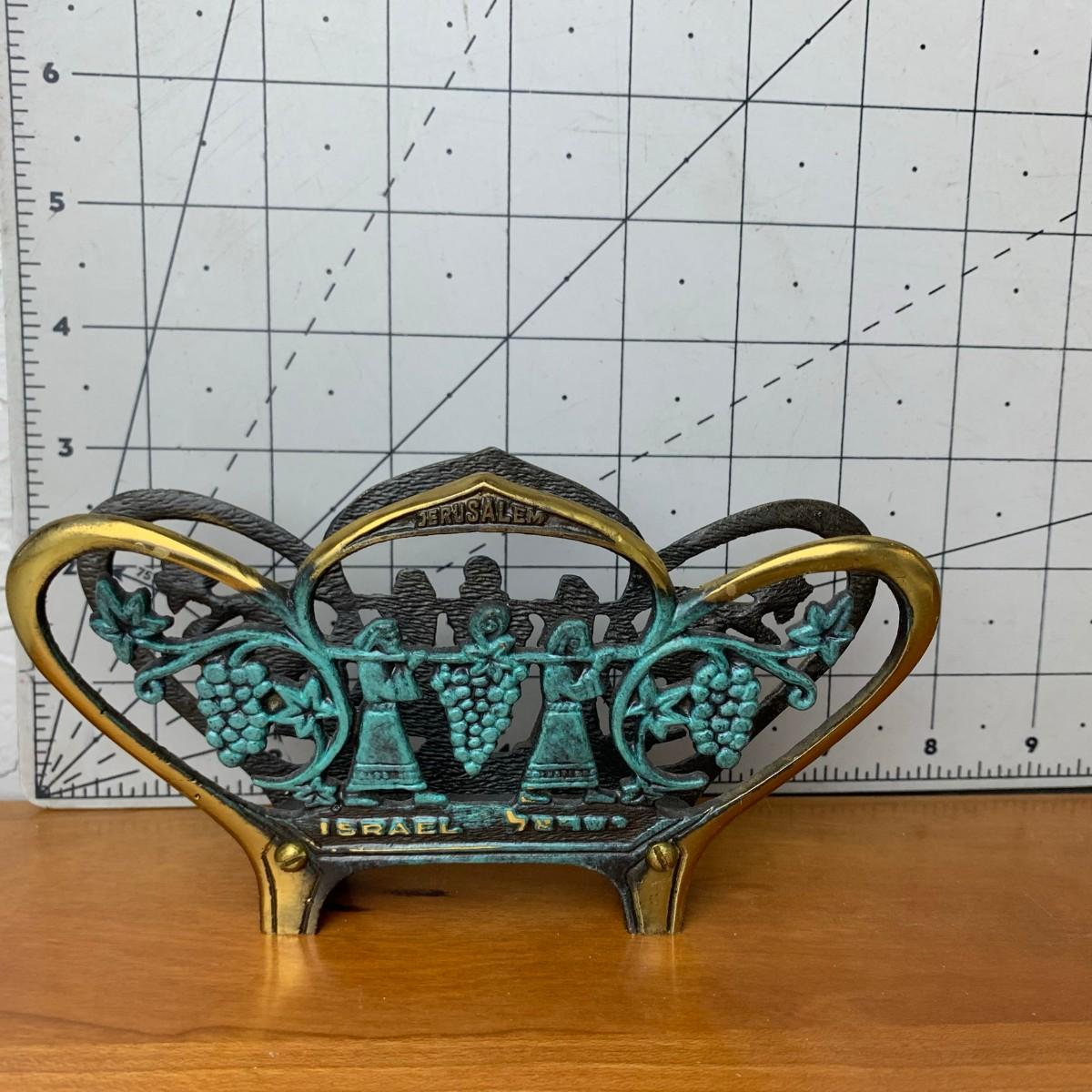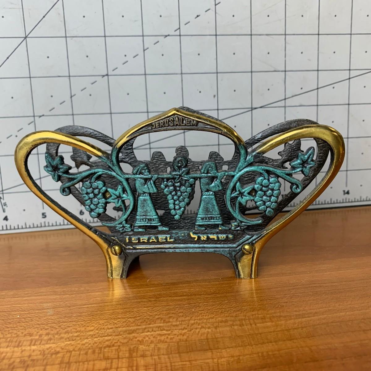 #107 Vintage Brass Sabra Napkin Holder Brass & Green Enamel