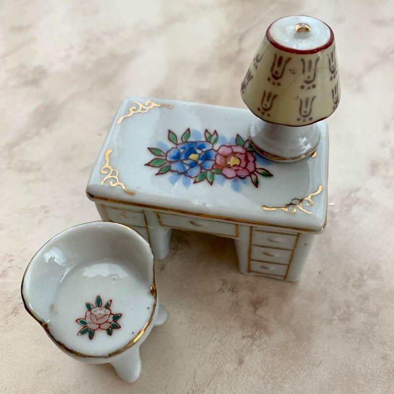 Occupied Japan ceramic furniture desk, lamp, chair. Chair and lamp are under 2" tall Desk is 2"x3"