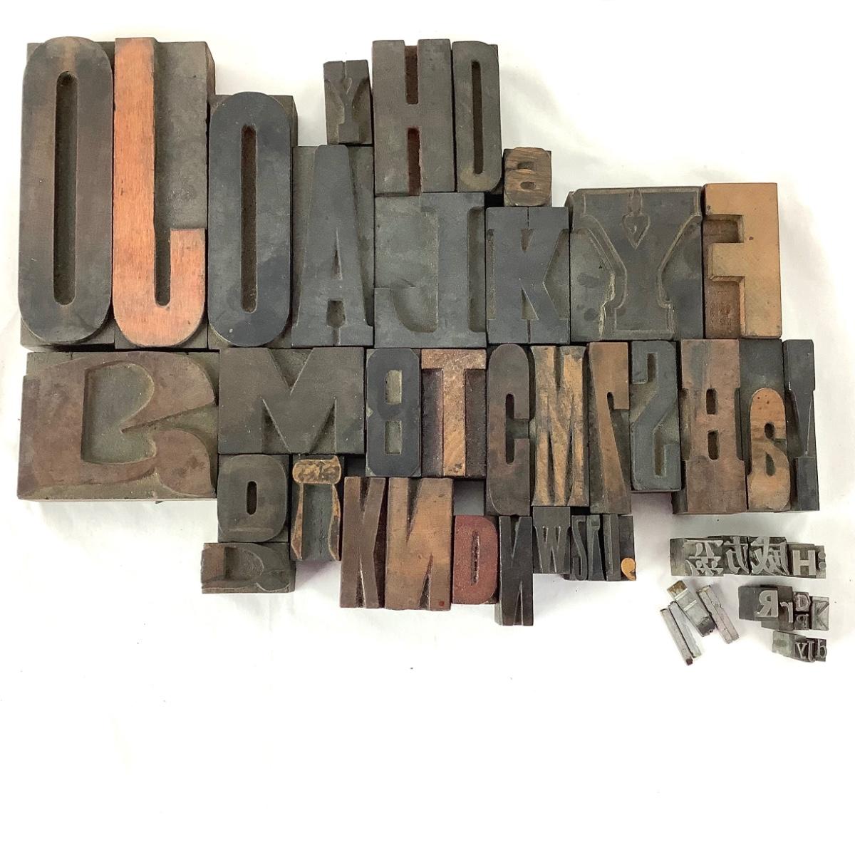 Assorted lots of wooden and metal printing blocks. There are 35 wooden blocks and 15 metal blocks. Assorted letters and symbols.