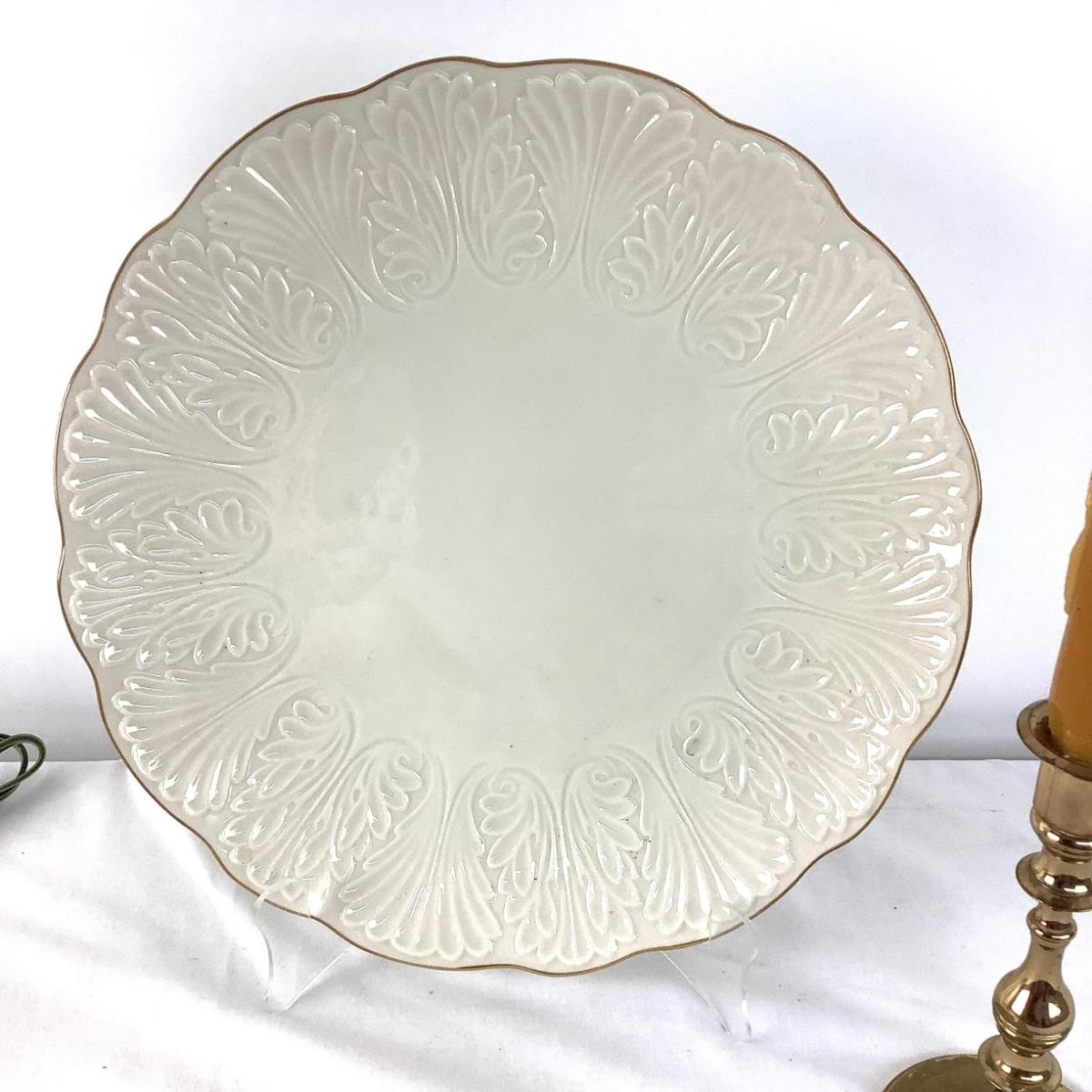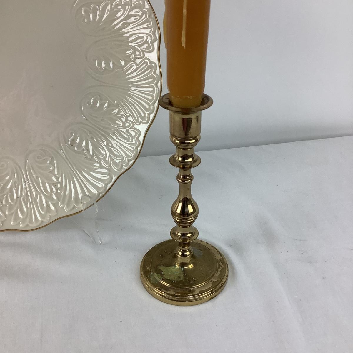 Lenox charger is 12.5" d, candlestick lamp is 22"h, candlestick 12" tall with candle.