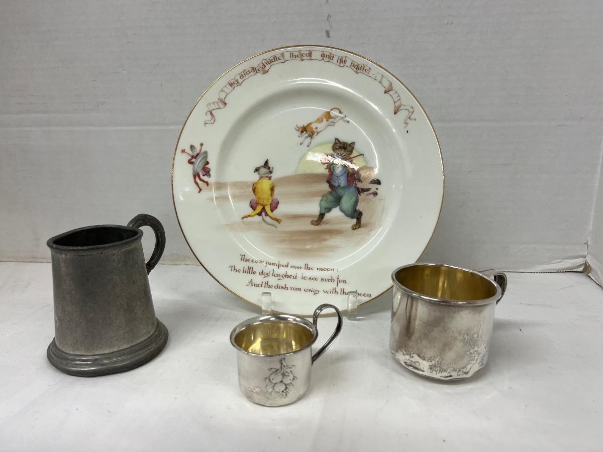 Royal Doulton Childs Plate with Two Sterling Silver baby cups and small childs pewter tankard with glass bottom etched "all gone"