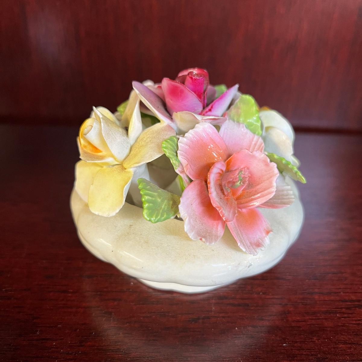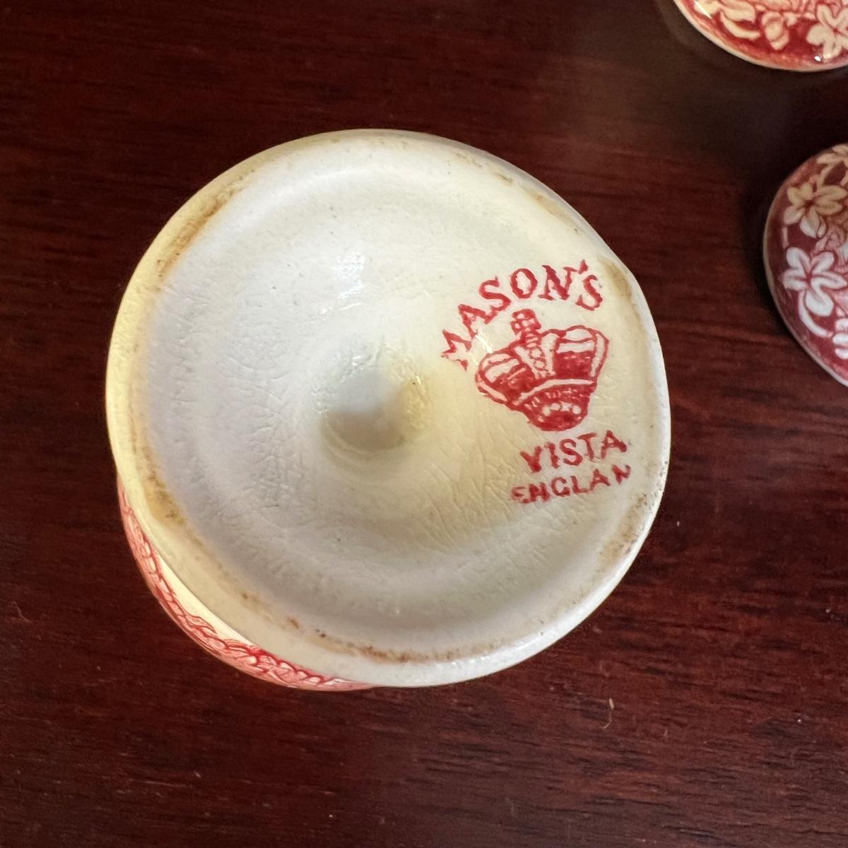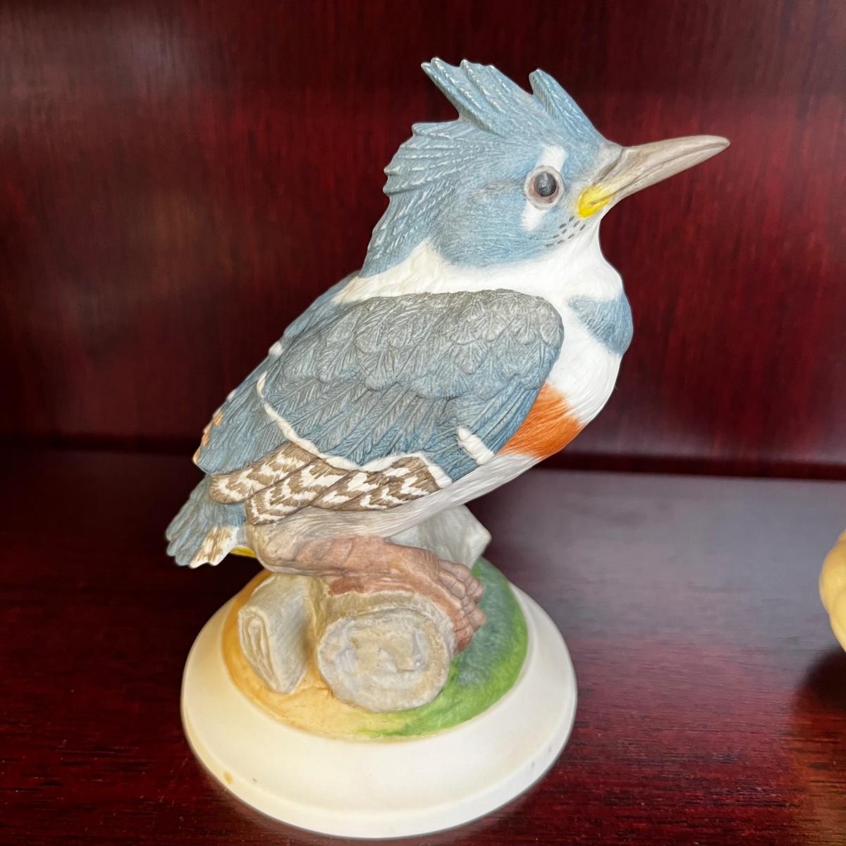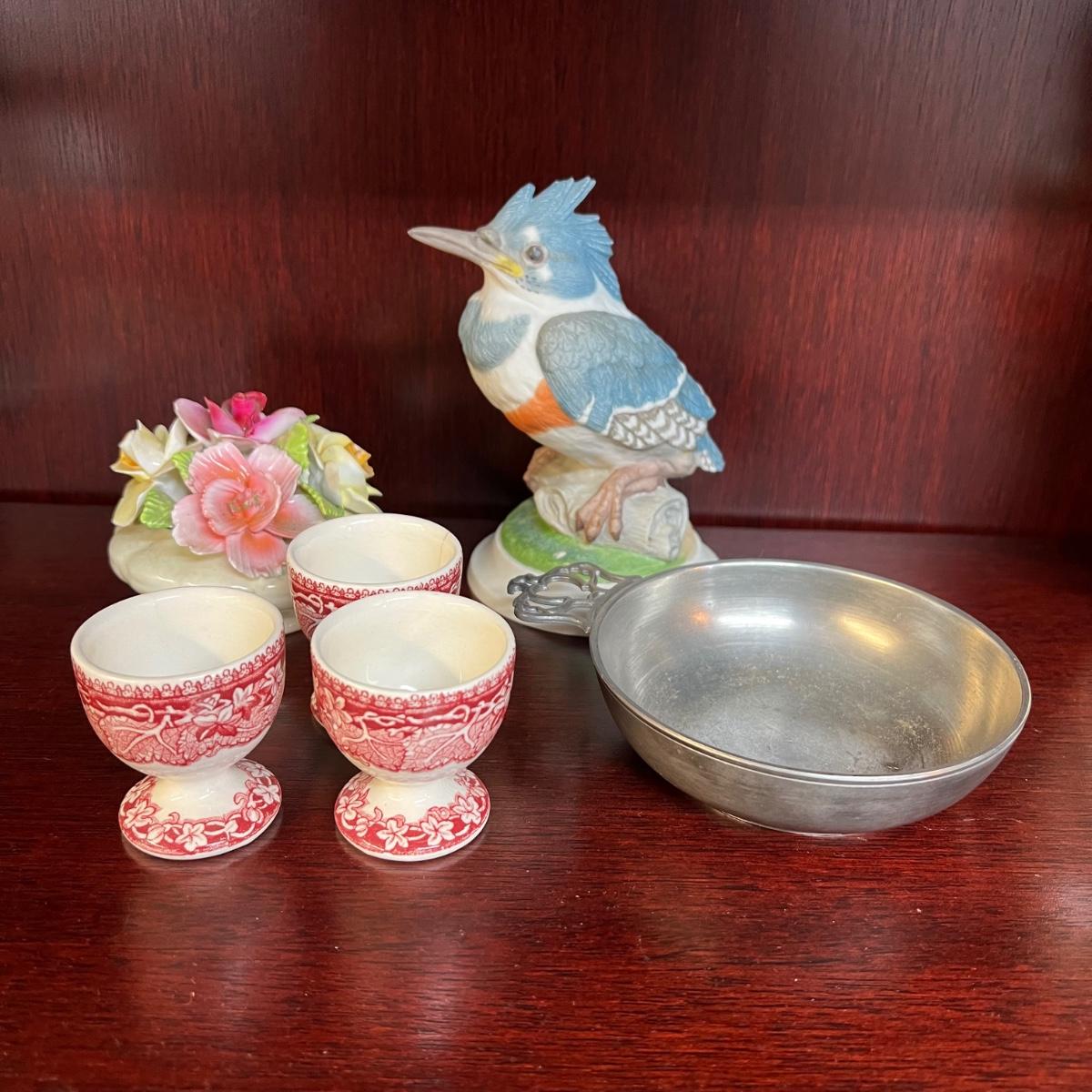 The lot contains 3 Mason's egg cups, Throley Staffordshire porcelain floral arrangement and Boehm Blue bird that measures 6" tall.