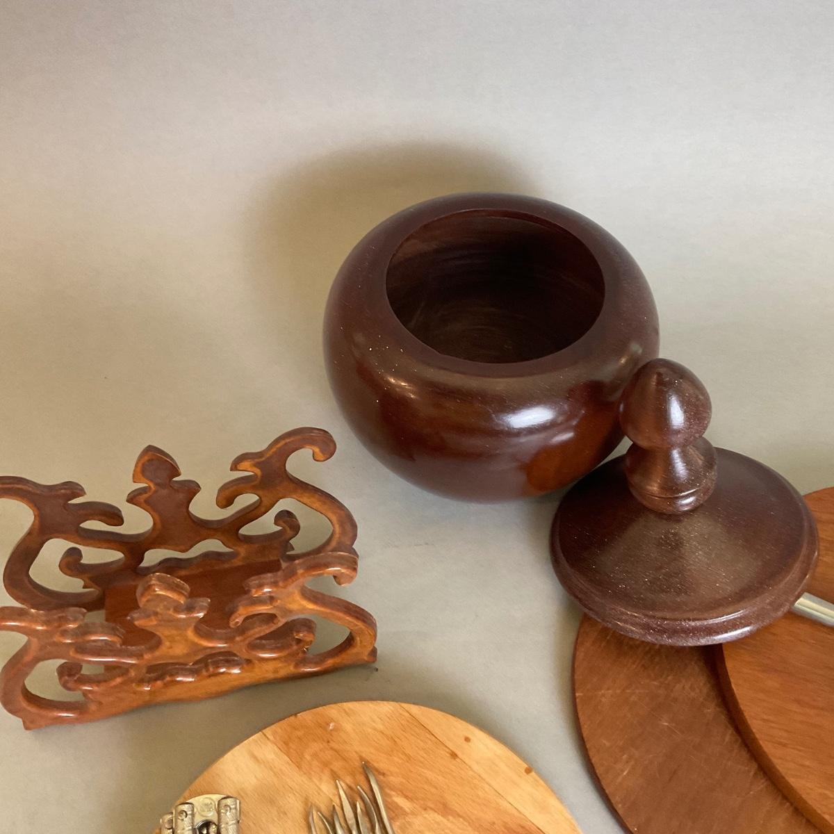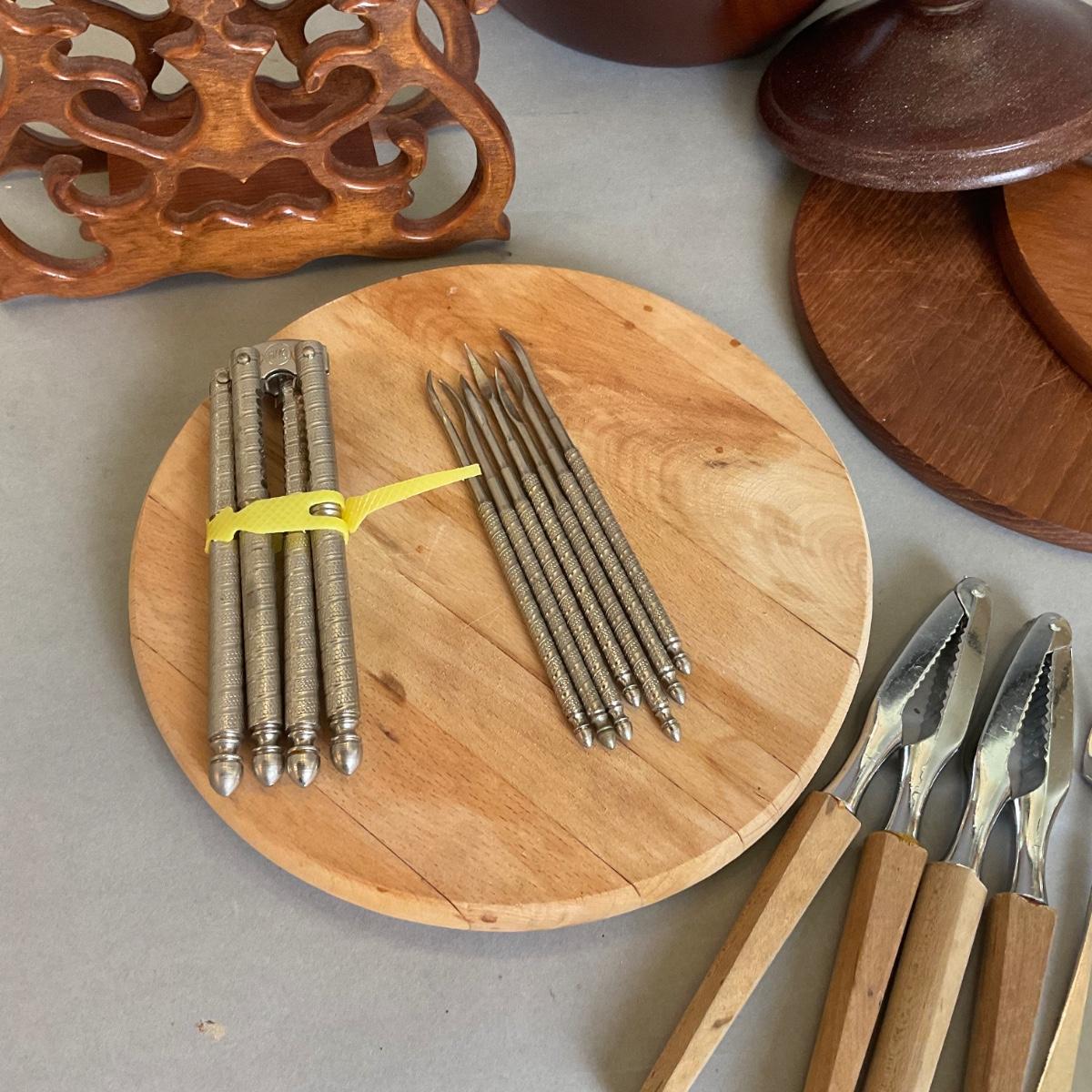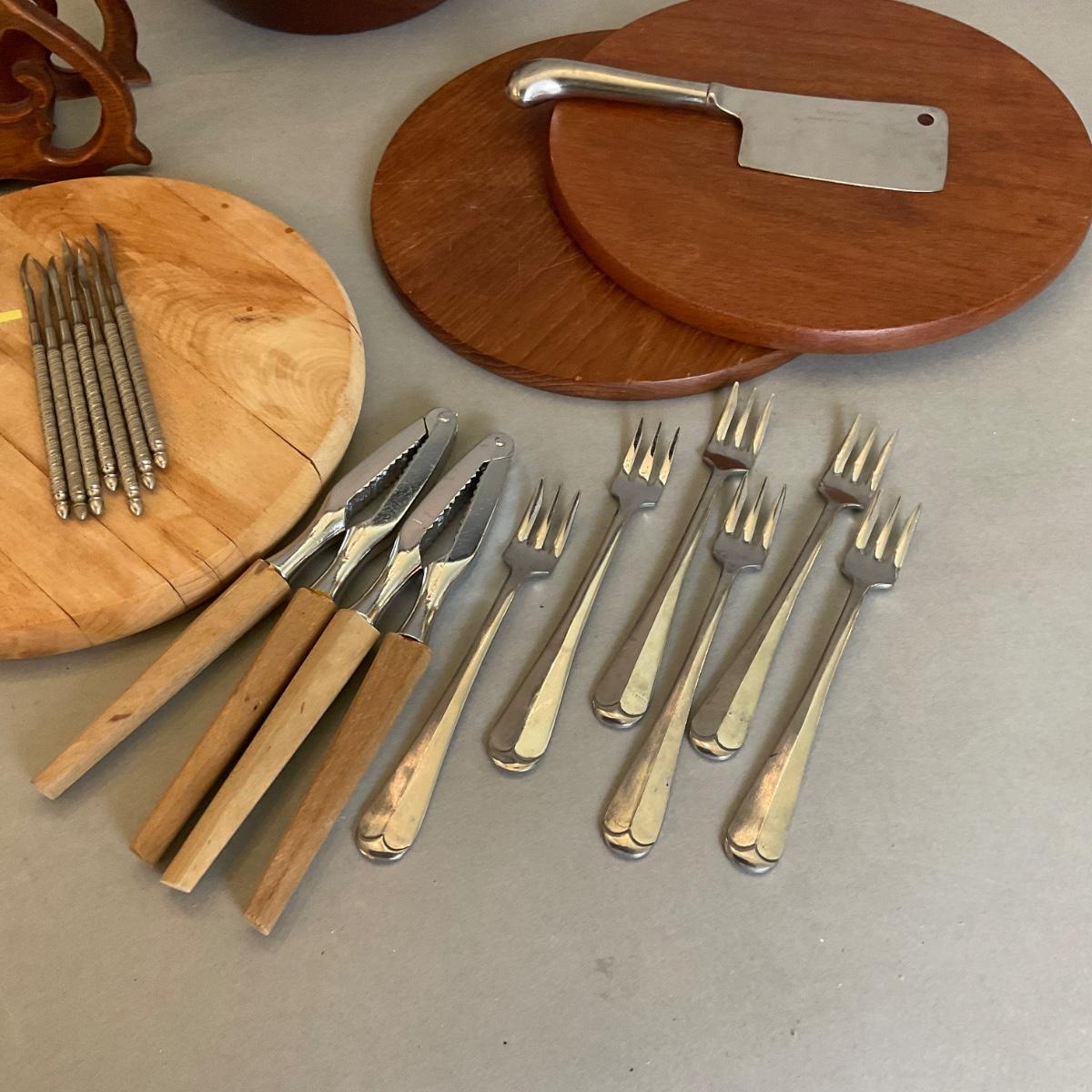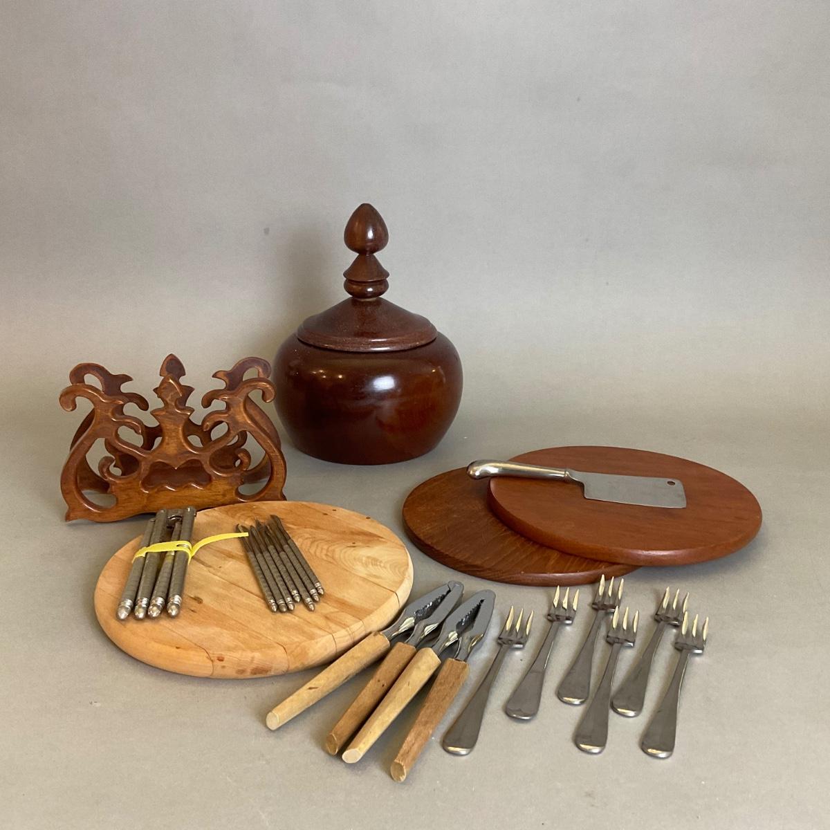 wooden napkin holder, covered wooden bowl, wooden trivets, cocktail forks, nut crackers and shell tools, with cutting board