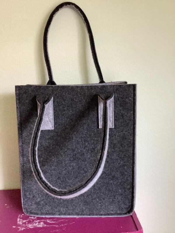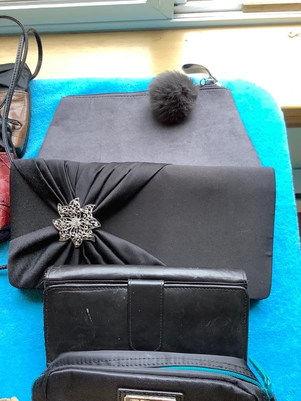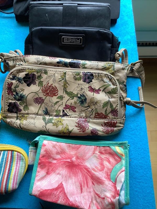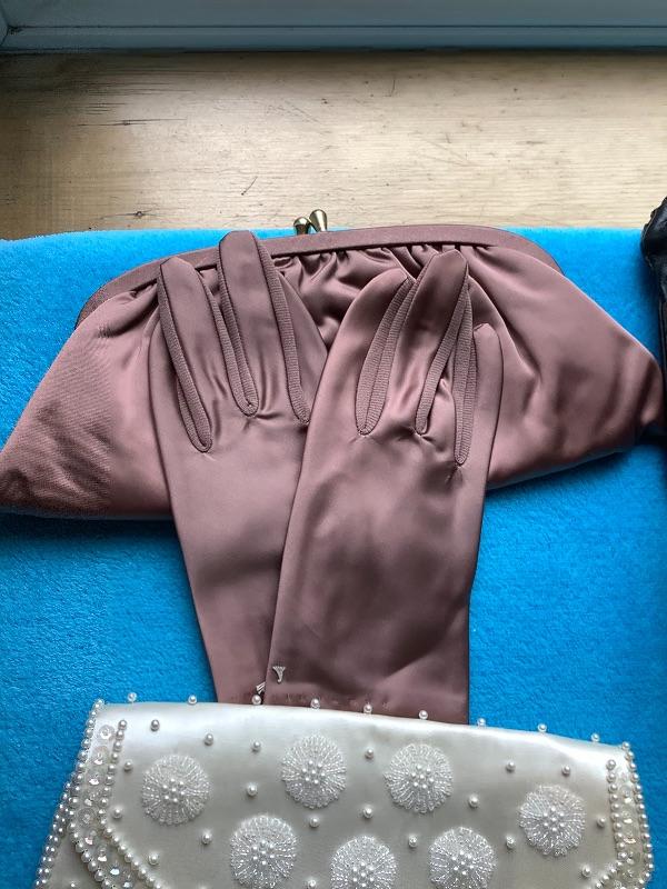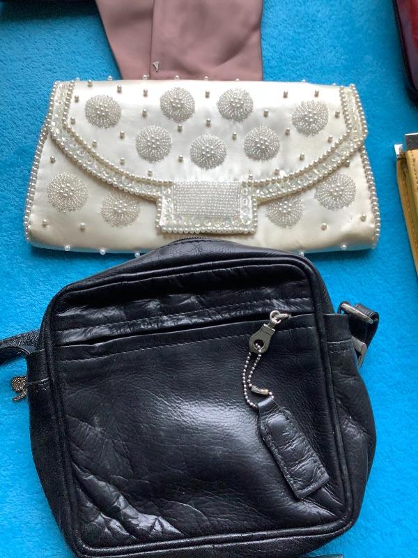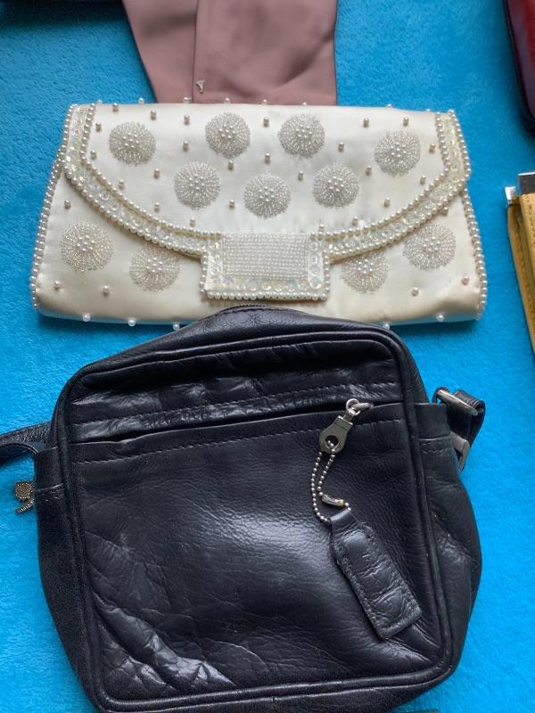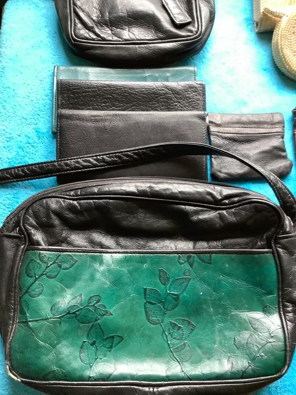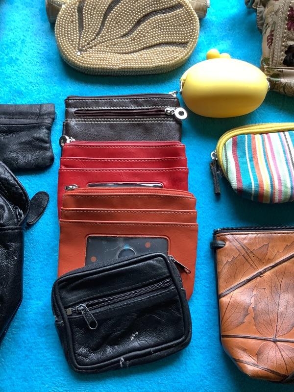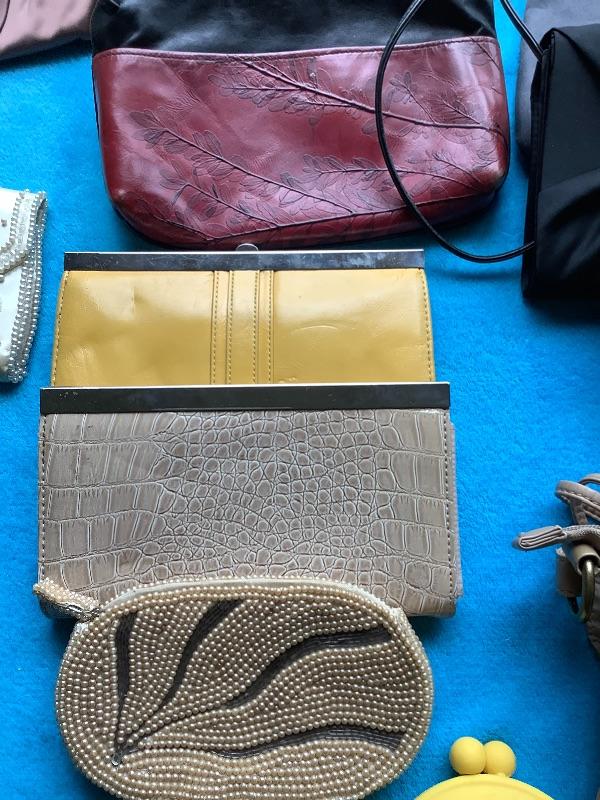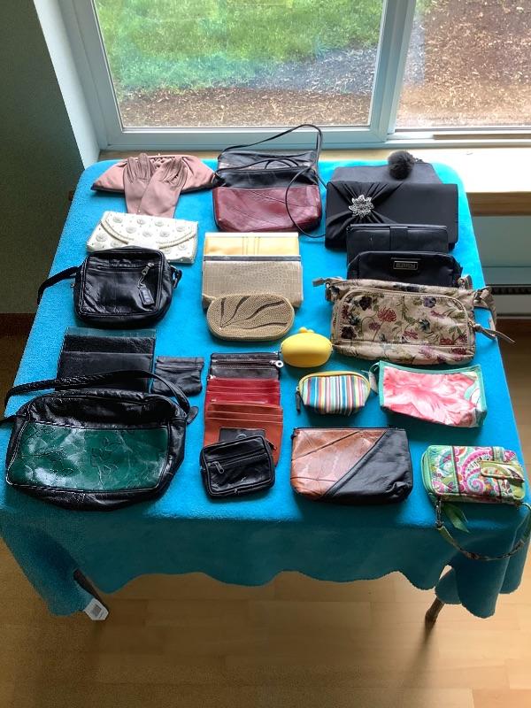 Large assortment of small purses, wallets, coin purses, checkbooks holders, and gloves all stored in a sturdy felt bag with handle