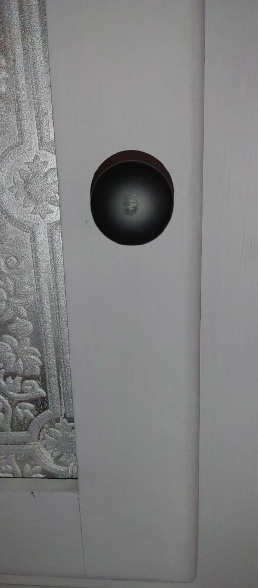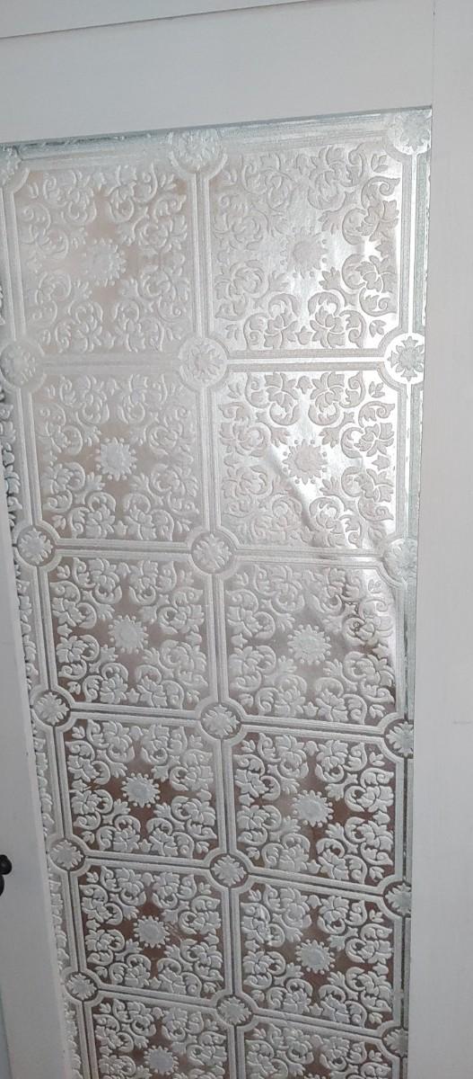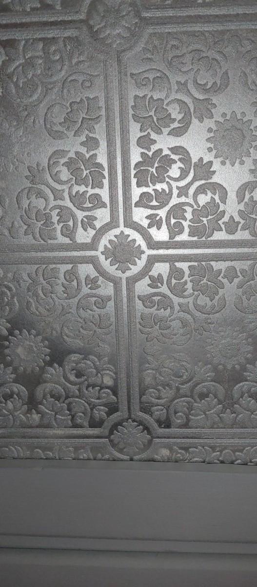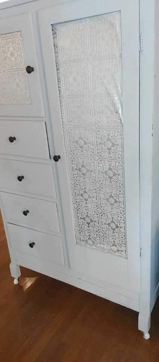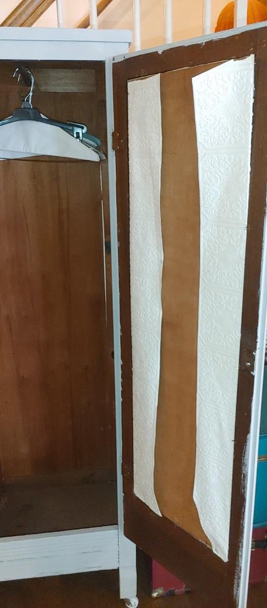 Beautiful antique mahogany chifferobe painted a very light grey with wallpaper decor where they mirrors use top be originally.