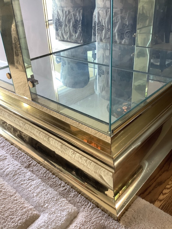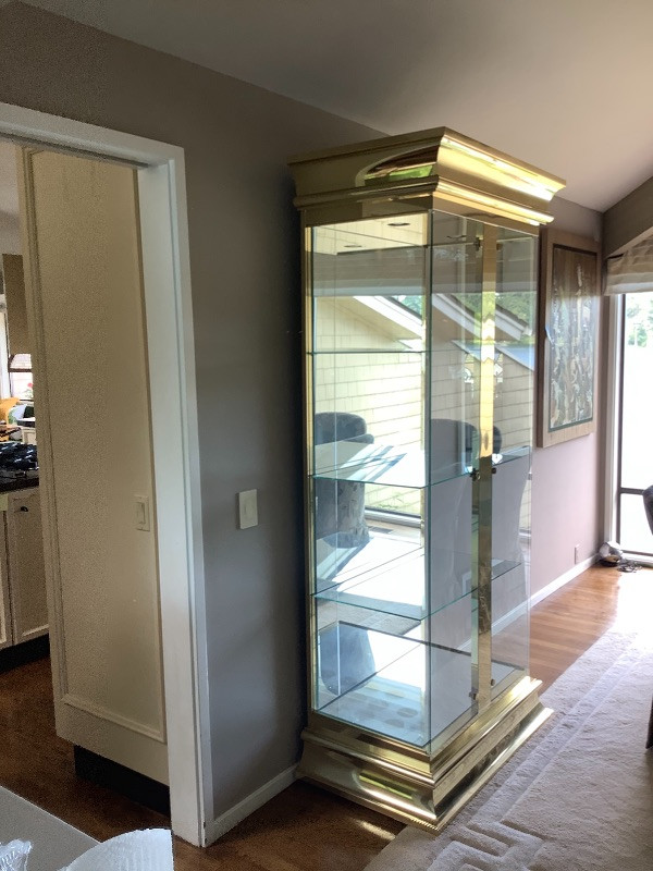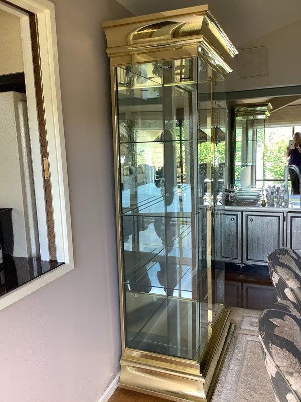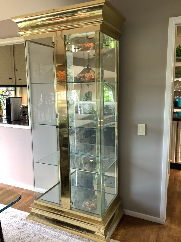 Gorgeous large lighted glass display cabinet with mirrored back measures 84” tall x 22” deep x 34” wide.