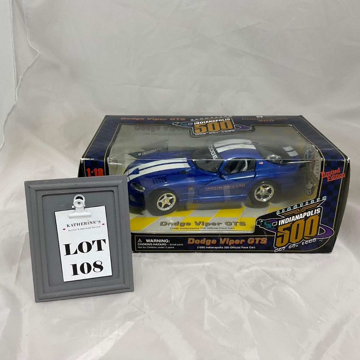 One NASCAR die cast 1:18 scale 1996 Indianapolis 500 Official pace car Dodge Viper GTS in box. Please see photos for details and condition. ::: Shipping is available on this lot. If you require shipping you must let us know at the close of the auction. We will coordinate with you after the item has been won. Shipping fees will include insurance up to or exceeding the value of all items being mailed. If you have any questions regarding this lot please contact the auctioneer either via this website, by direct email or by phone. PICK UP TIMES and other important information can be found in the TERMS and DESCRIPTION of the auction. Please take a look for pertinent information. Thanks!