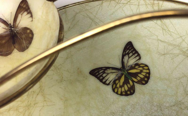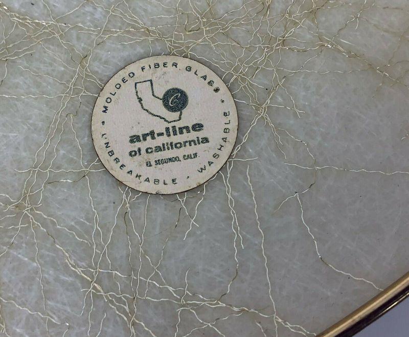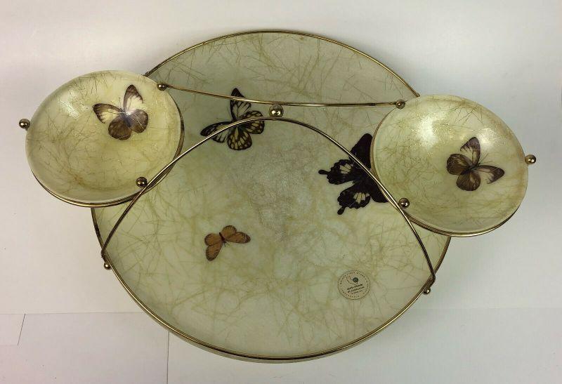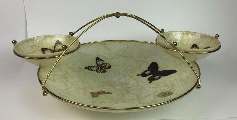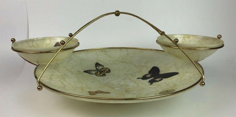From the Mid Century here is a three-tier molded fiber glass serving bowl and brass rack from art line of california...Measures approx 19" x 15" x 7.5"h...Unbreakable..Washable...Adorned with gold threads and butterflies...Unique vintage serving ware..offered with no reserve...