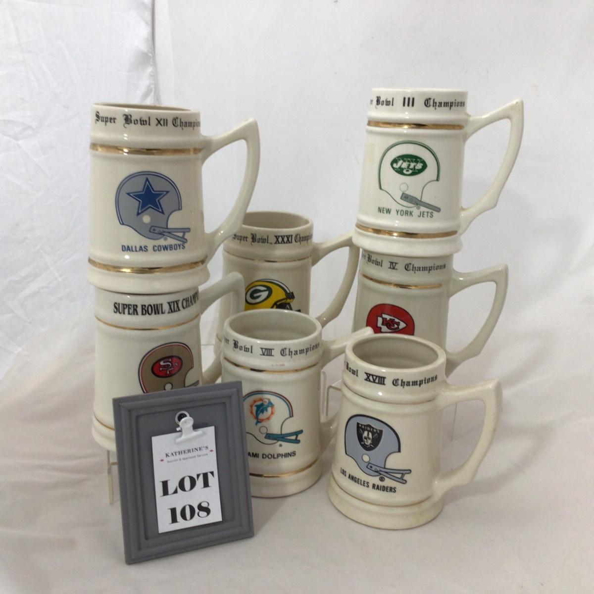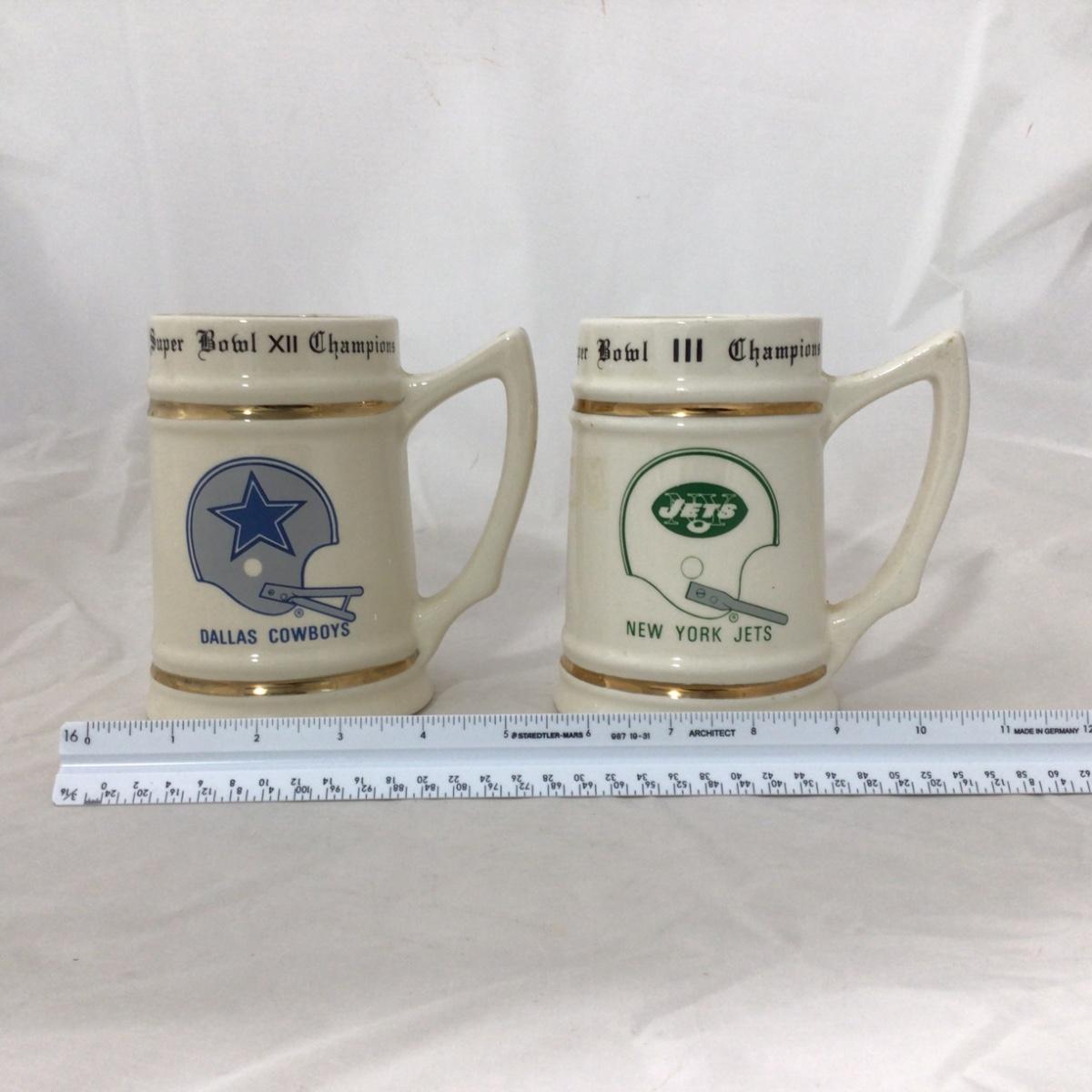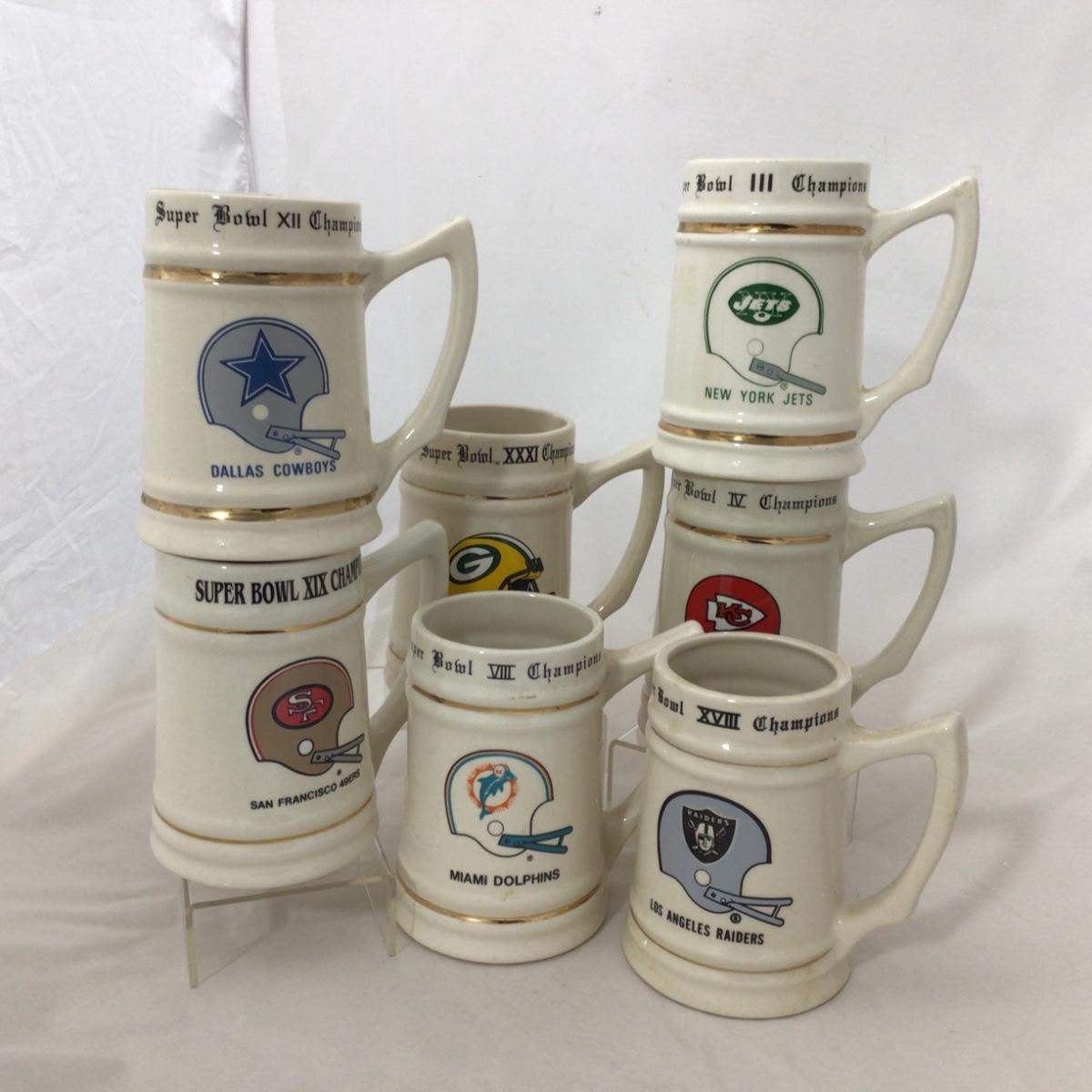 Seven total steins a Dolphins VIII, Chiefs IV, 49ers XIX, Cowboys XIII, Jetts III, Raiders XVIII, and a Packers XXXI stein. Please see photos for details and condition. ::: Shipping is available on this lot. If you require shipping you must let us know at the close of the auction. We will coordinate with you after the item has been won. Shipping fees will include insurance up to or exceeding the value of all items being mailed. If you have any questions regarding this lot please contact the auctioneer either via this website, by direct email or by phone. PICK UP TIMES and other important information can be found in the TERMS and DESCRIPTION of the auction. Please take a look for pertinent information. Thanks!
