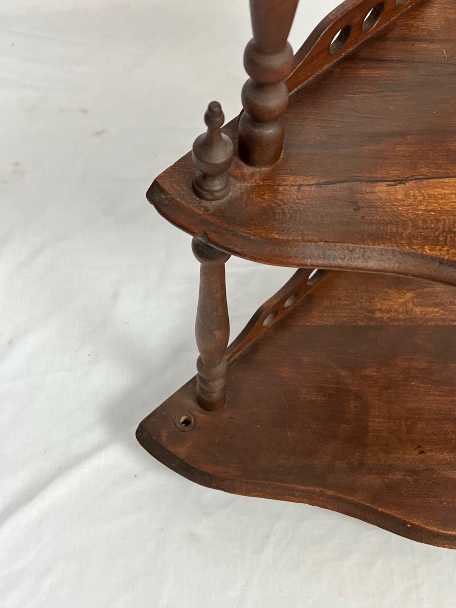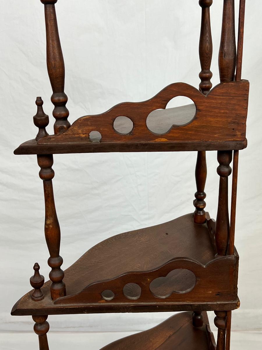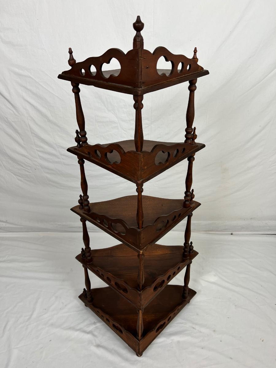 walnut 5 tier shelf with on finial missing on the bottom left