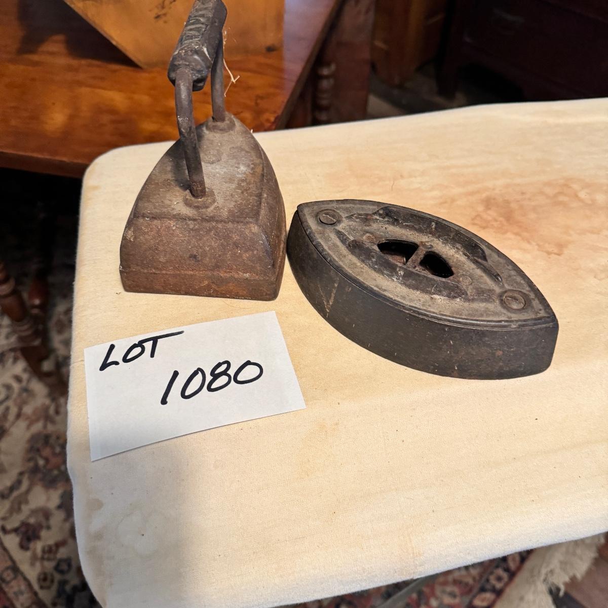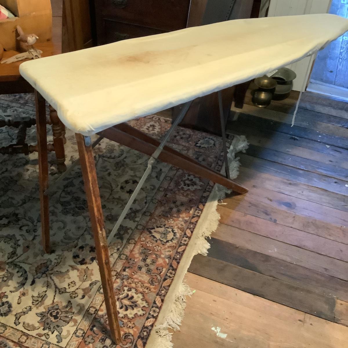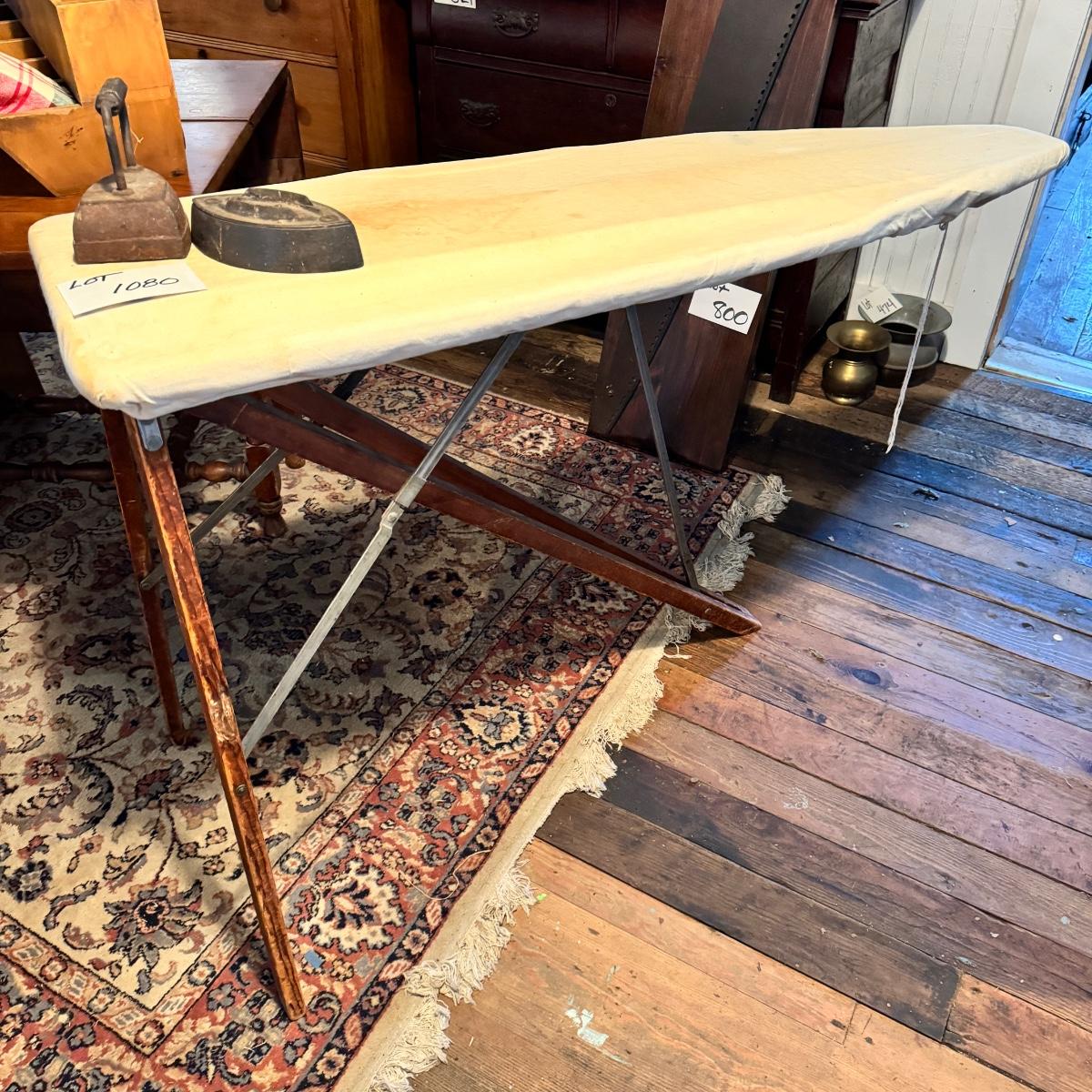 1080 Antique Wooden Ironing Board with Cover and Antique Cast Irons