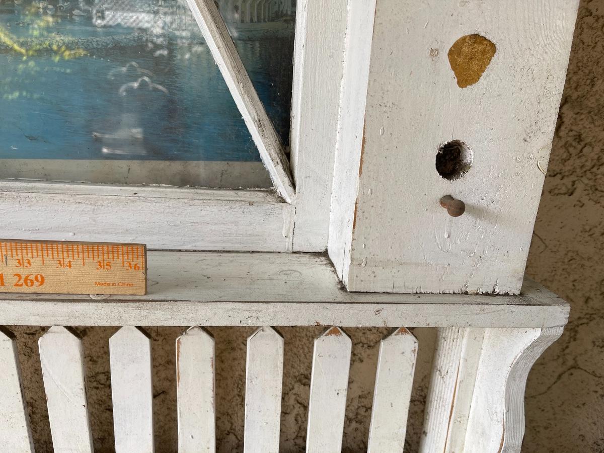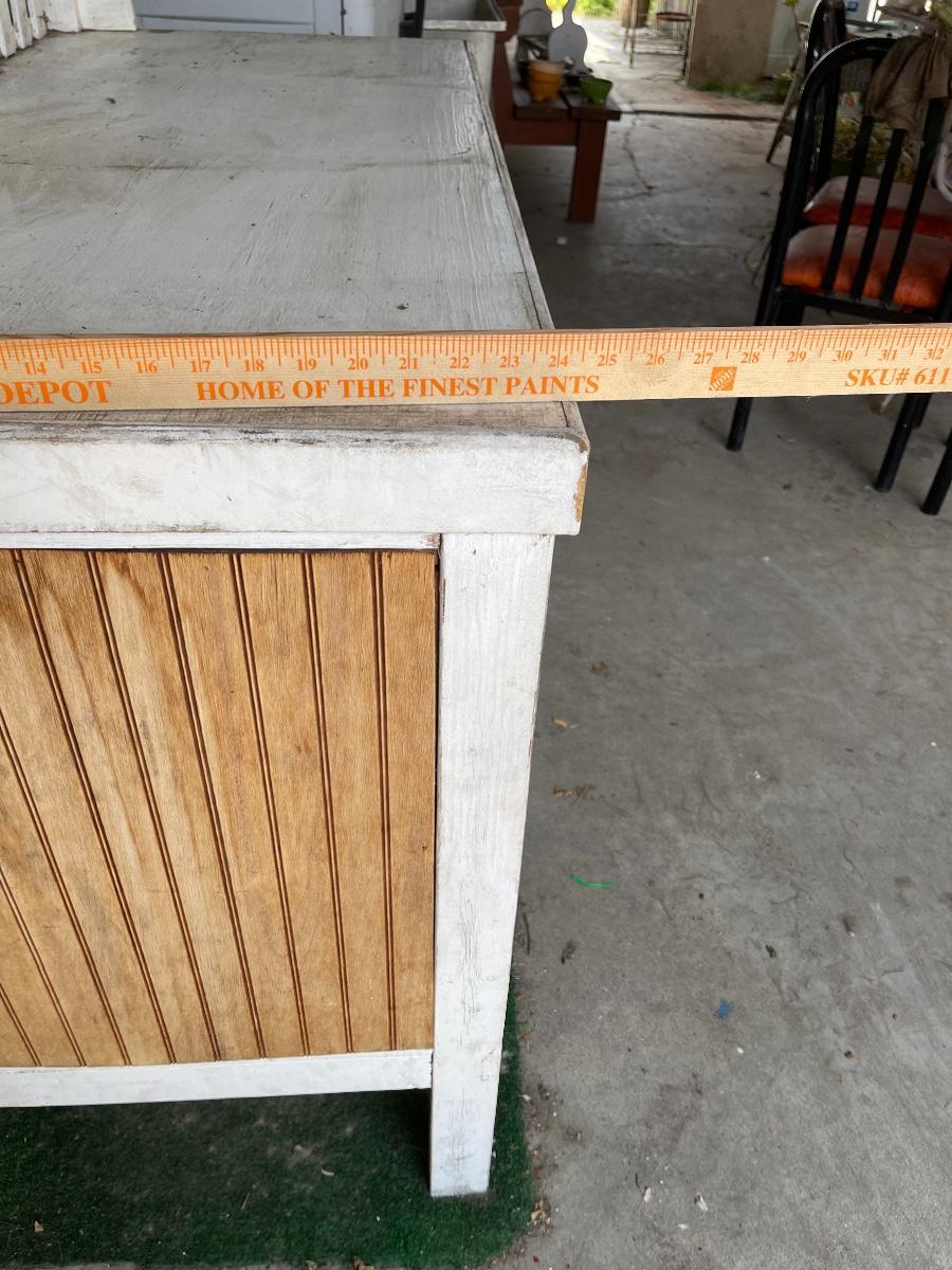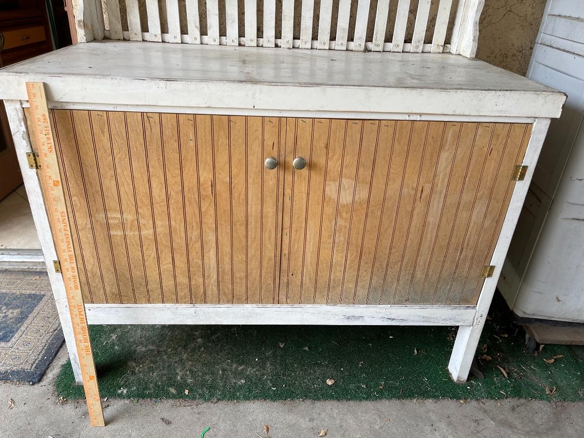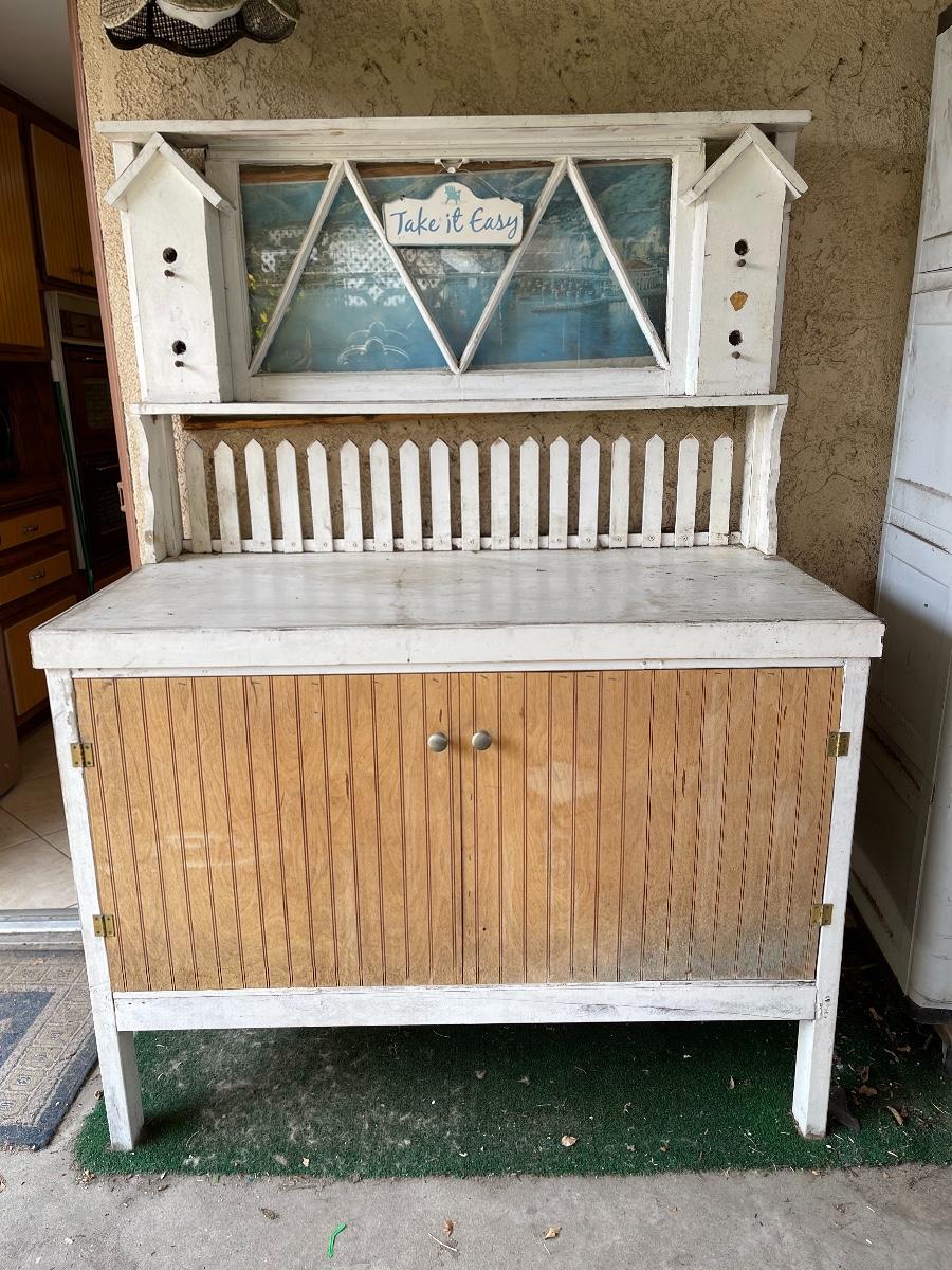 Cute country rustic cottagecore gardening table buffet. Cabinet storage. Some signs of age and weather from being outside. About 4' across.