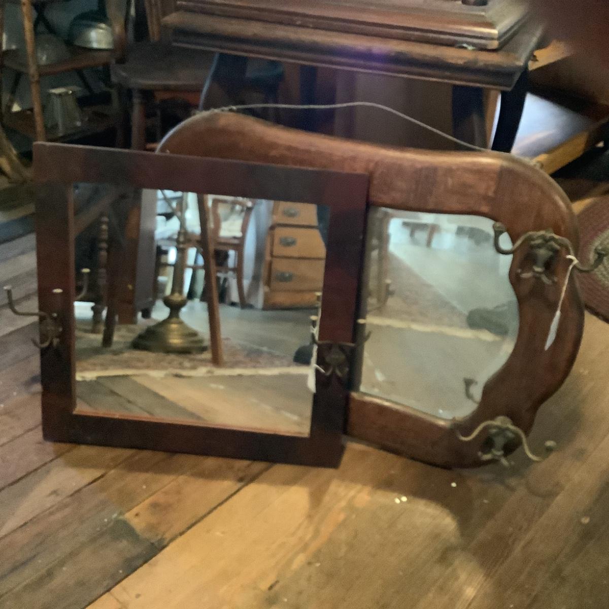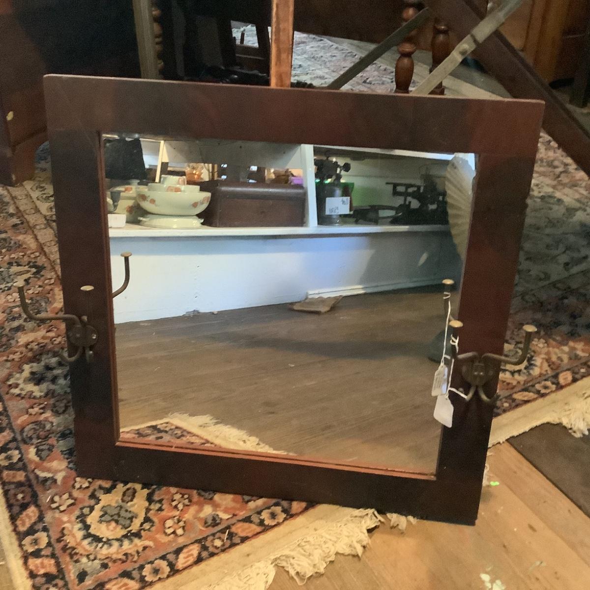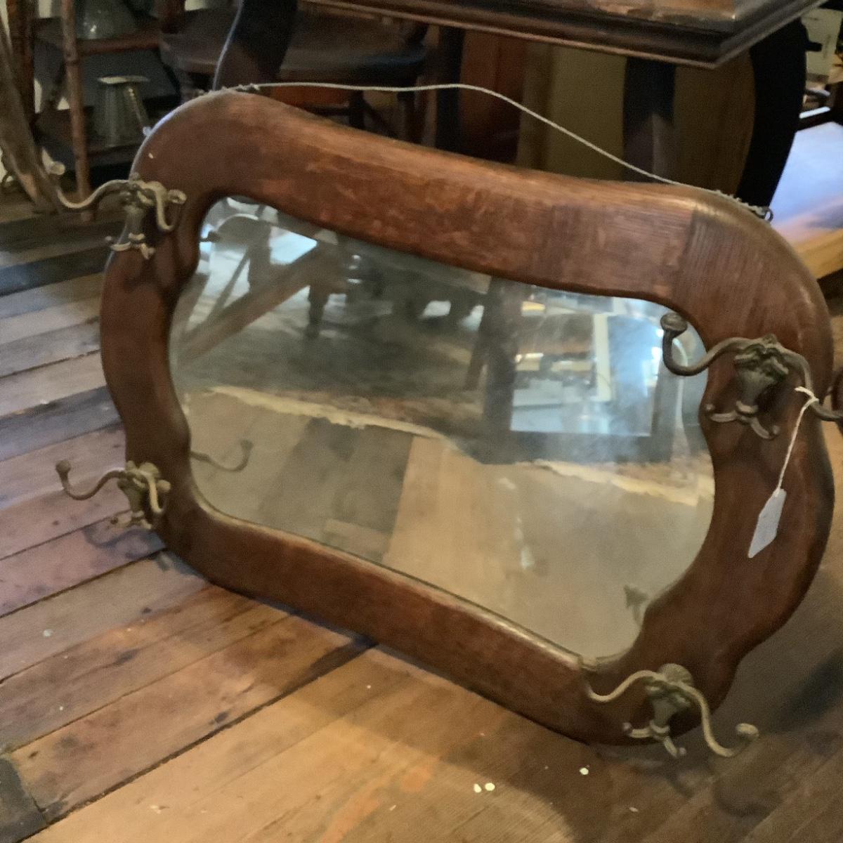 Rectangle has a beveled mirror and 4 sets of hat hooks
