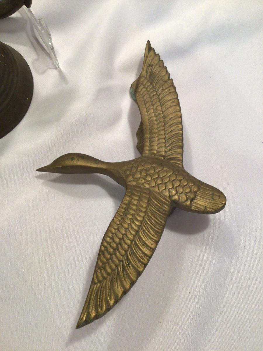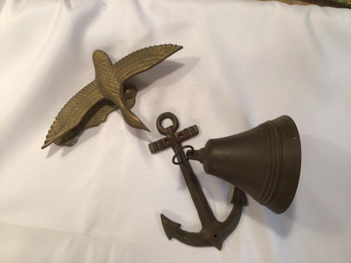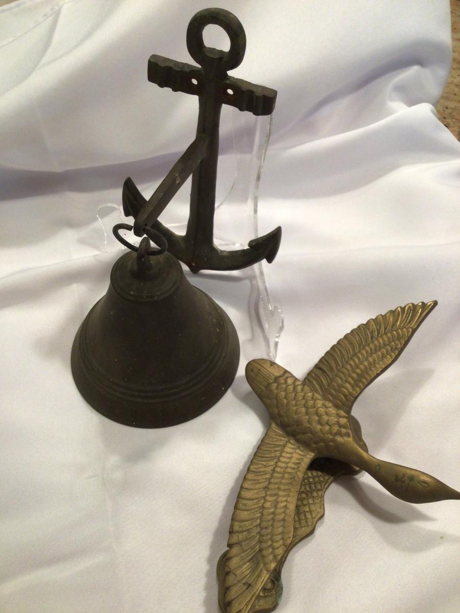 The brass goose is 10” wingspan, the bell is 9” tall.