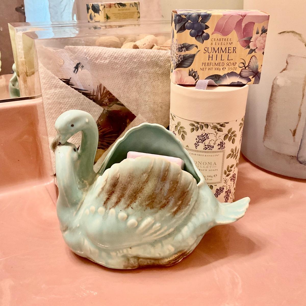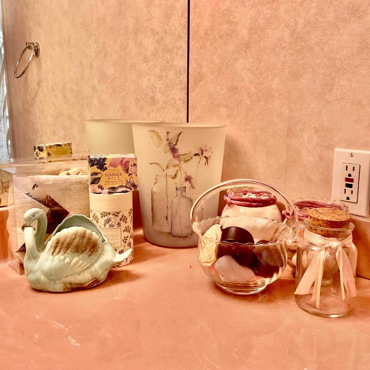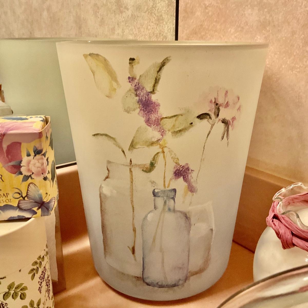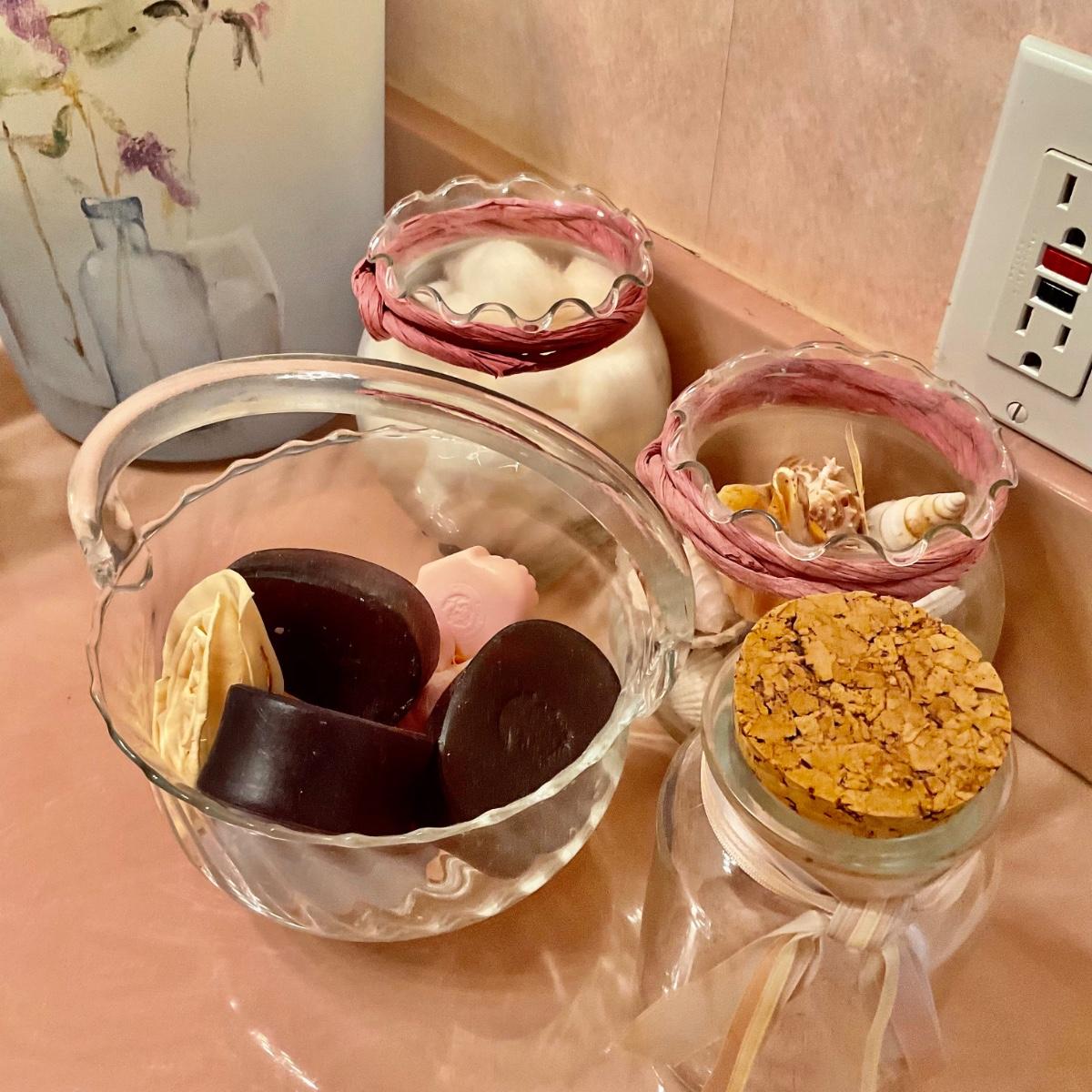 trash bin, glass basket with French soaps, yankee candle potpourri, glass accessories holders,