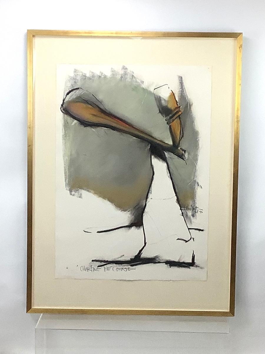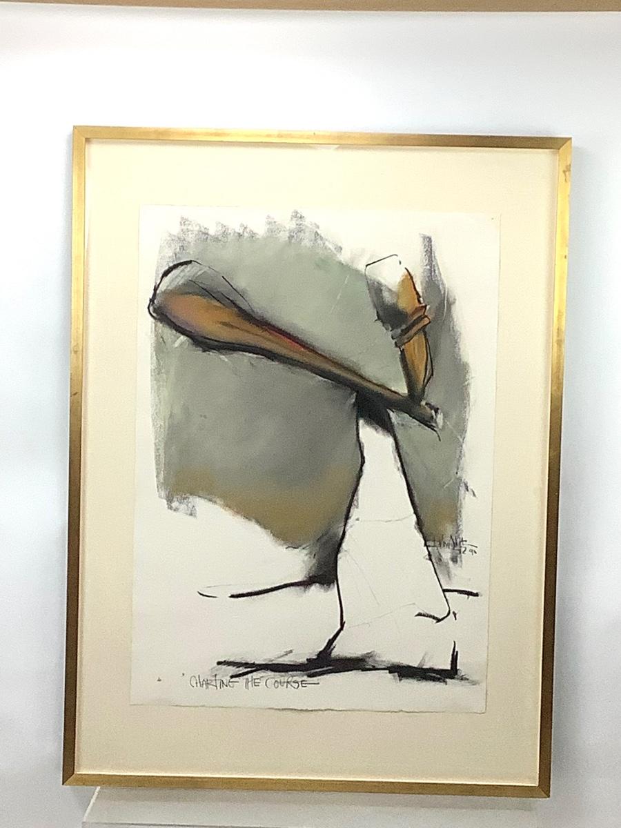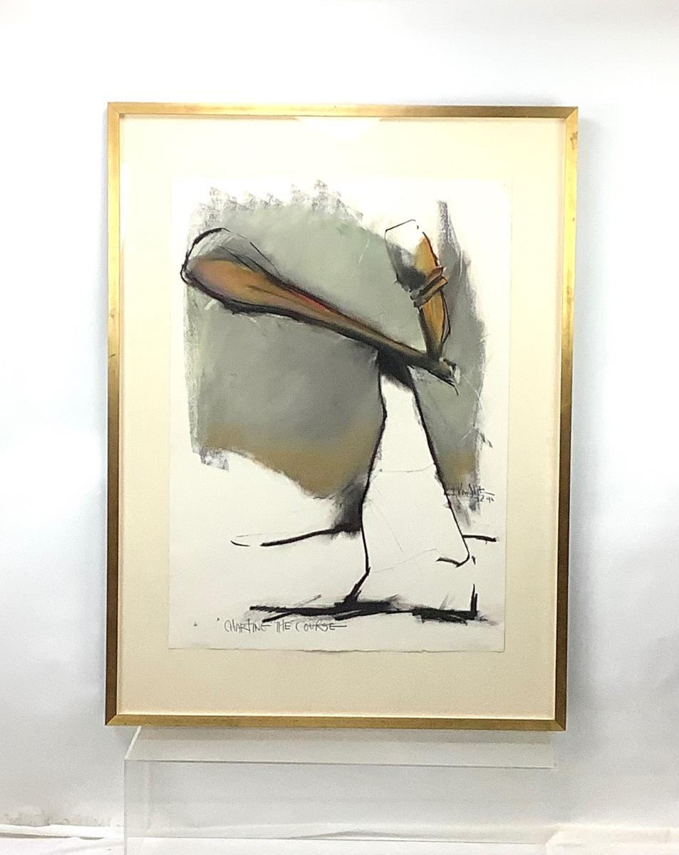 The original work of art is pastel and charcoal on paper, large statement piece measuring 54.5" high x 40.5" wide,framed abstract sailing art dated 1990 by John Van Alstine. The artist born in 1952, an American contemporary art sculptor, former assistant professor of fine arts at the University of Wyoming and the University of Maryland. His work is displayed in various museums around the world.