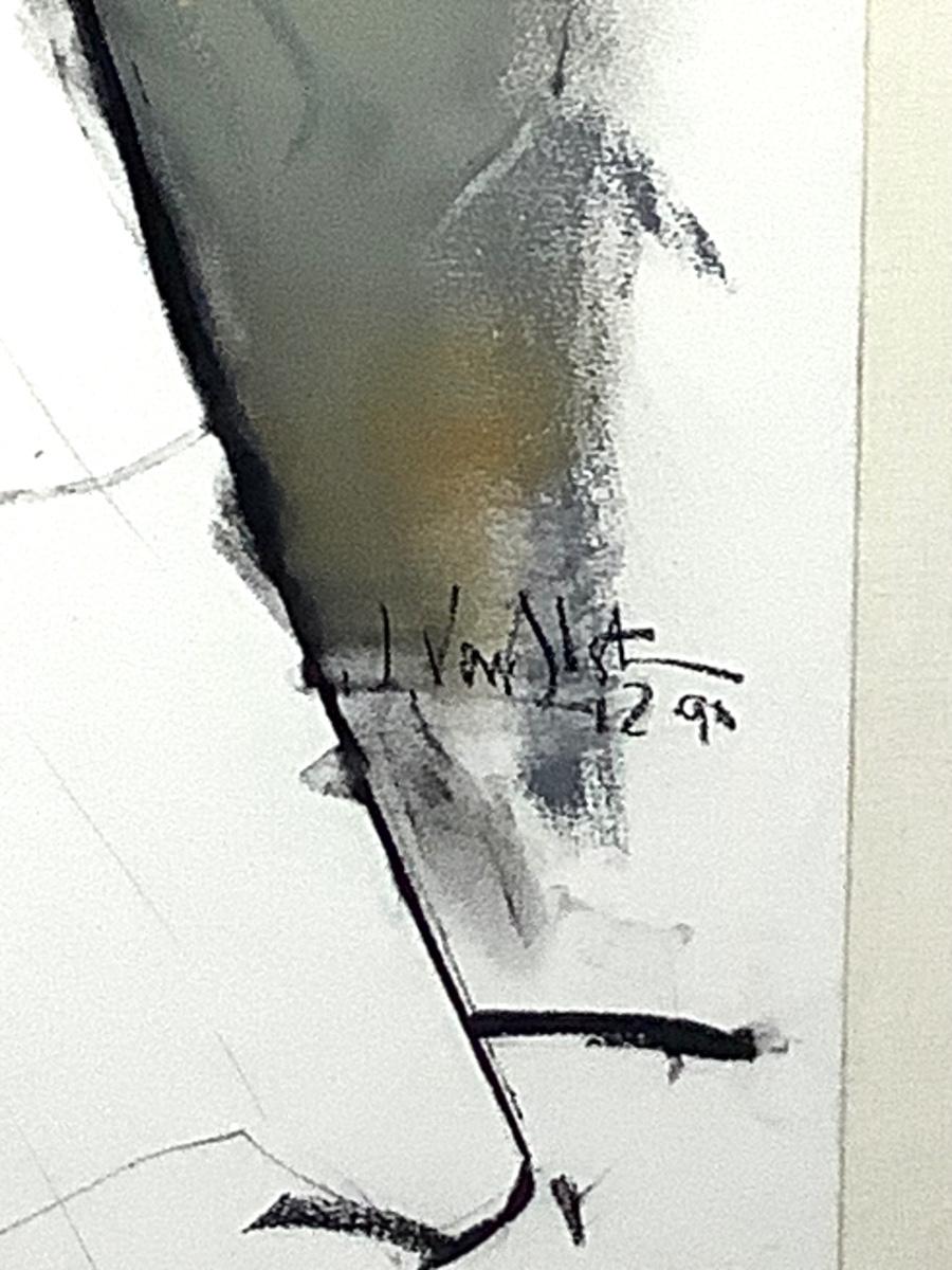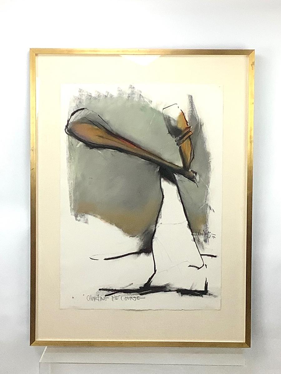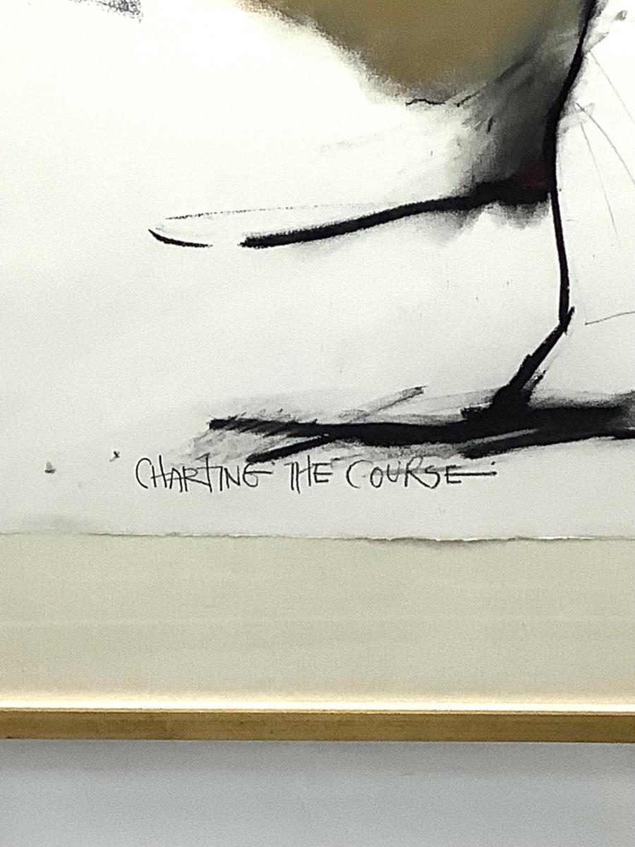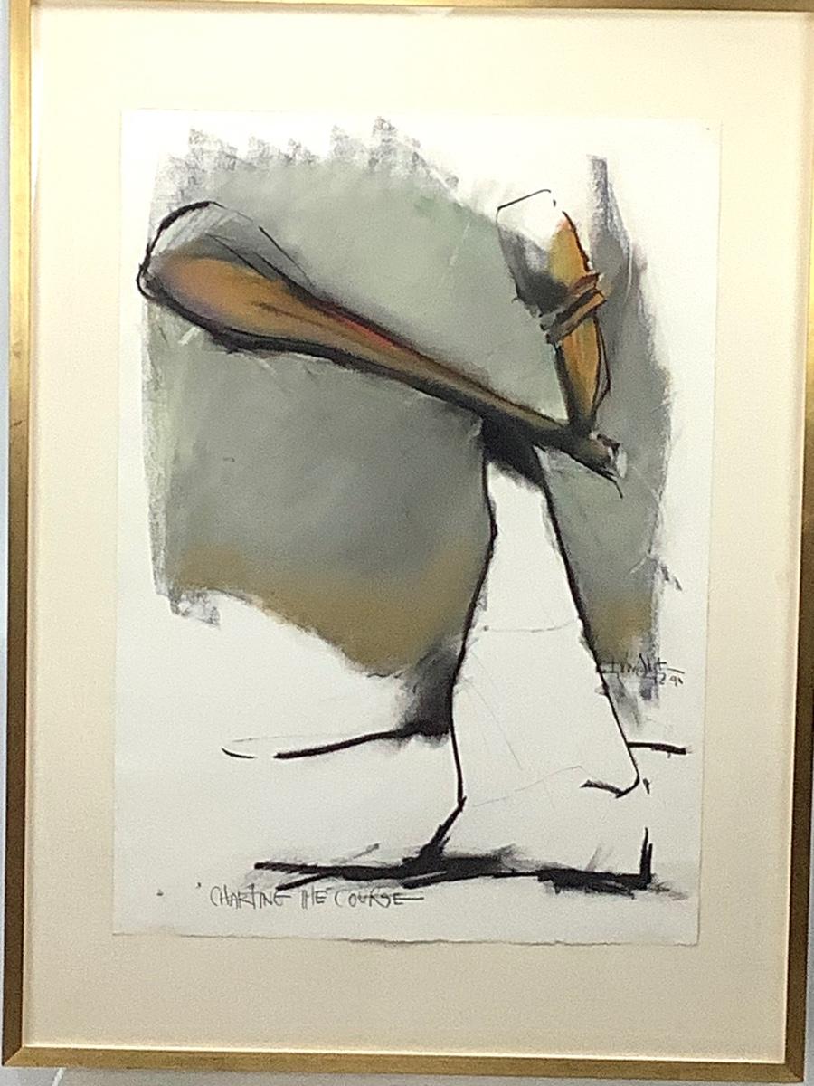 The original work of art is pastel and charcoal on paper, large statement piece measuring 54.5" high x 40.5" wide,framed abstract sailing art dated 1990 by John Van Alstine. The artist born in 1952, an American contemporary art sculptor, former assistant professor of fine arts at the University of Wyoming and the University of Maryland. His work is displayed in various museums around the world.
