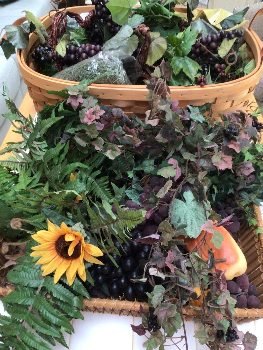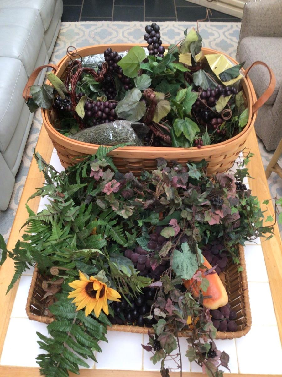 The garland’s are 5’ in length. There are 2 baskets of assorted greens.