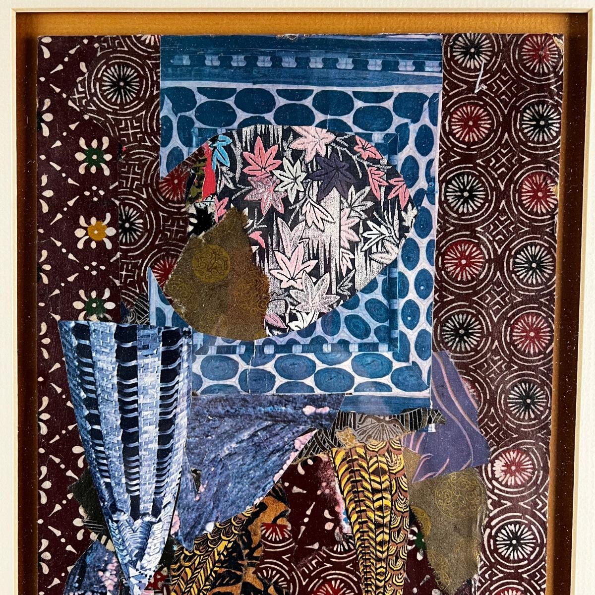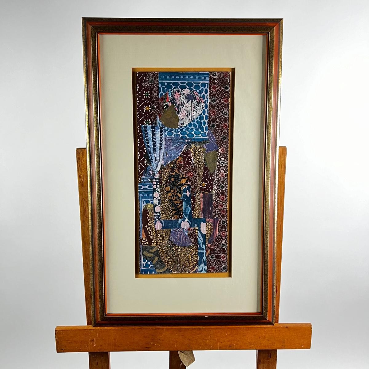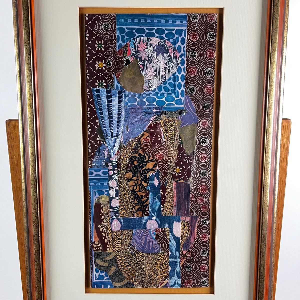 Art is framed and matted with a floating style. Collage inside measures 17.75”H x 8”W and the frame is measuring 27.5”H x 17”W
