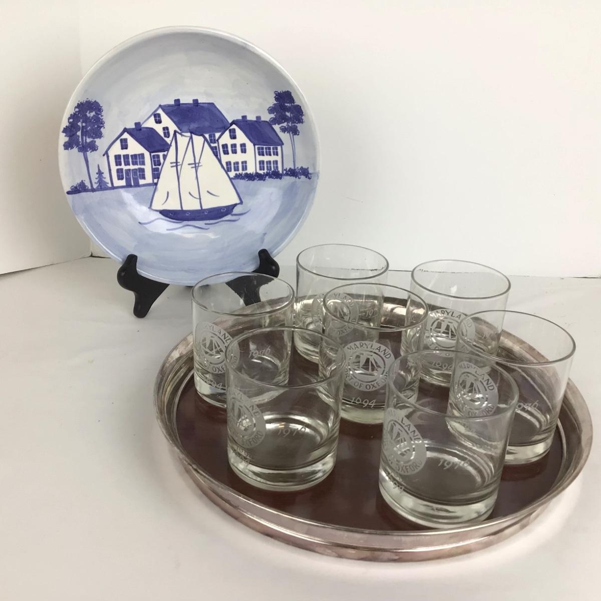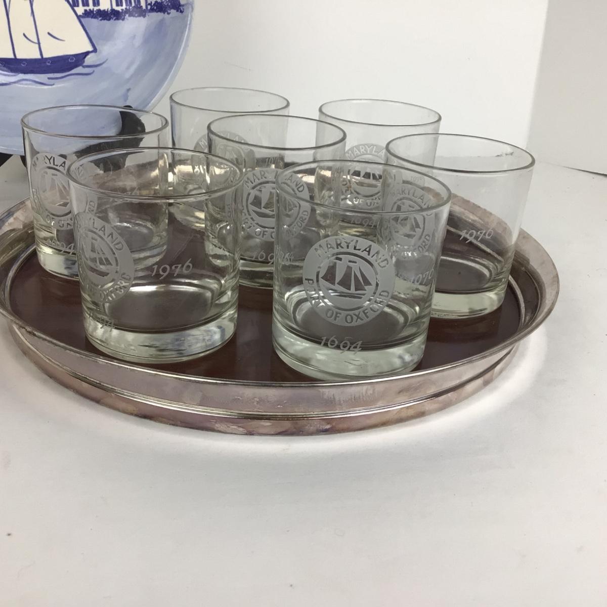 There are 7 Port of Oxford “Rocks” style glasses with serving tray and Dover Shard Pottery Sailboat Bowl is 9.5” in diameter.