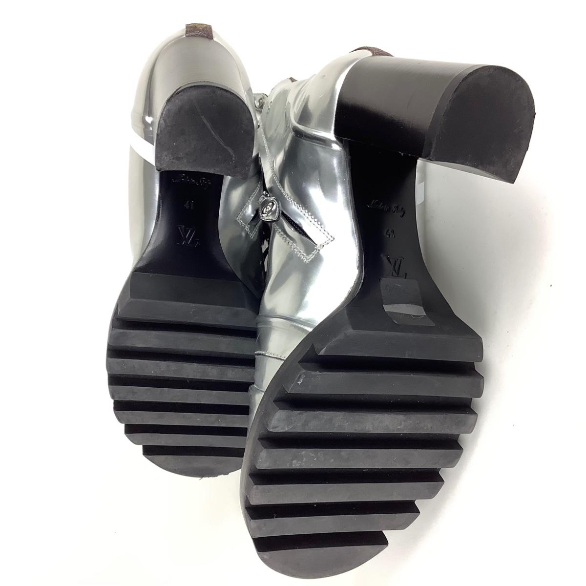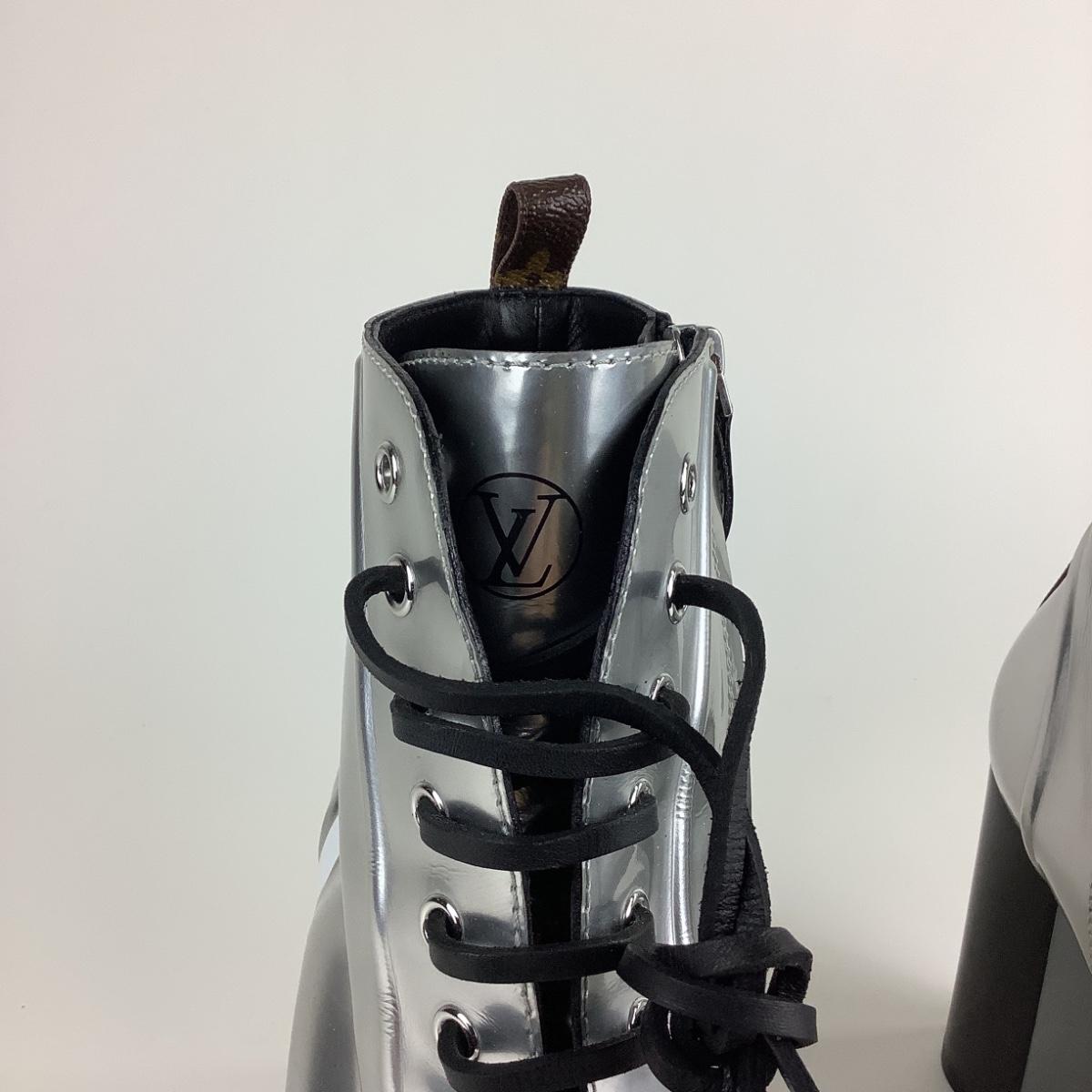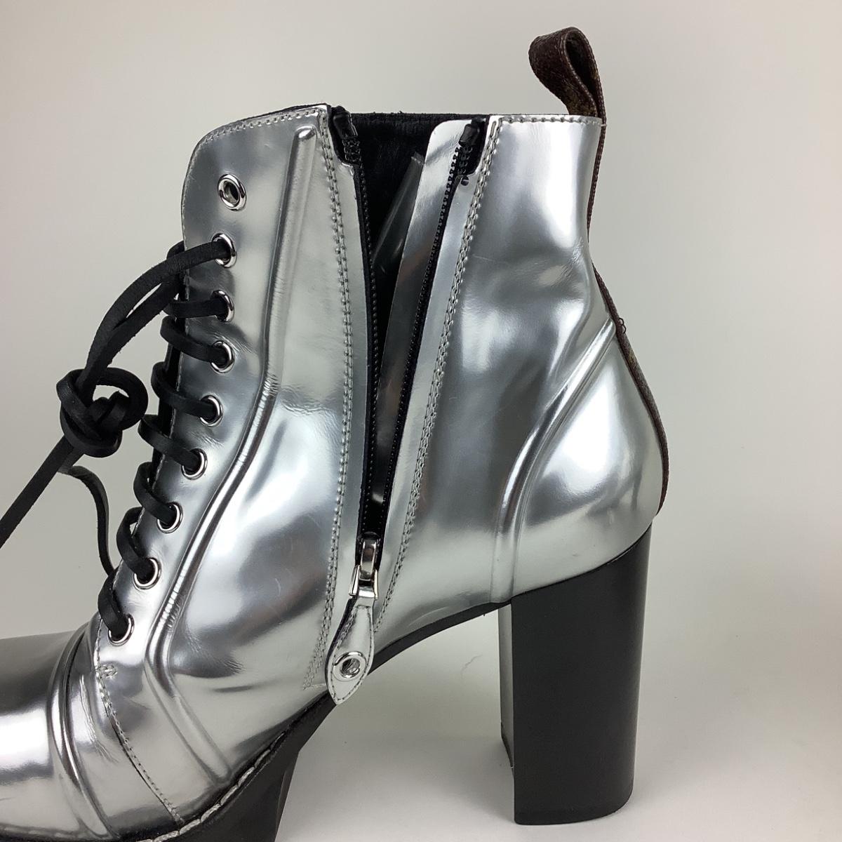 Louis Vuitton boots with silver patent leather and leather laces, made in Italy.