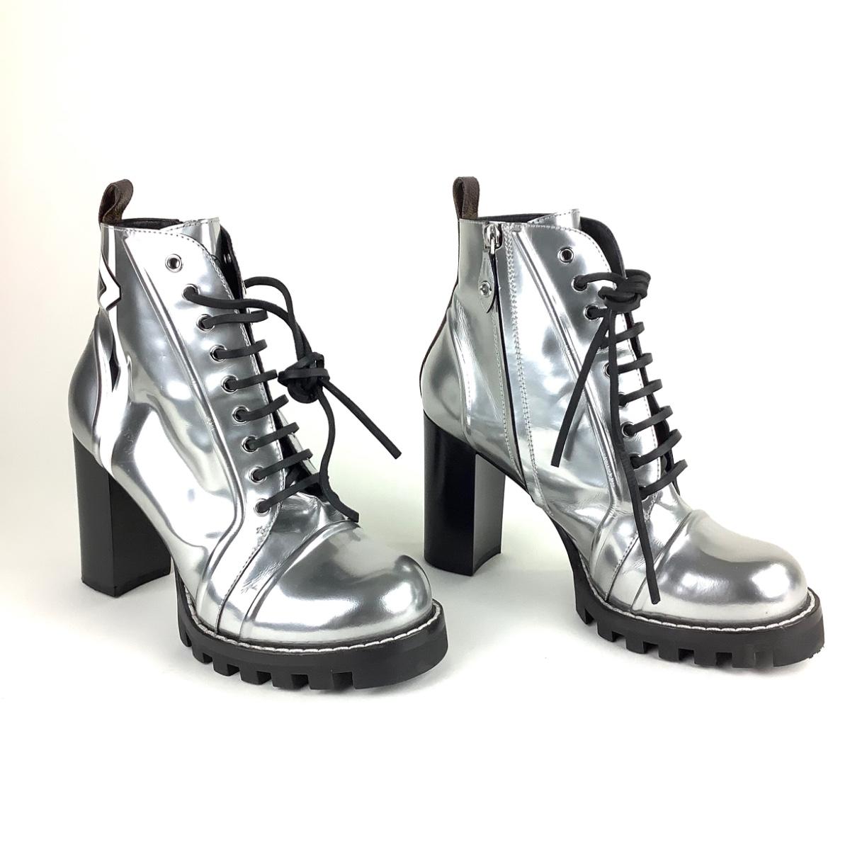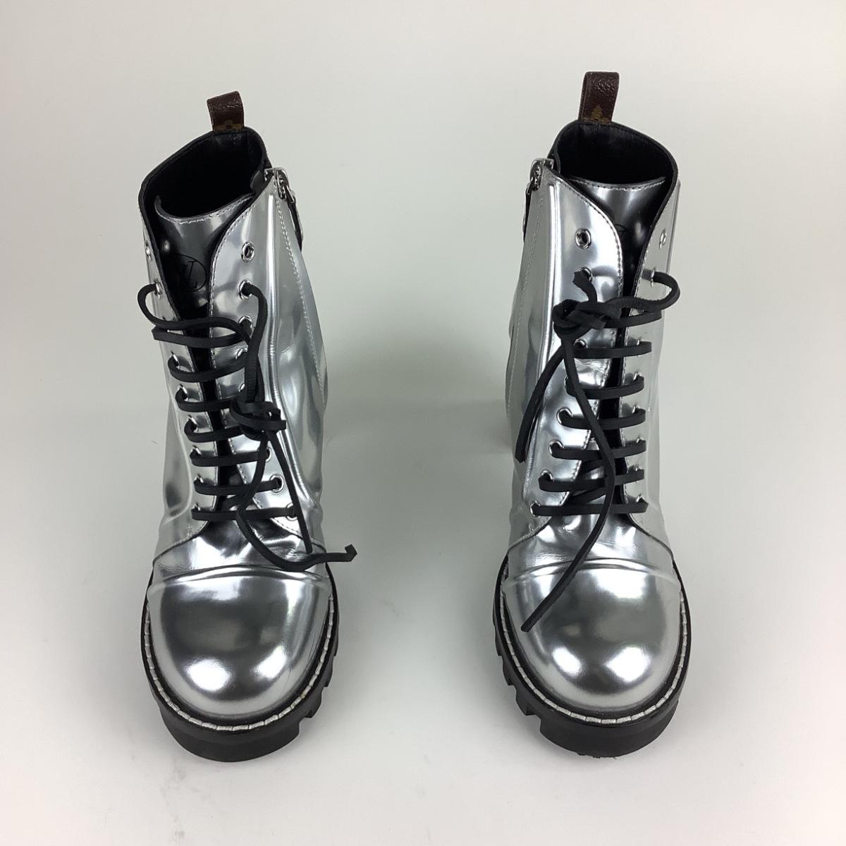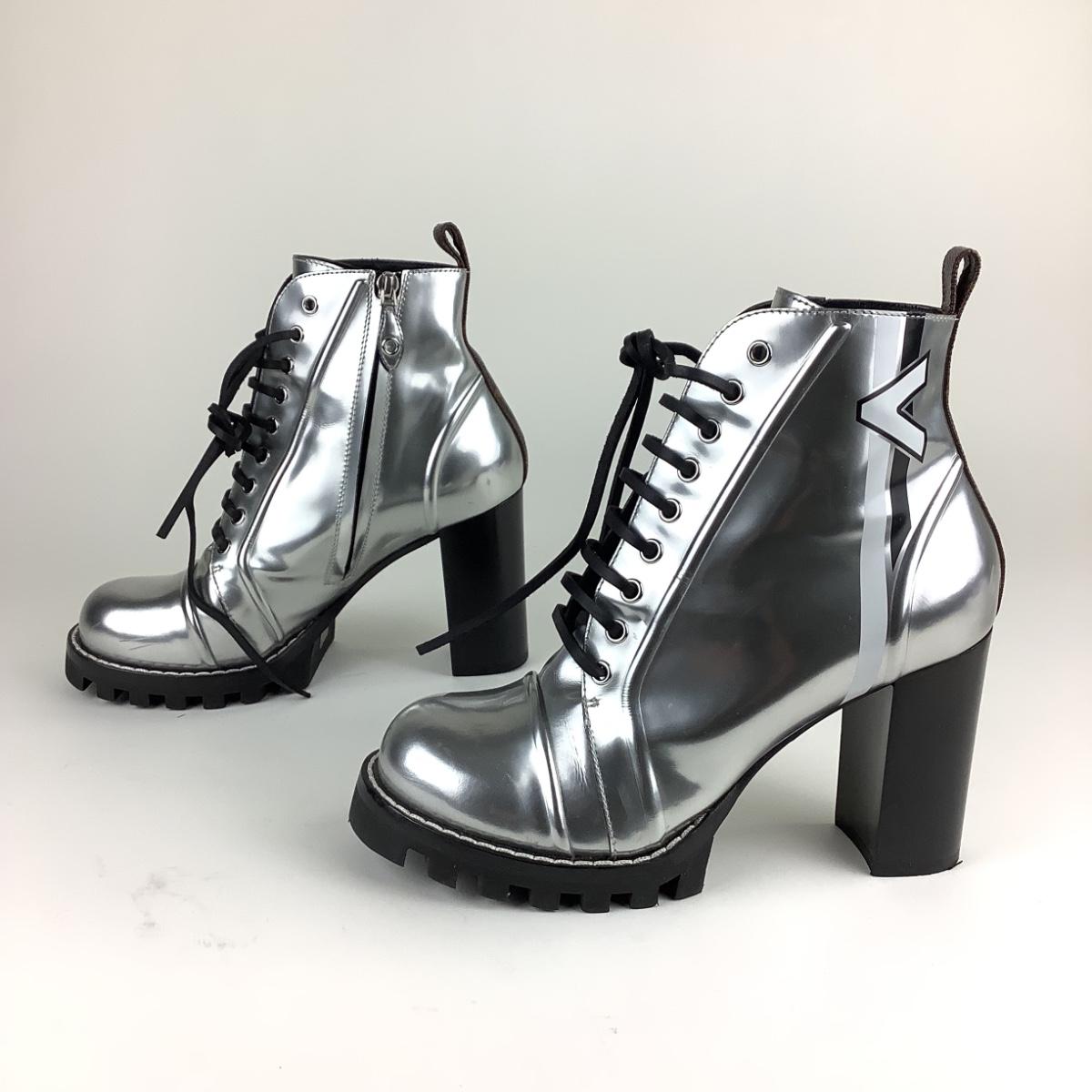 Louis Vuitton boots with silver patent leather and leather laces, made in Italy.