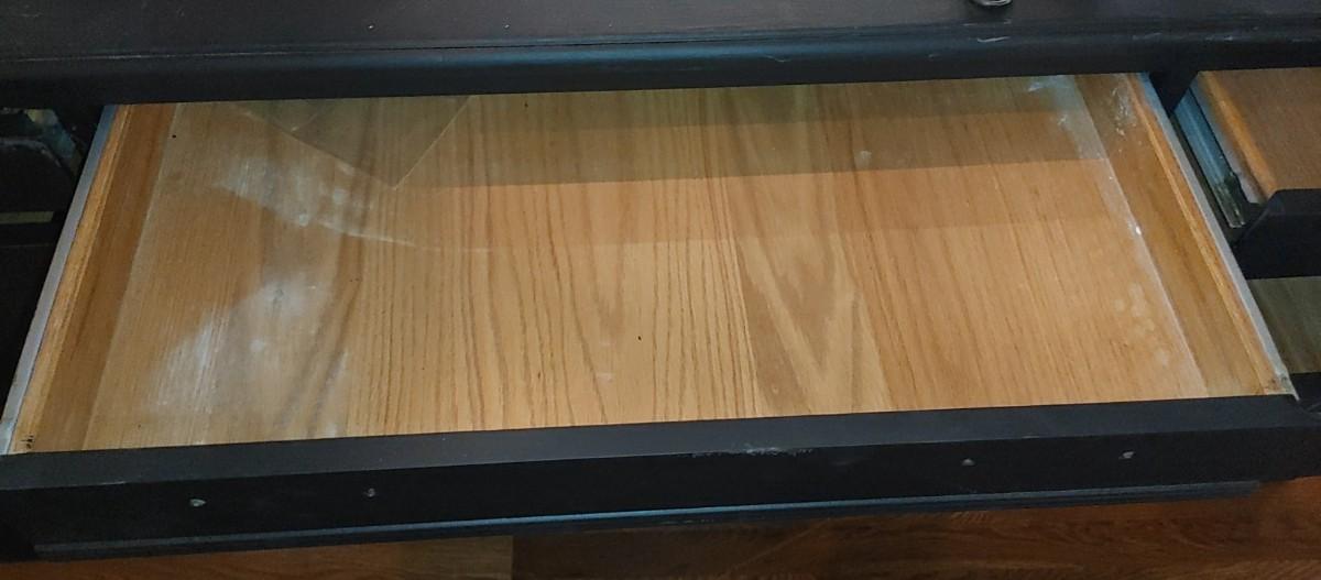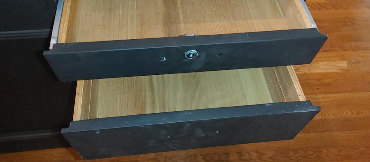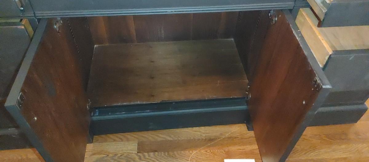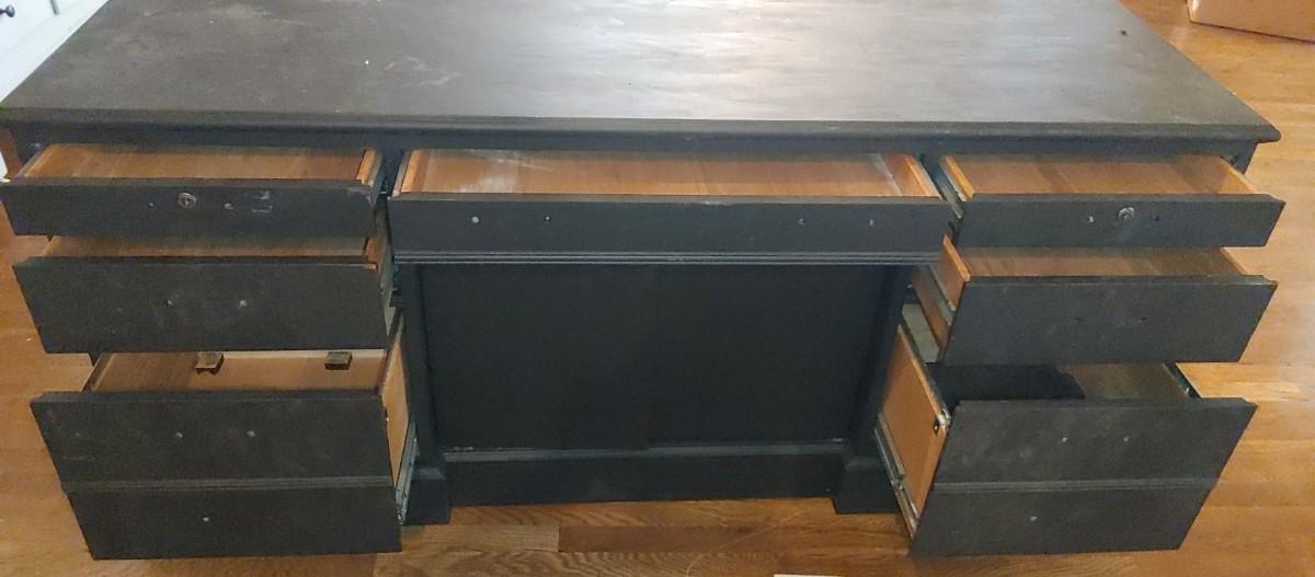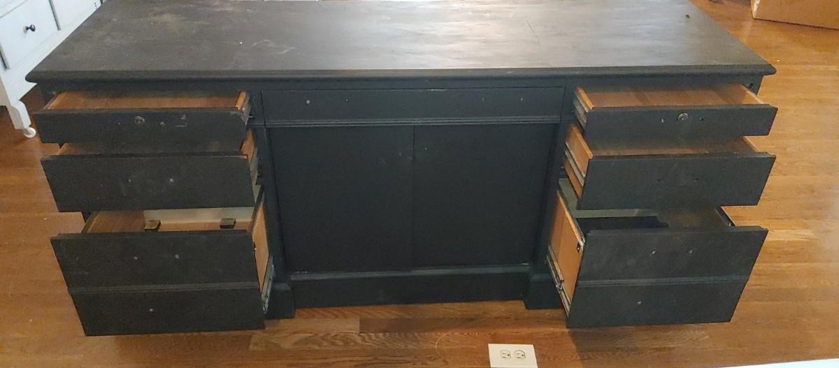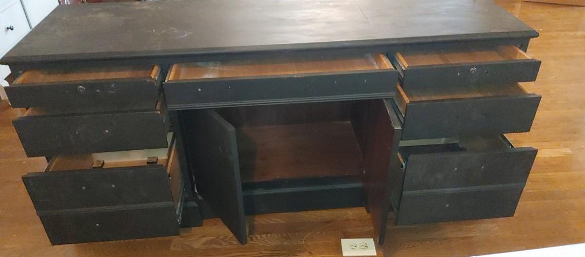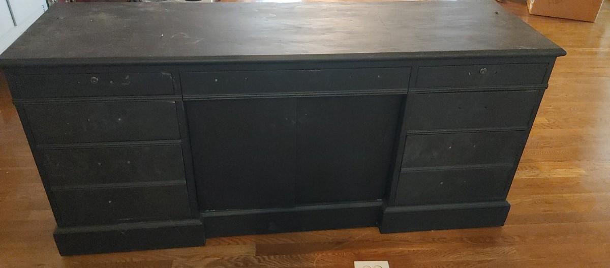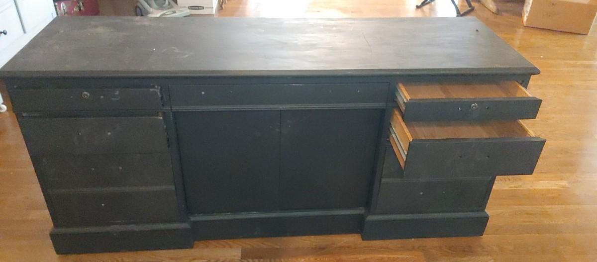 Solid oak black credenza with seven drawers is "extremely heavy" repurposed in Black looks great. This came from a bank in Atlanta many years ago. It needs all hardware. ( knobs drawer handles) very high quality drawers slide easily! Please Bring "Hercules" help for loading!