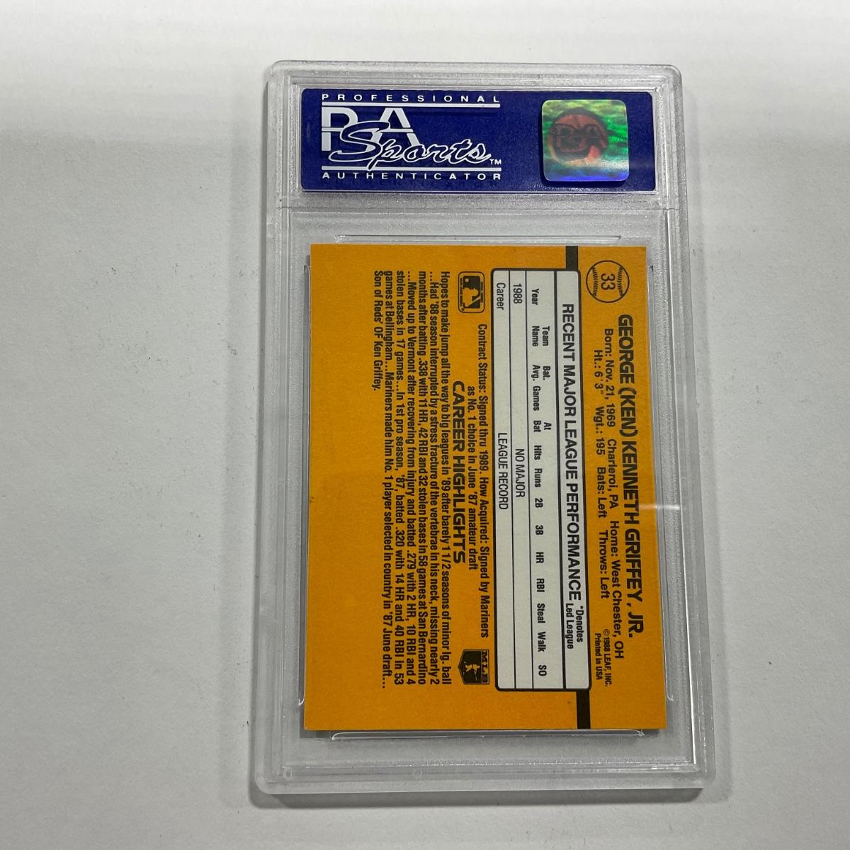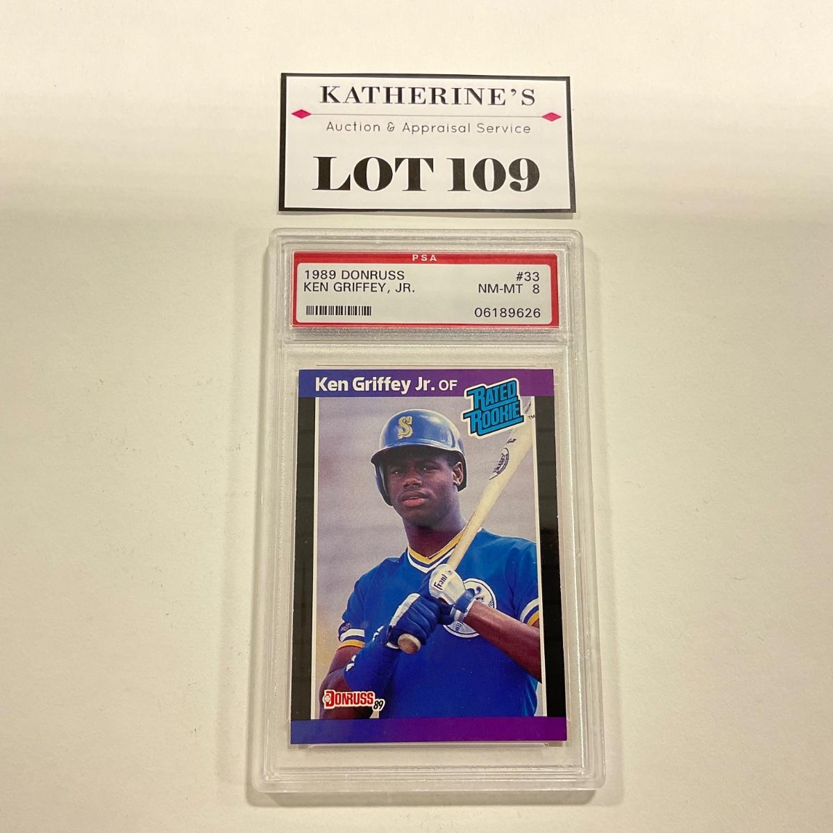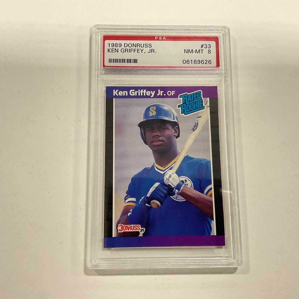 One graded 1989 Donruss Ken Griffey Jr. #33 NM-MT 8 card. Please see photos for details and condition. ::: Shipping is available on this lot. If you require shipping you must let us know at the close of the auction. We will coordinate with you after the item has been won. Shipping fees will include insurance up to or exceeding the value of all items being mailed. If you have any questions regarding this lot please contact the auctioneer either via this website, by direct email or by phone. PICK UP TIMES and other important information can be found in the TERMS and DESCRIPTION of the auction. Please take a look for pertinent information. Thanks!