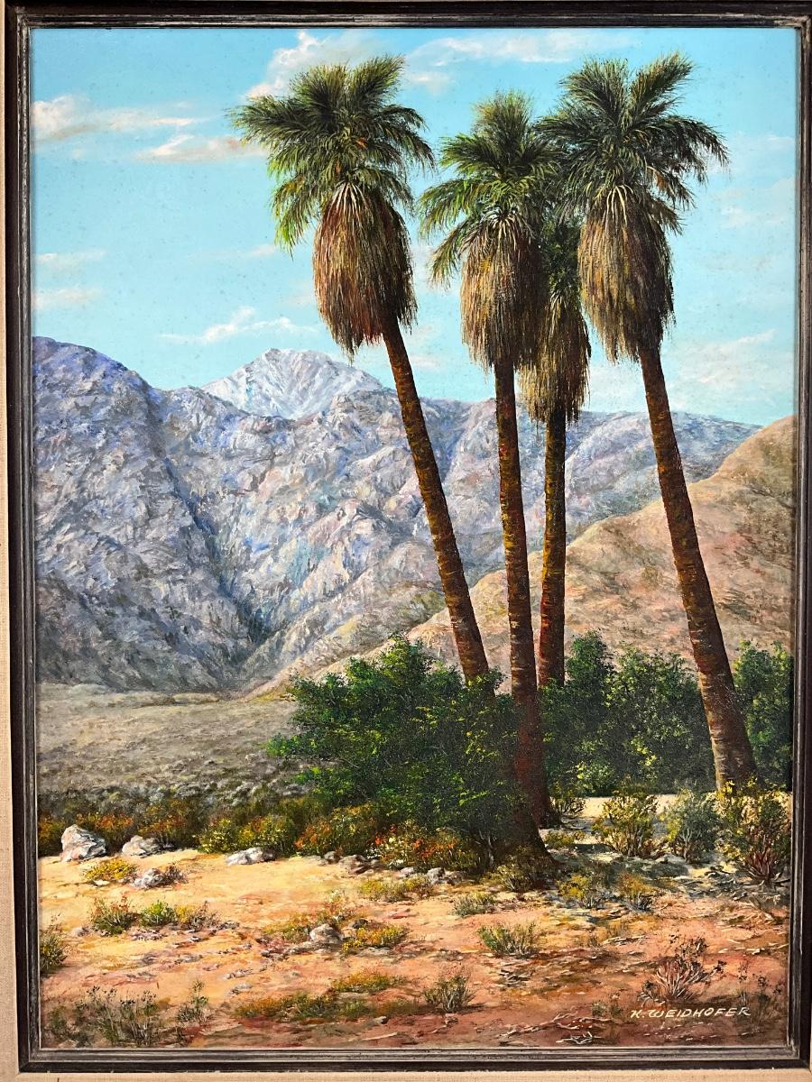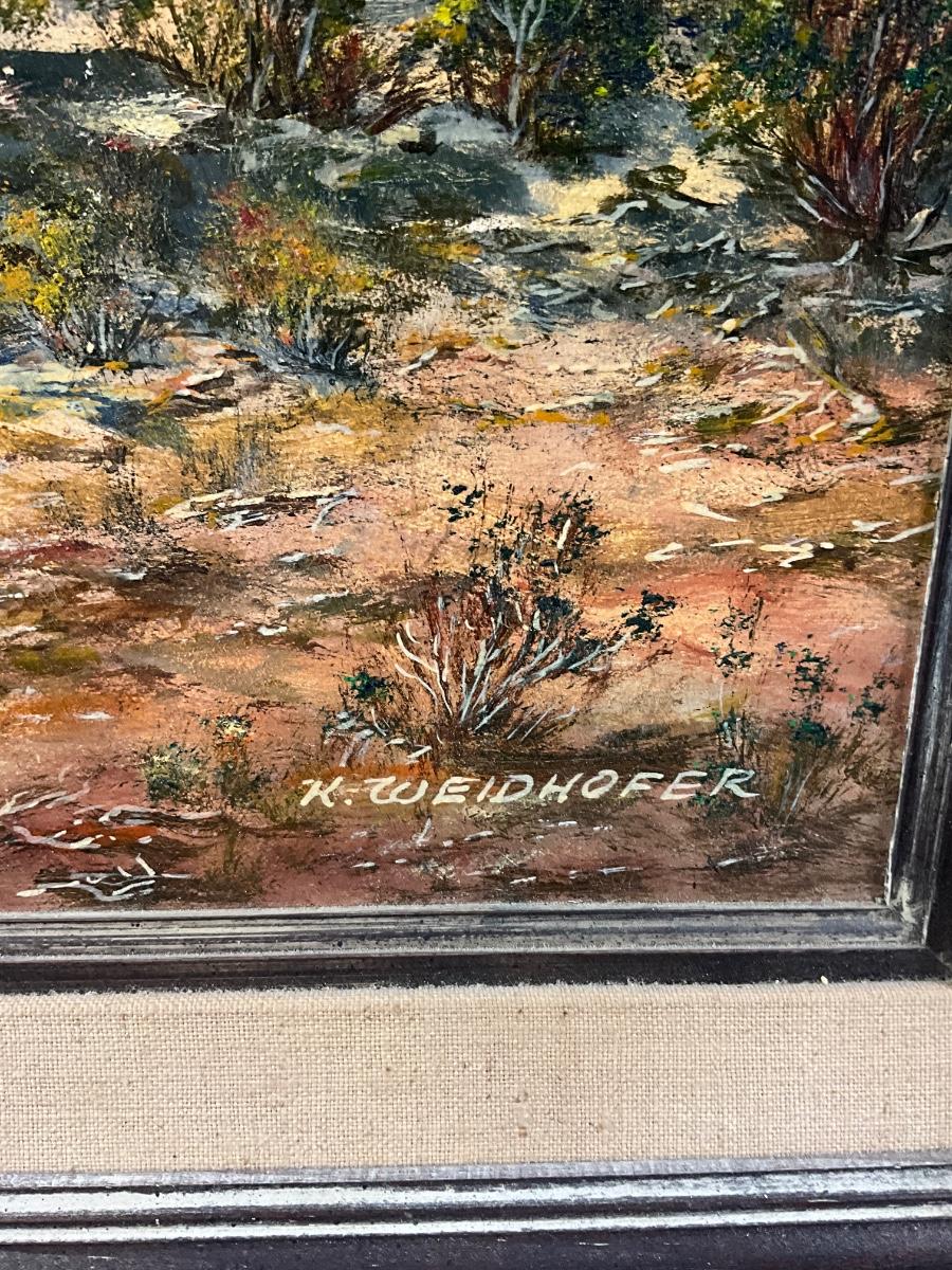 Karl Weidhofer was born in East Prussia, Germany on June 8, 1920. Weidhofer was in the German army when captured by the Russians during WWII. While imprisoned for four years, he was taught to paint by a fellow prisoner. After the war he was reunited with his family in Bavaria. He married and in 1954 moved to southern California. For many years he worked as a lab technician for Pomona Tile Company while painting in his leisure. In 1968 he became a full-time artist and began exhibiting his painings in art shows held in malls and parks in southern California and the Southwest. Weidhofer died at his home in Pine Grove, CA on Nov. 3, 2001. Best known for his desert landscapes, some of his works are signe