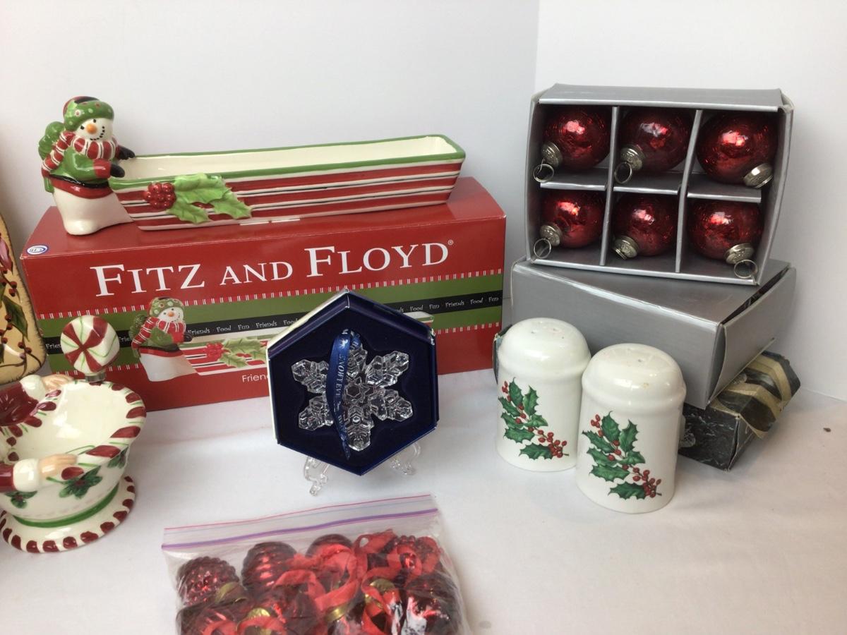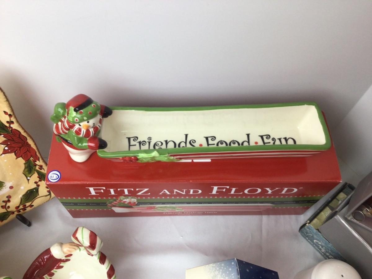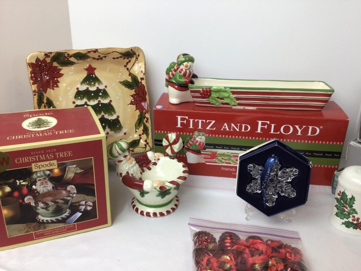 Lot contains Spode disc, Fitz & Floyd Dip Tray, ornament place card holders, and more.