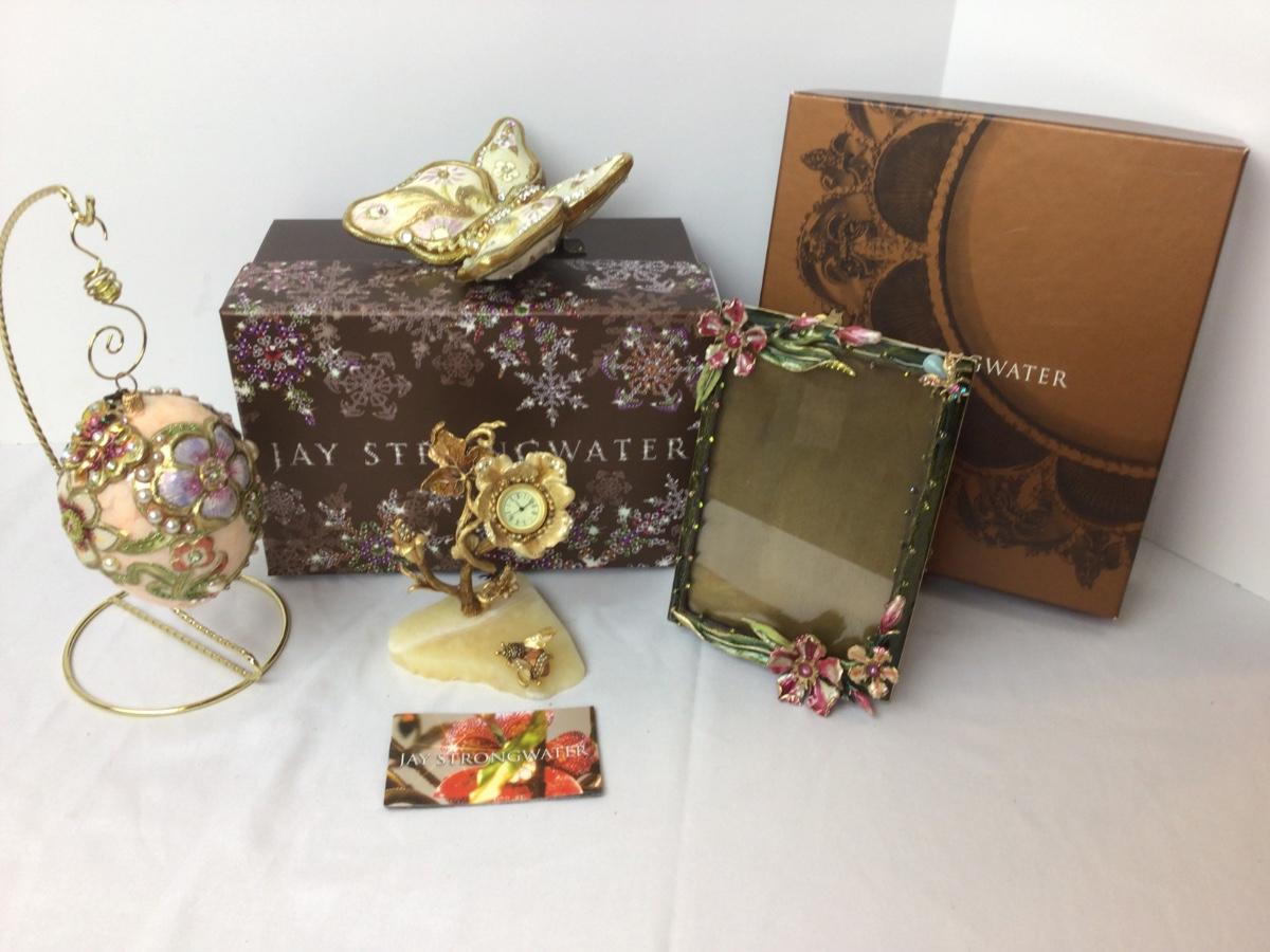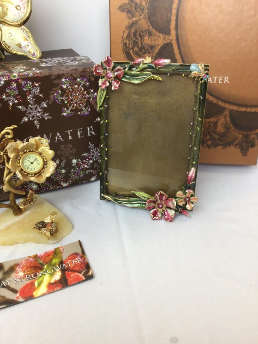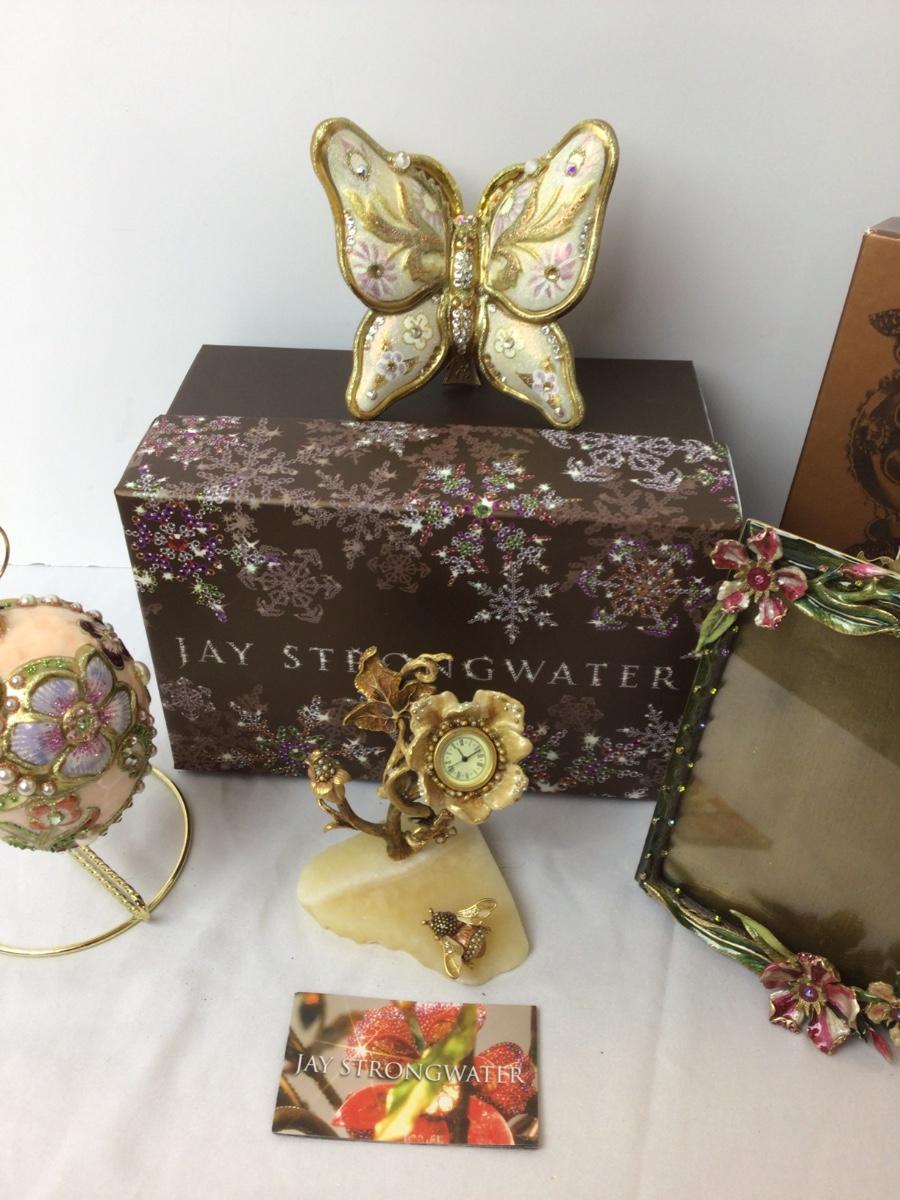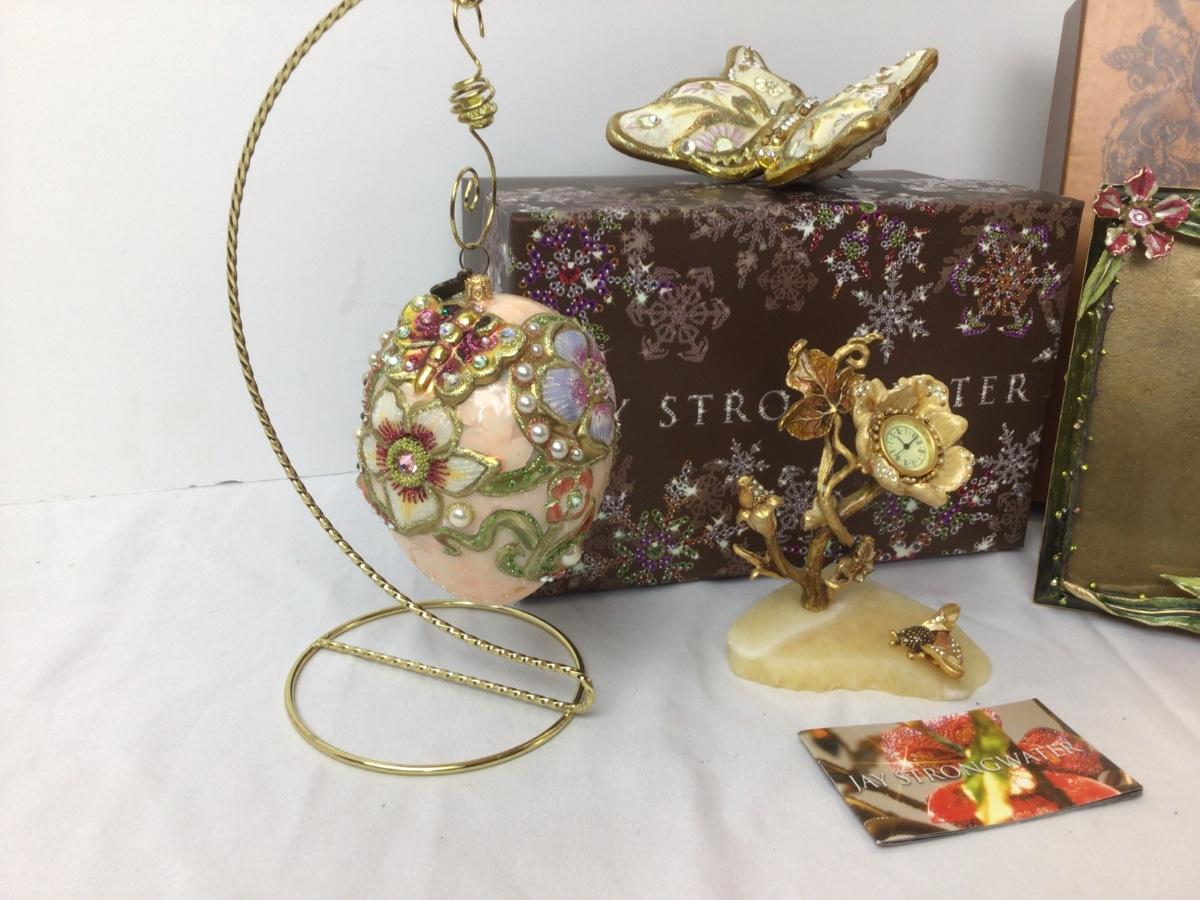 The lot contains jeweled and enameled frames, clock, egg ornament and butterfly clip on tree ornament.