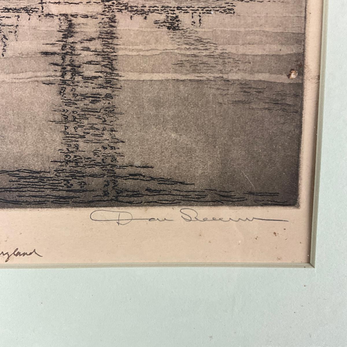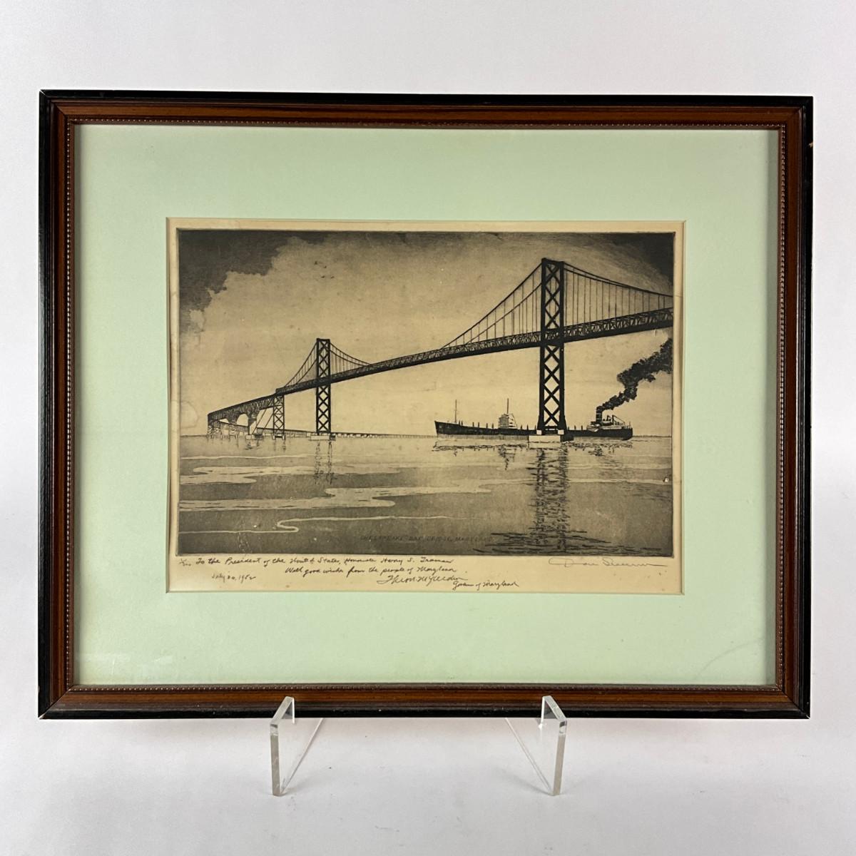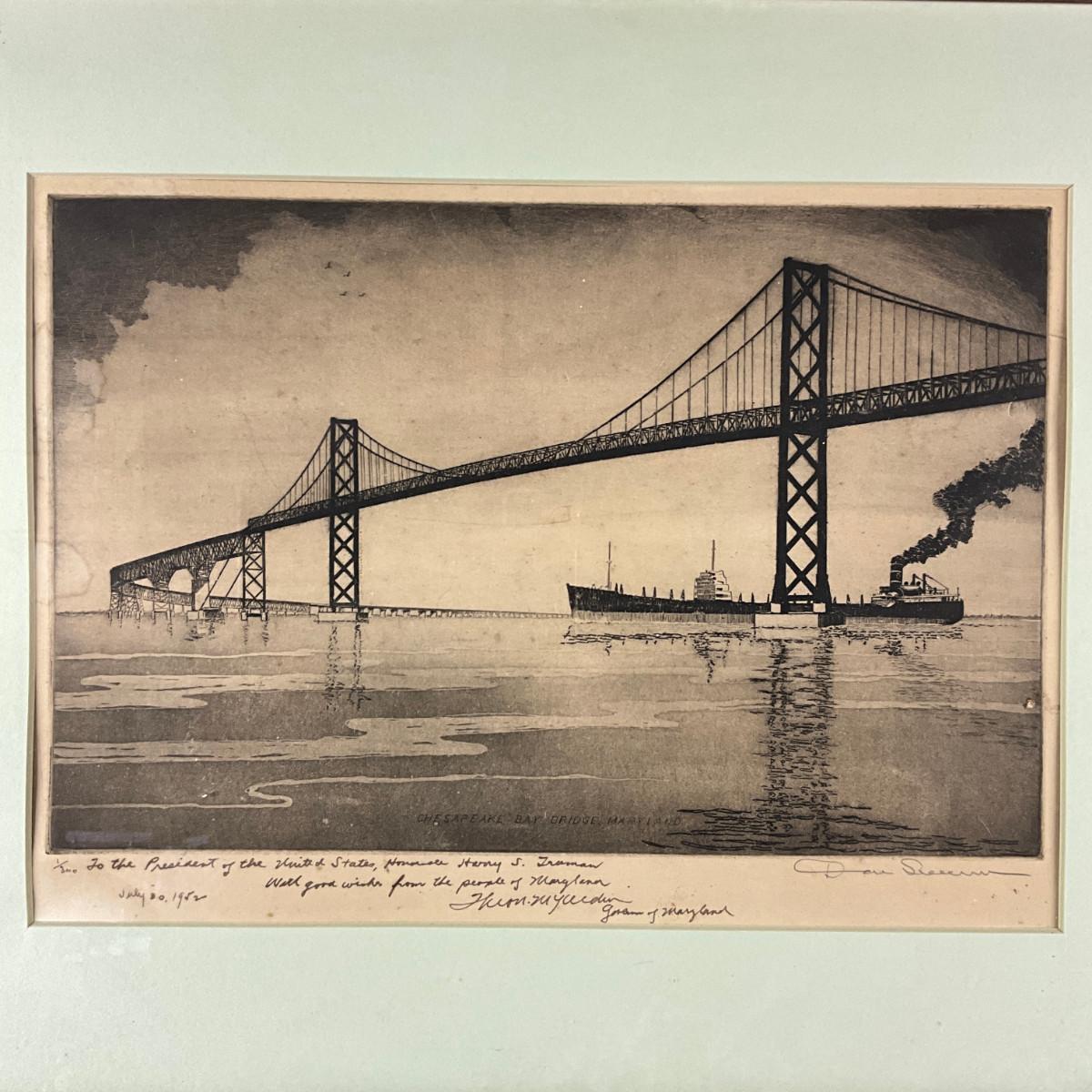 1096 Signed "Don Wann" Samuel Donavin "1889-1954" Etching Of The Chesapeake Bay Bridge, Maryland