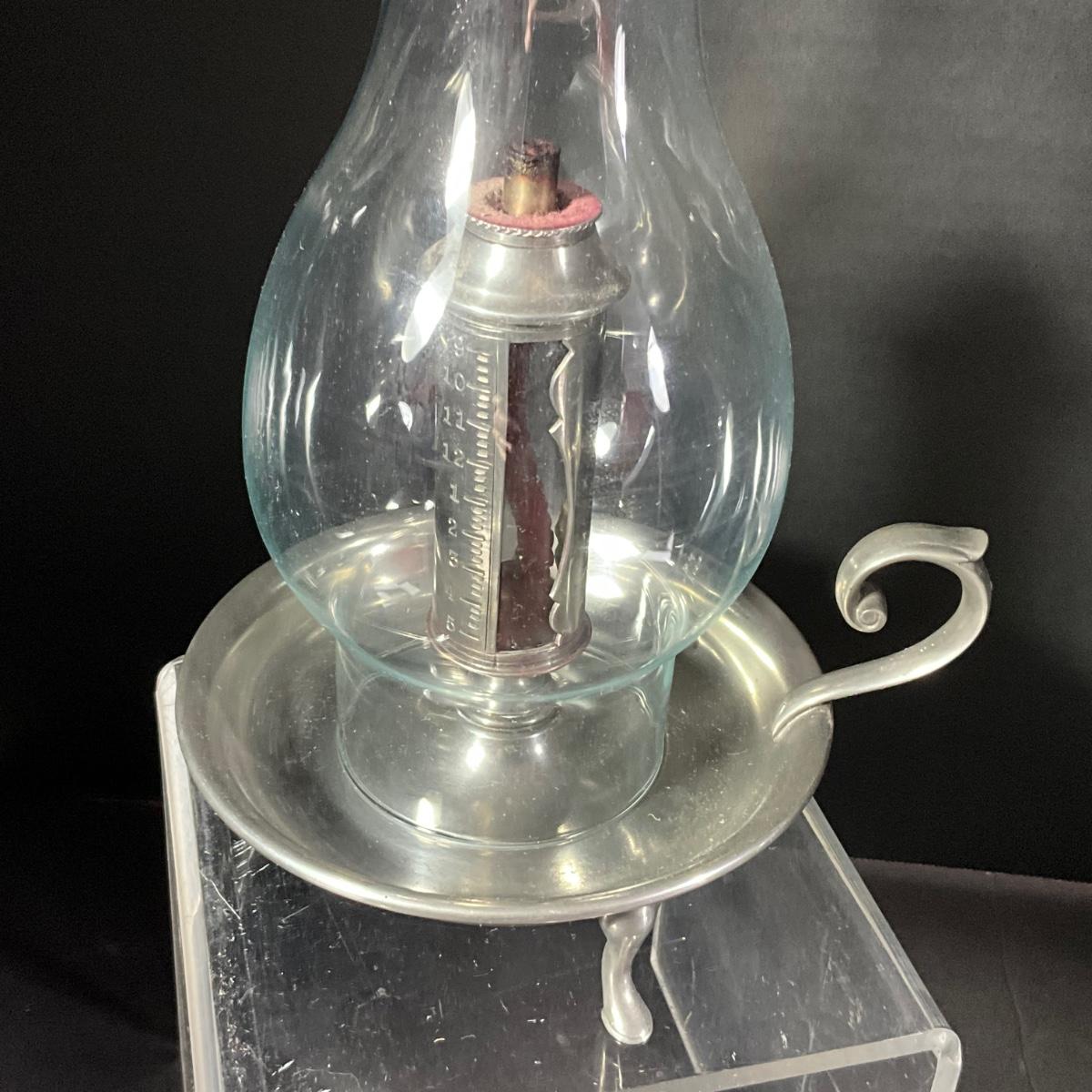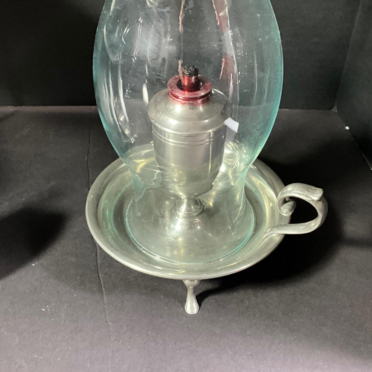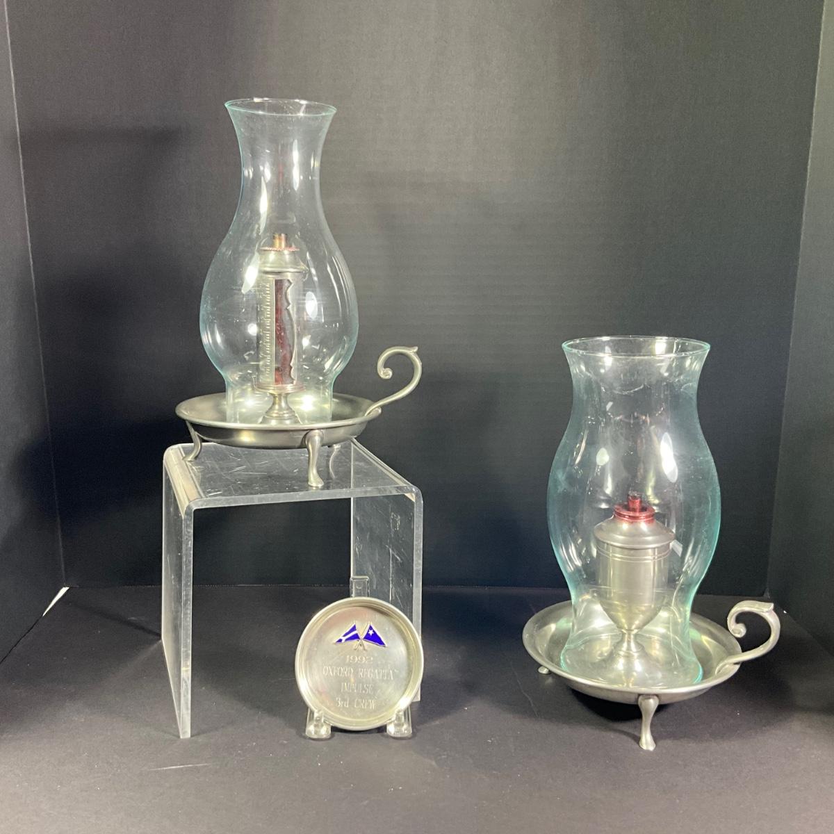 1097 Mid Century Pewter Oil Lamp w/ Meter and Whale Oil Lamp by Shirley Pewter with Oxford Regatta Trophy Dish