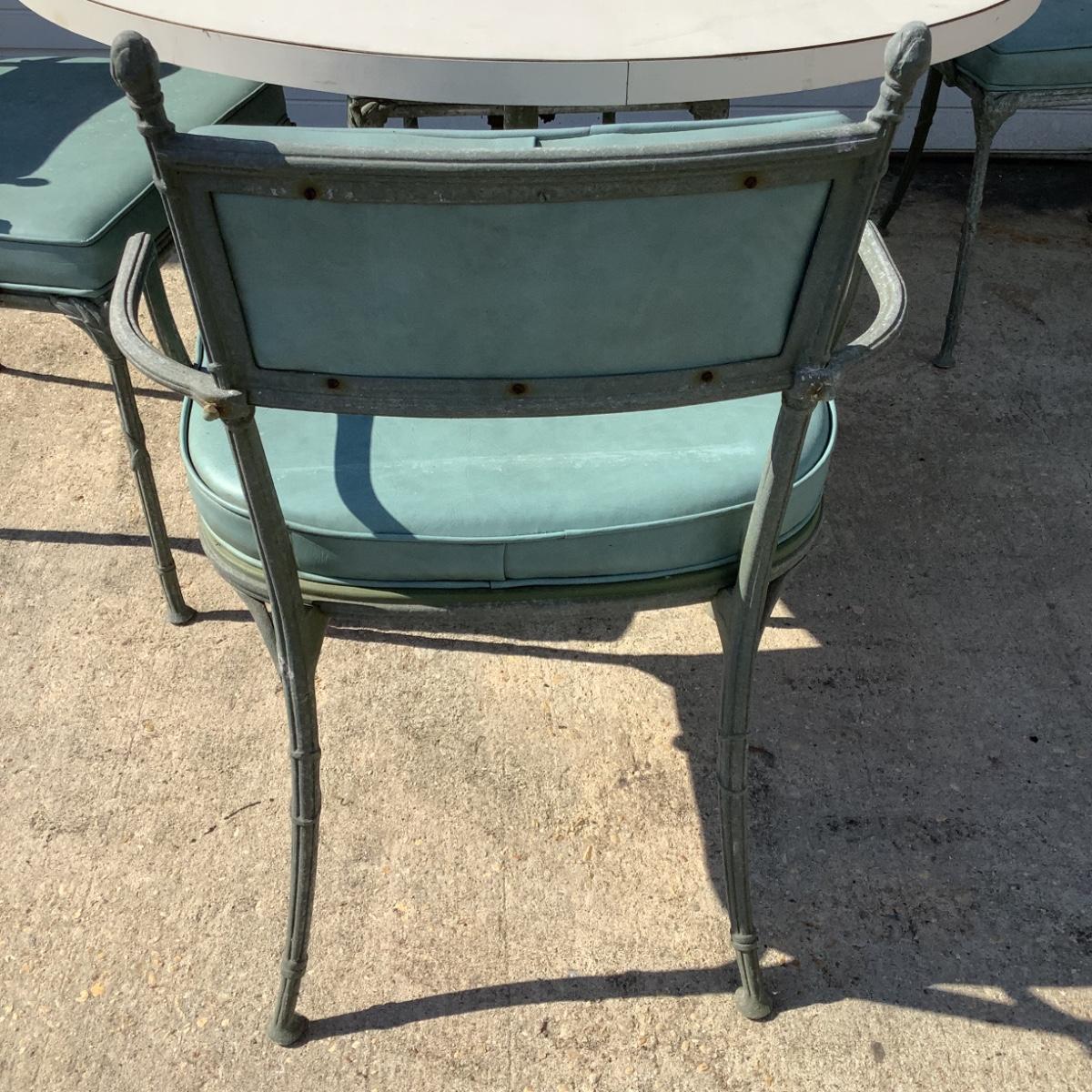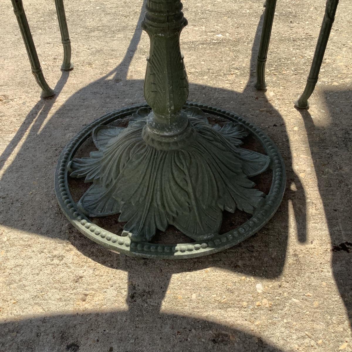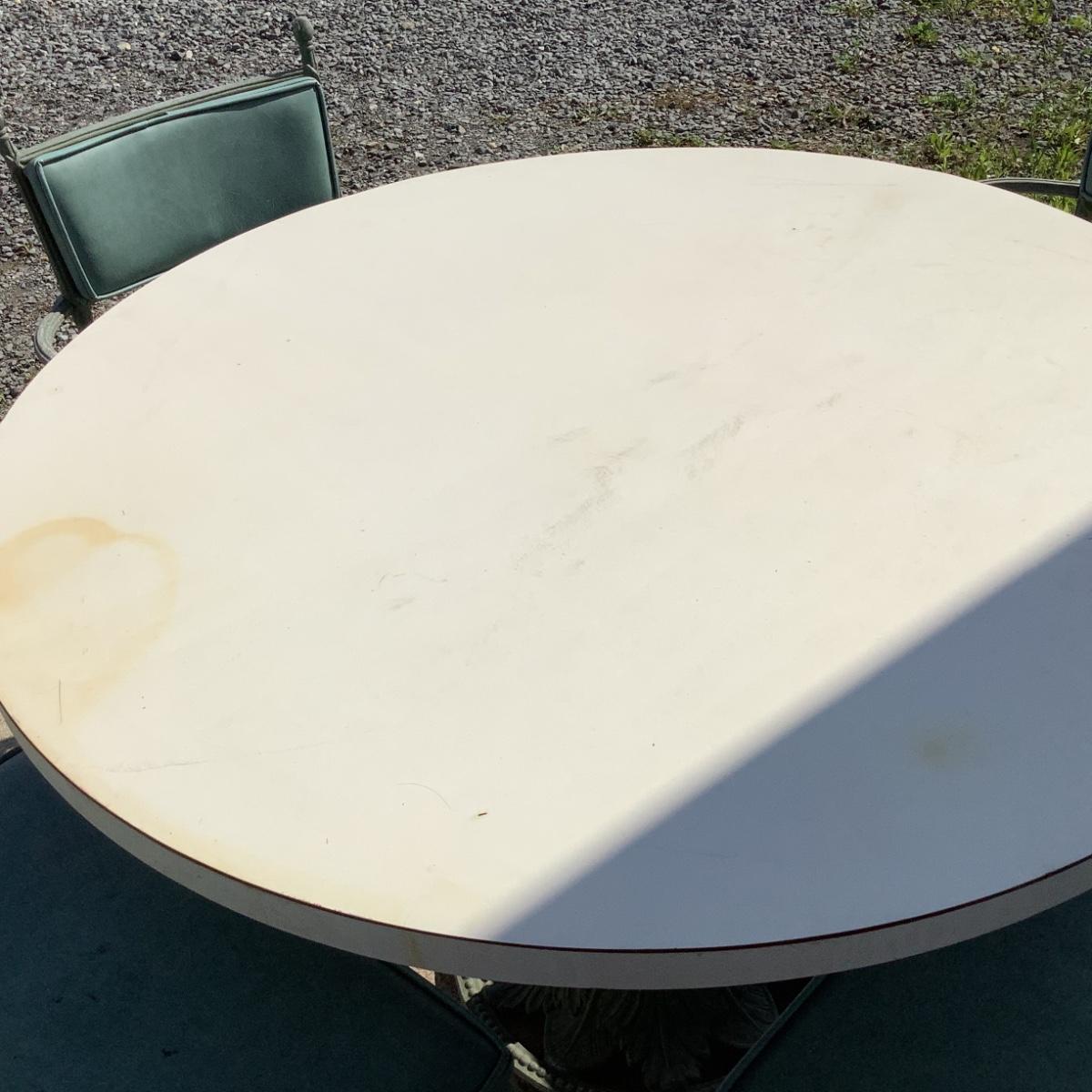 Table is cast aluminum base with formica table measuring 42.5" diameter x 29.5" high