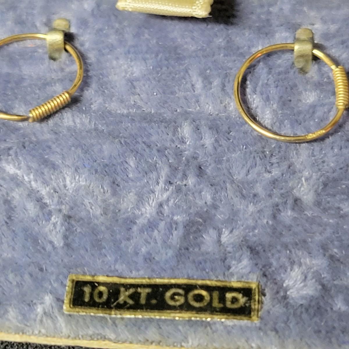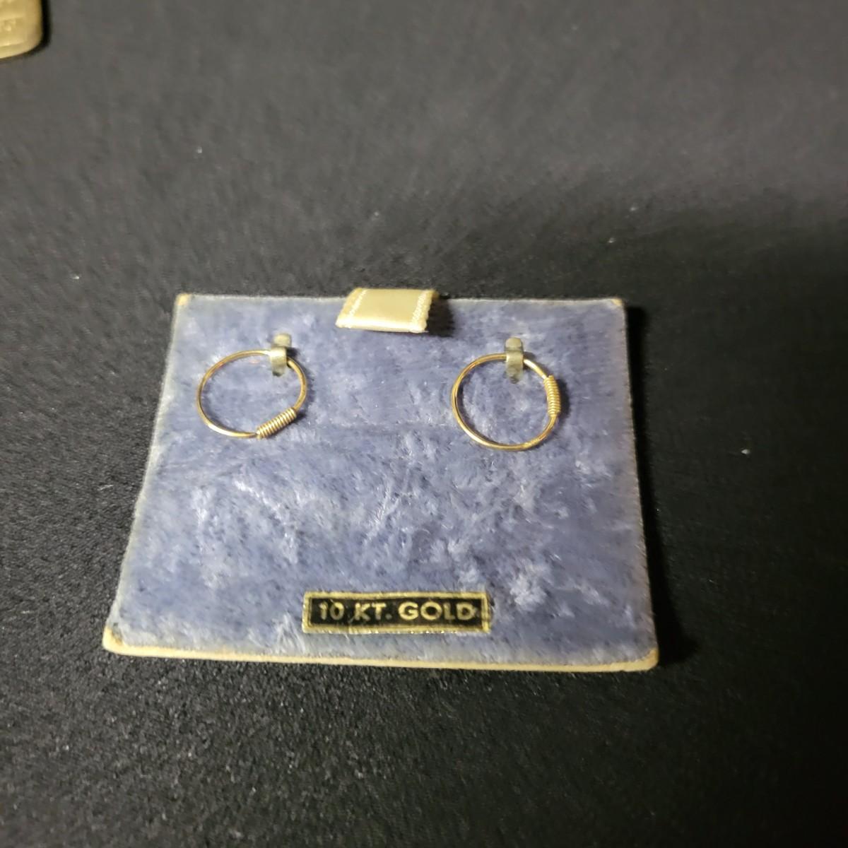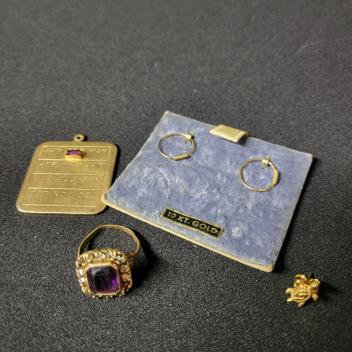 A collection of four pieces of jewelry in good condition. The only confirmed 10kt gold piece is the hoop earrings. Also included is a birthstone calander with a stone inset, a ring with out a stamp and single turtle earing. Birthstone calander measures approximately 1.25" Shipping available