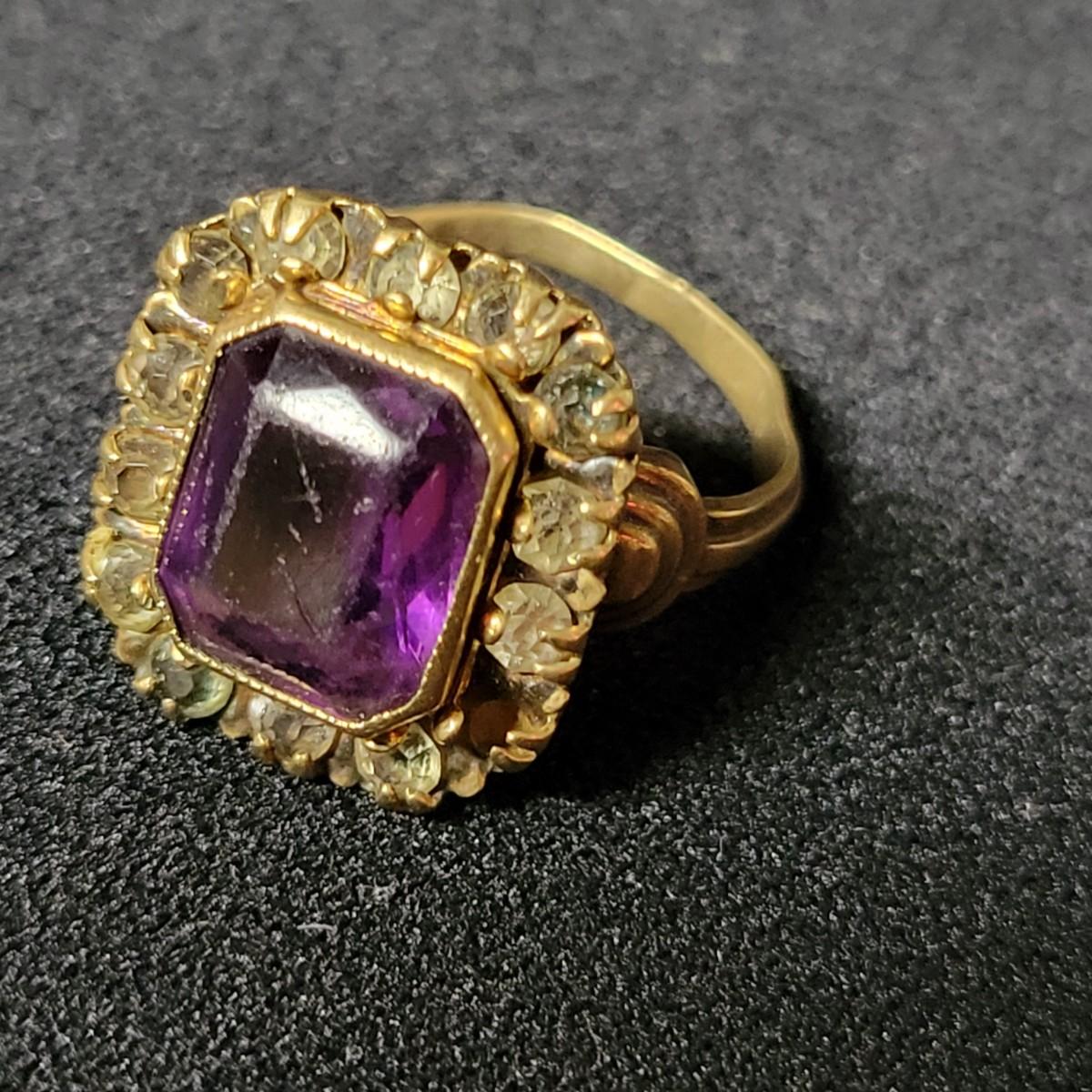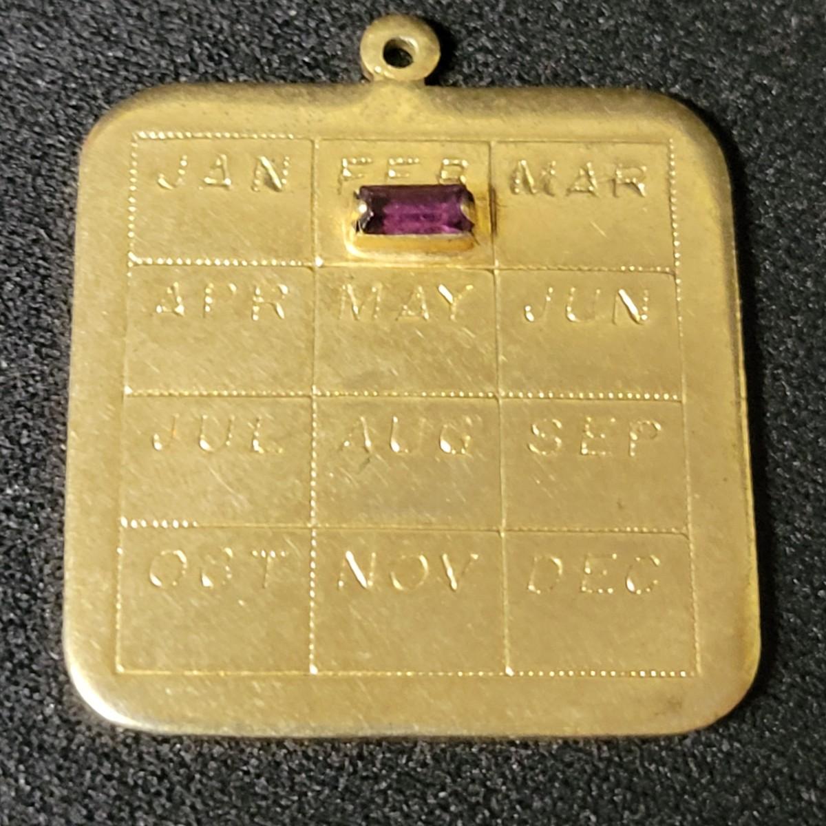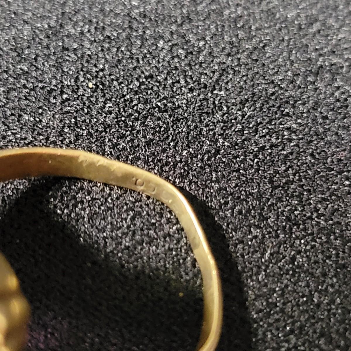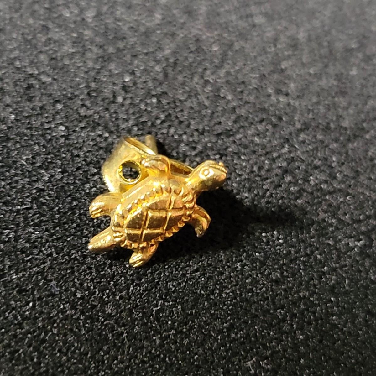 A collection of four pieces of jewelry in good condition. The only confirmed 10kt gold piece is the hoop earrings. Also included is a birthstone calander with a stone inset, a ring with out a stamp and single turtle earing. Birthstone calander measures approximately 1.25" Shipping available