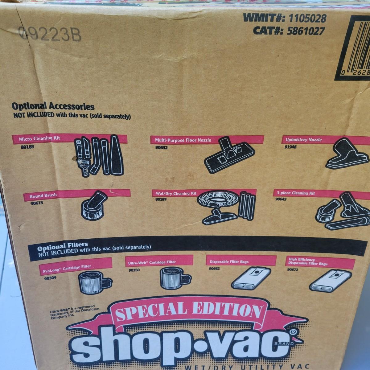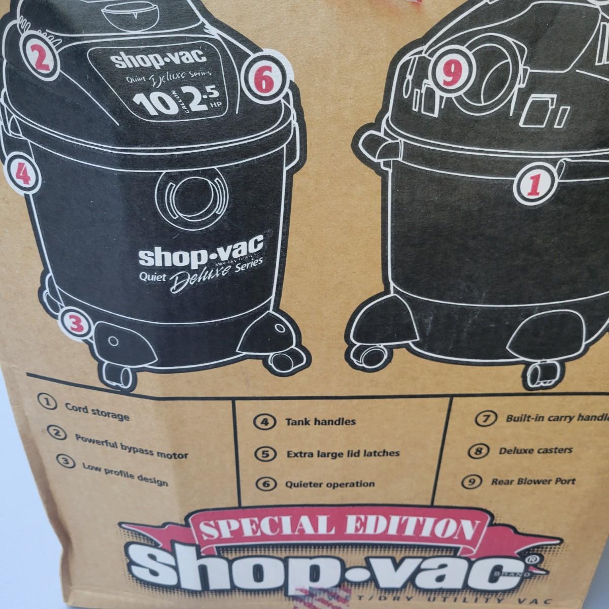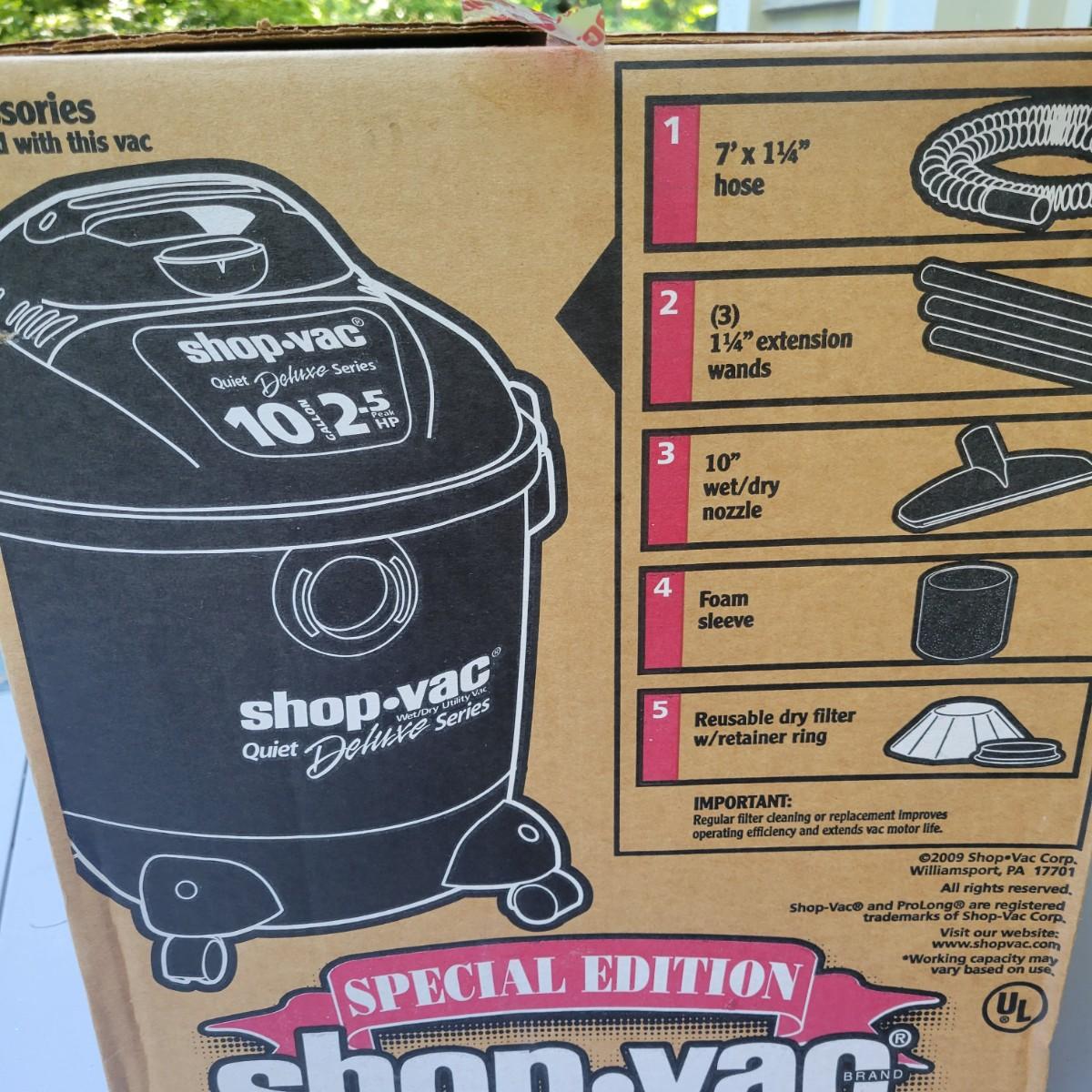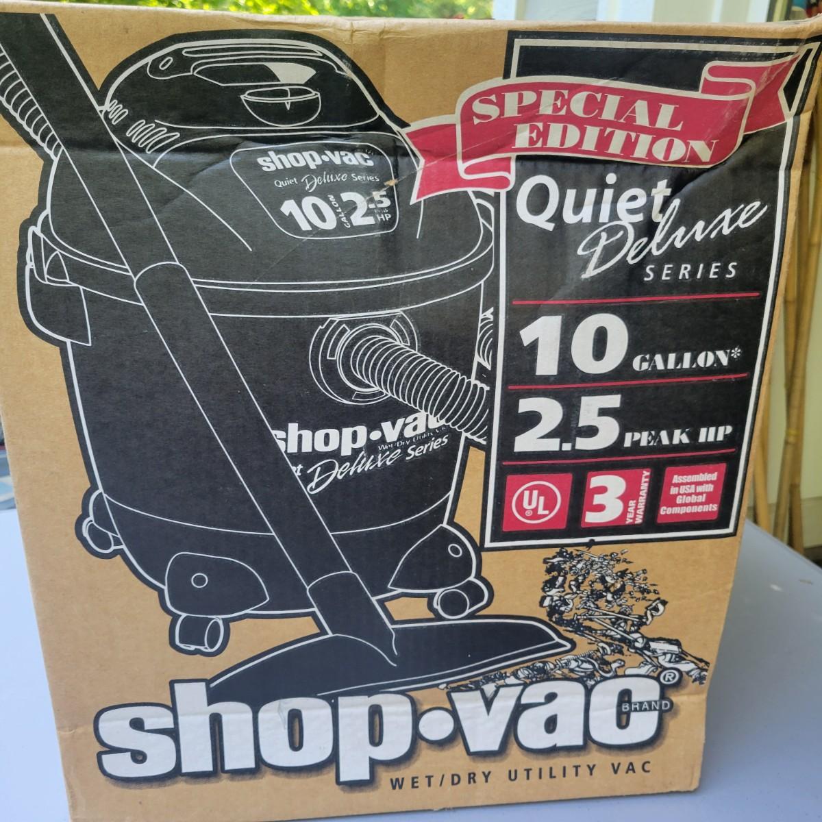 Shop Vac brand, 10 gal, 2.5hp still in original packaging and unused. Special edition quiet deluxe series. Local pickup only