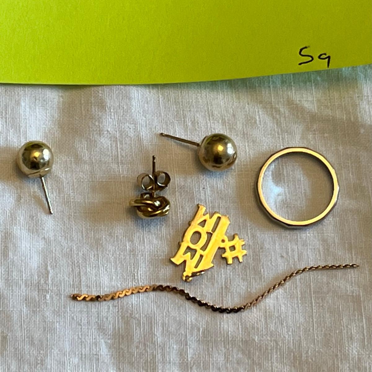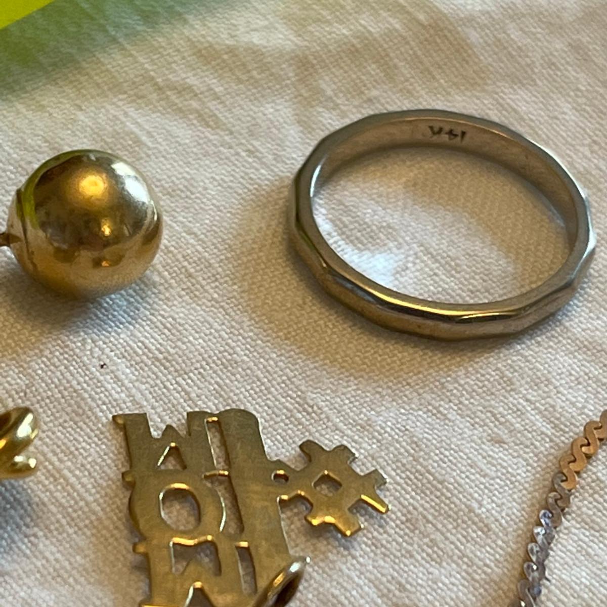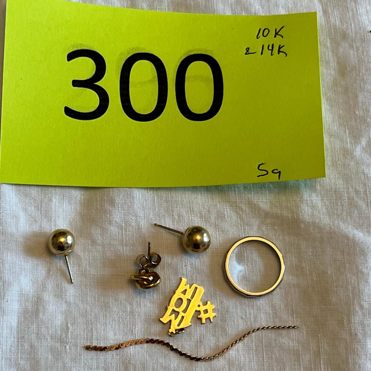 5 grams total weight. Ring is 14K, the rest is 10K. The chain section looks to be 10K, but not guaranteeing that!