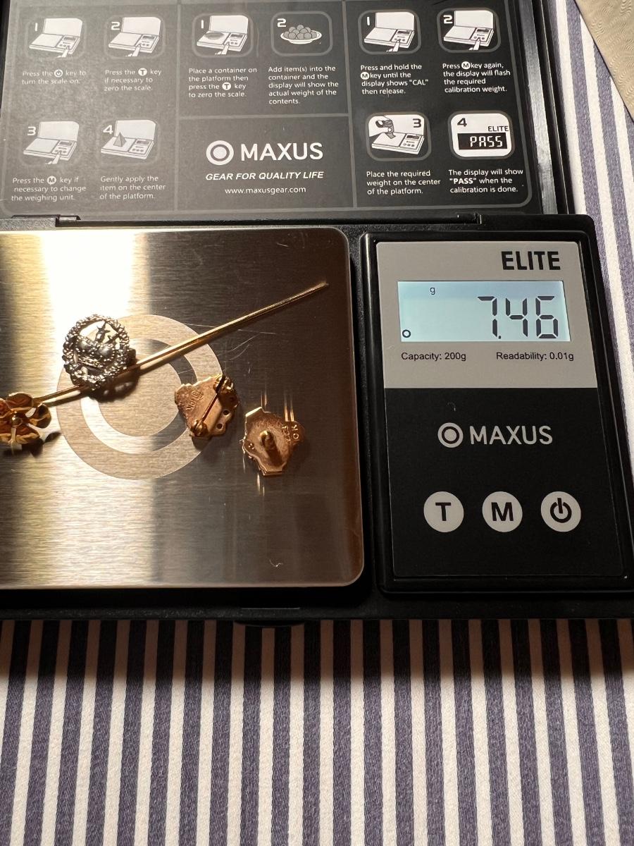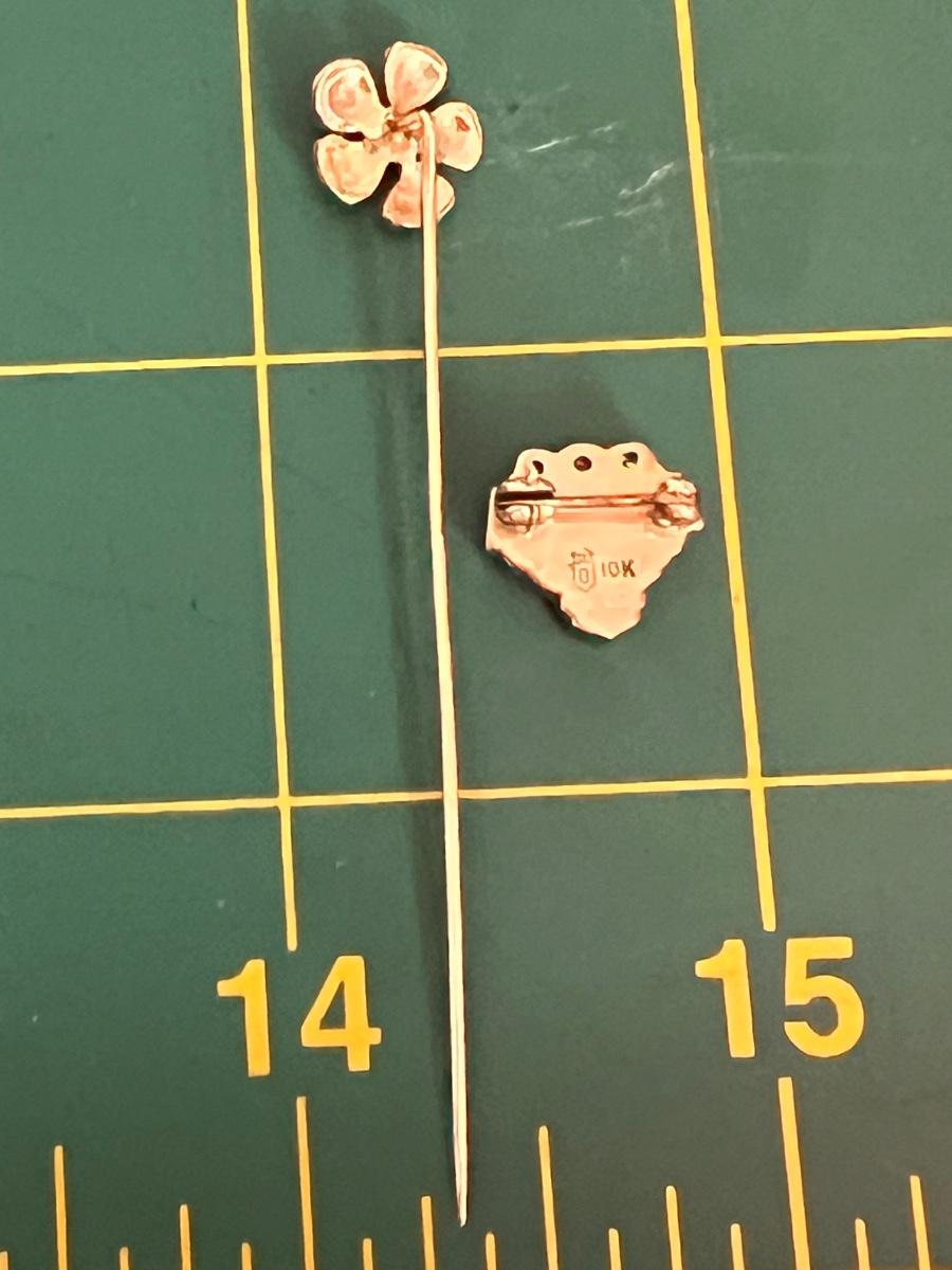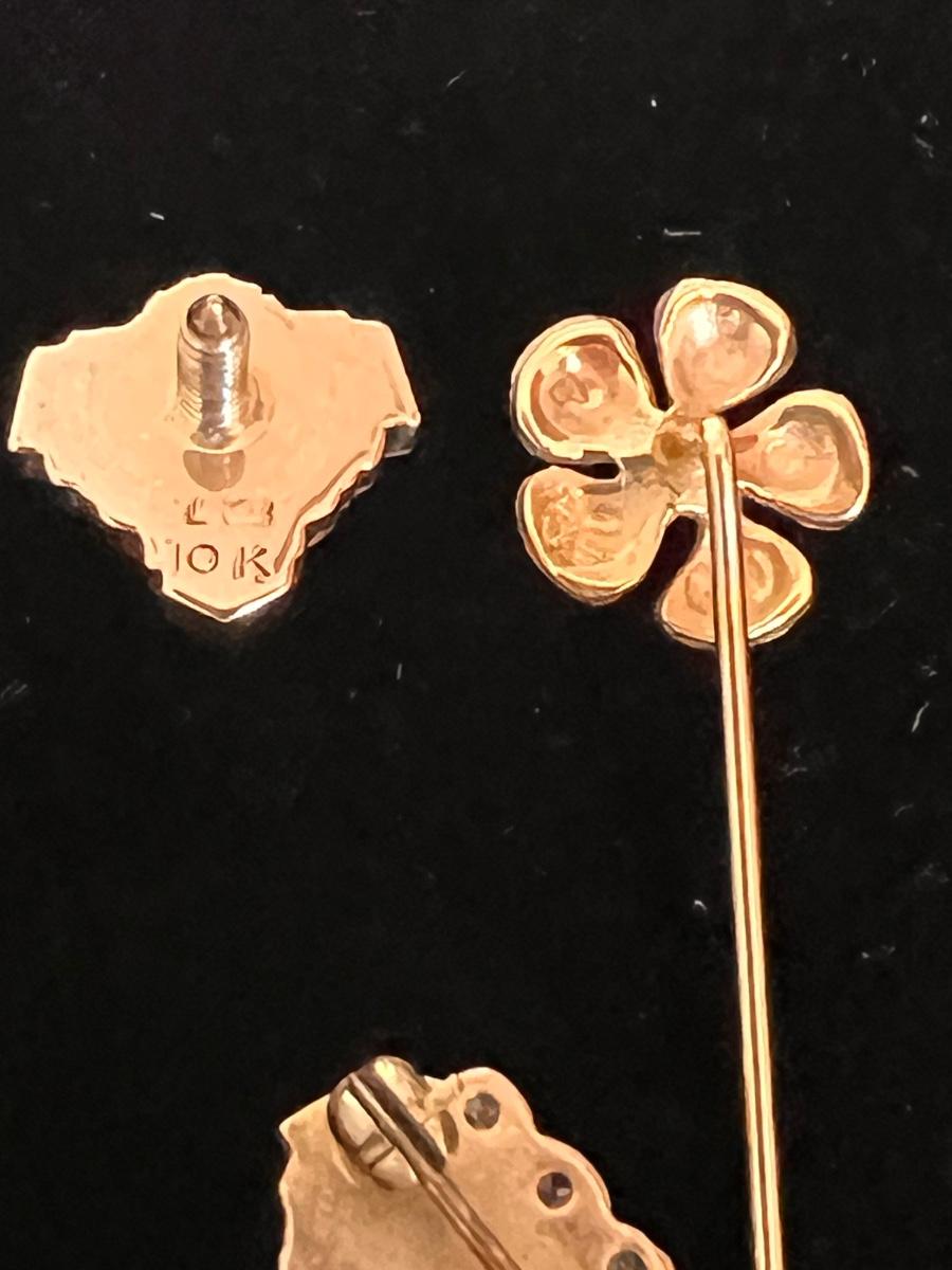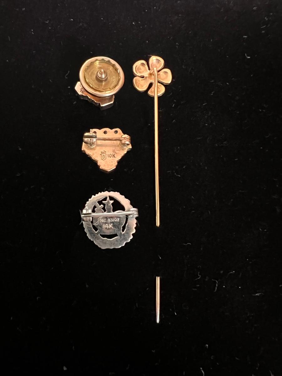 Stick pin and 3 diamond Koppers pin are 14k. The other 2 are 10K.