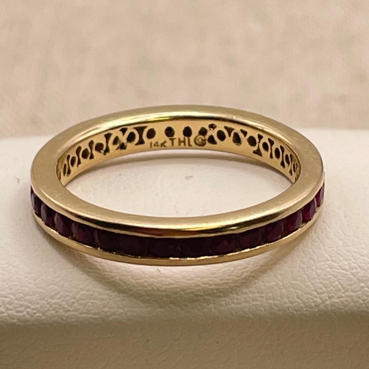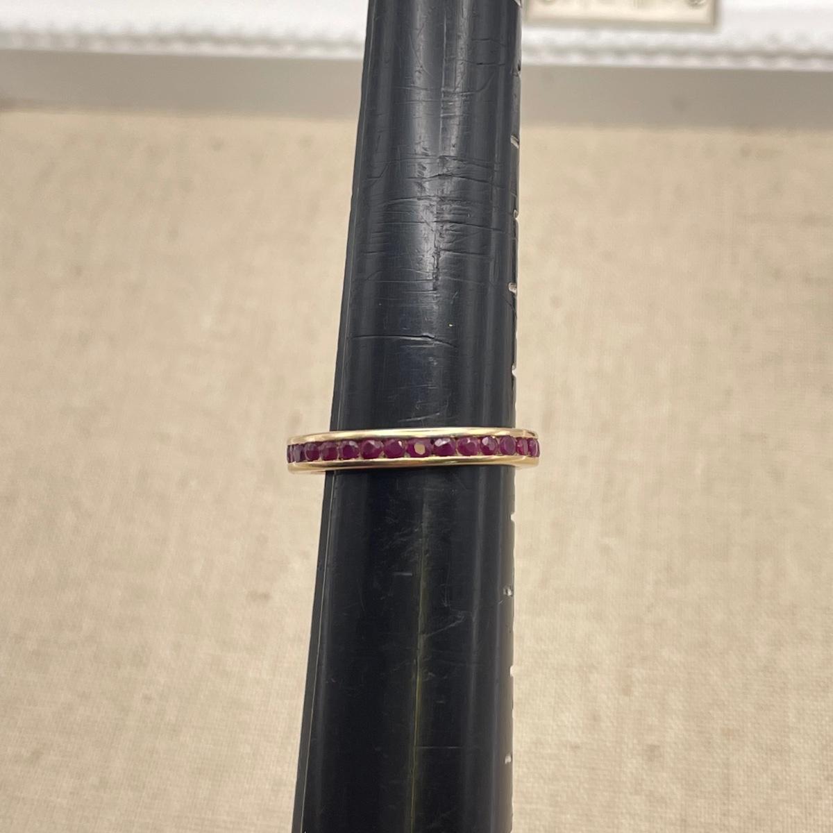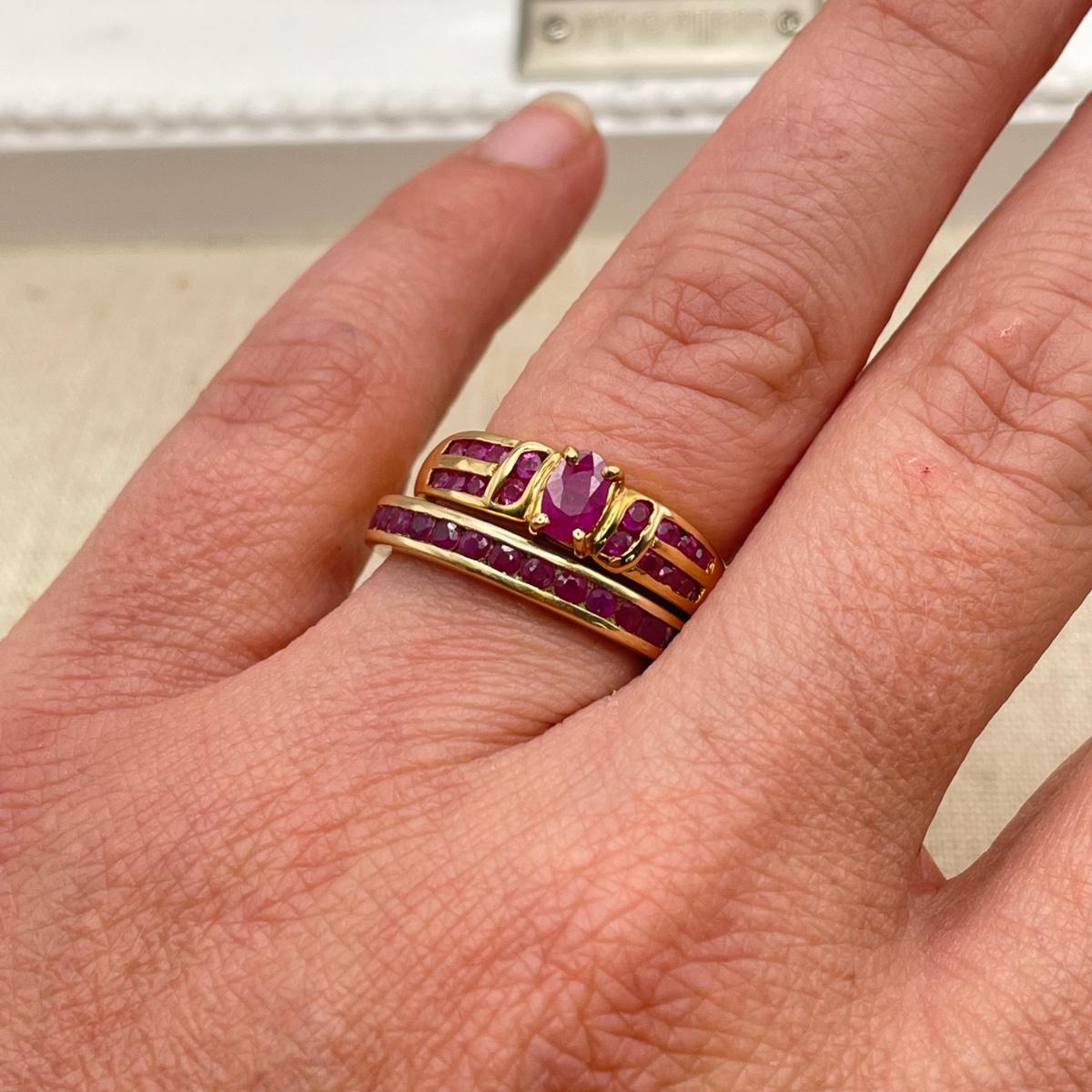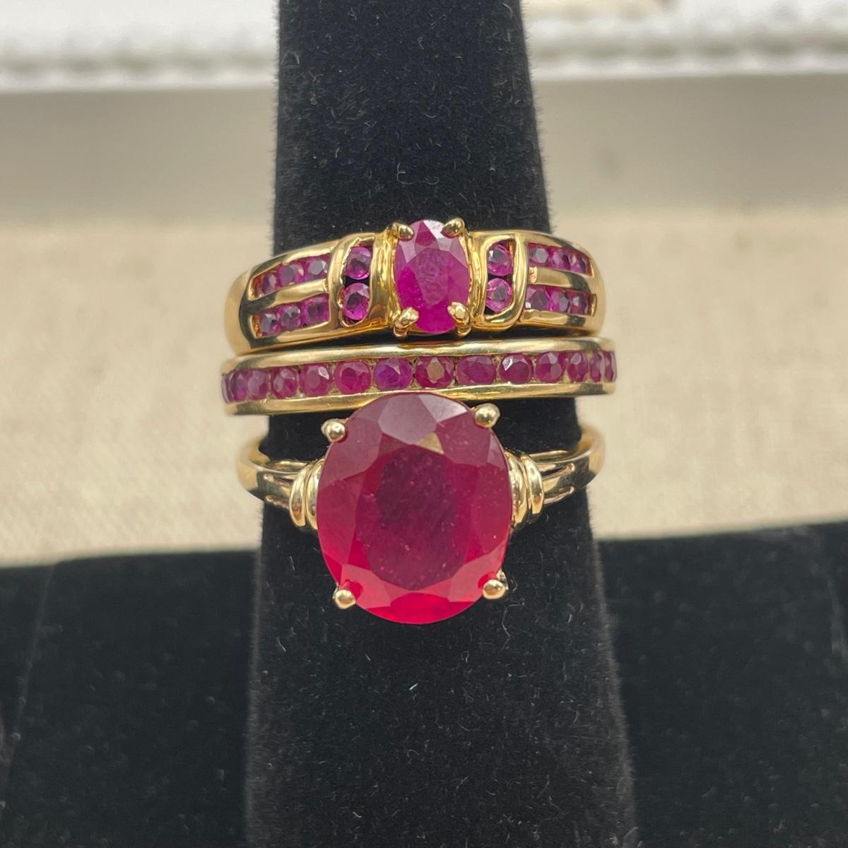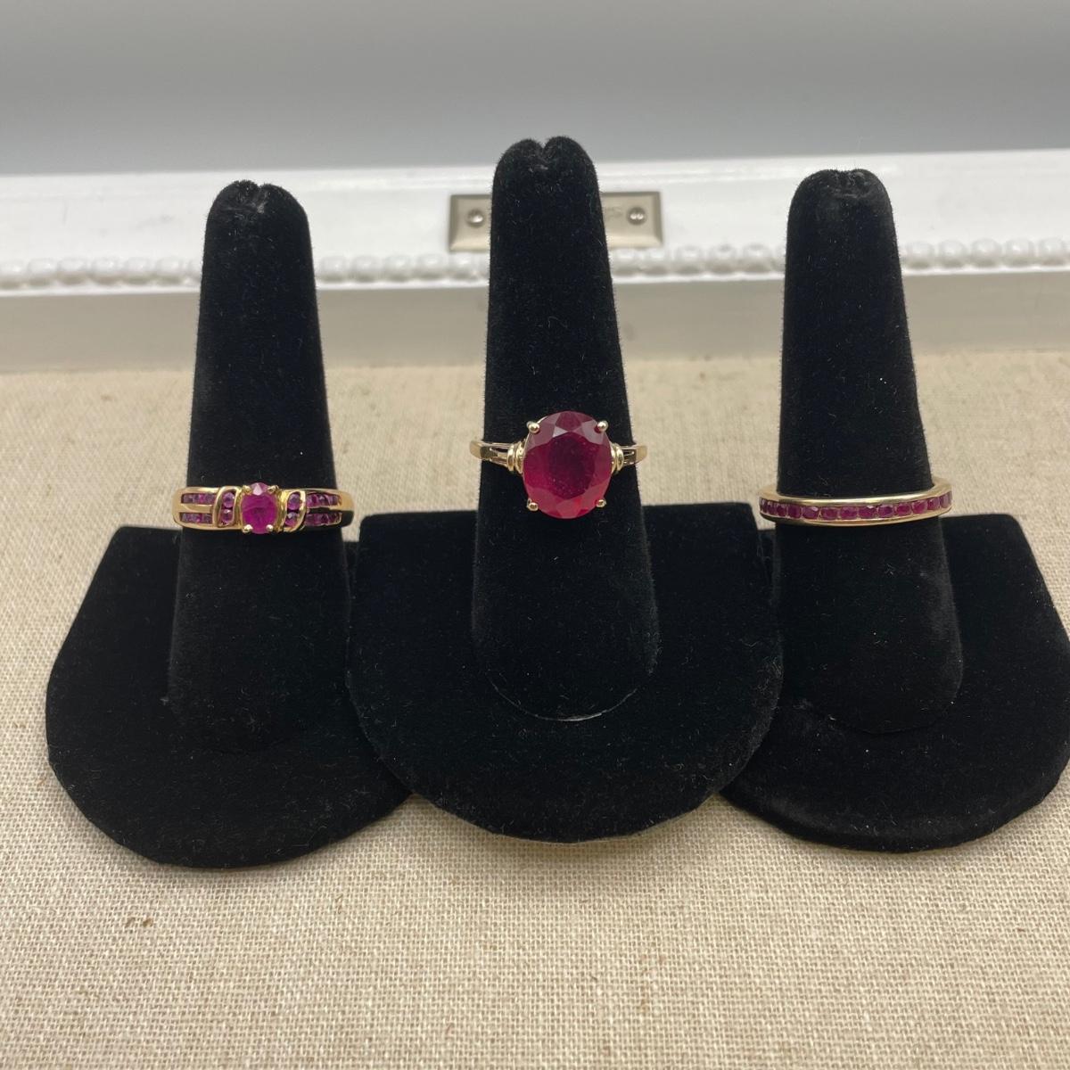 Two 10K stamped and one 14K stamped rings with ruby-pink colored stones. The smaller band has the gems along the circumference. See images for all markings found. Starting bid is at or near melt value. We cannot guarantee the authenticity of the gemstones. All sales are final. No returns or refunds. Please bid accordingly.