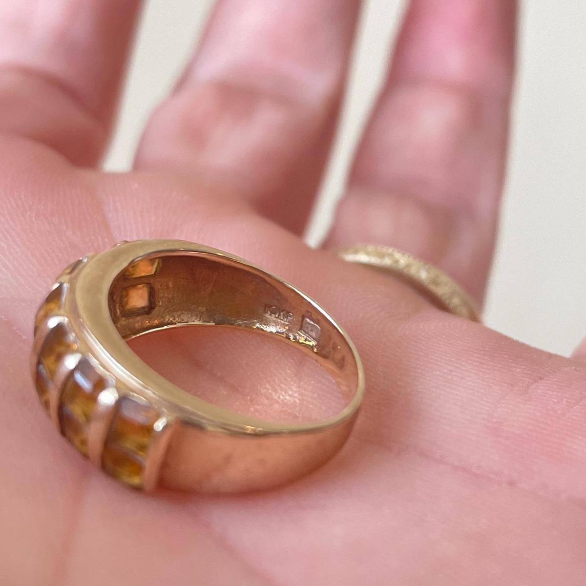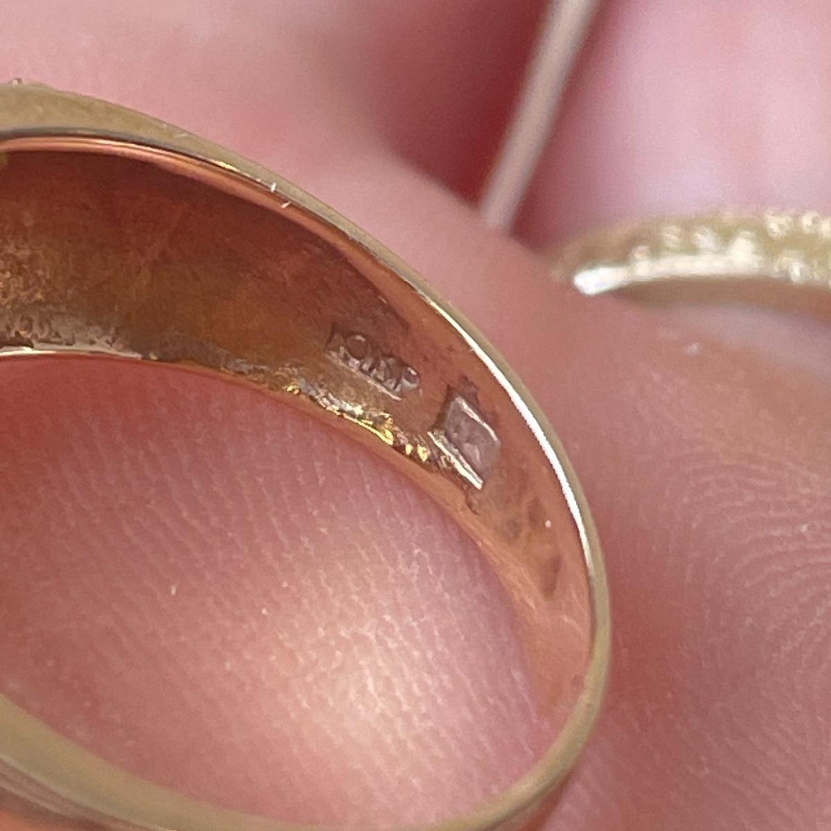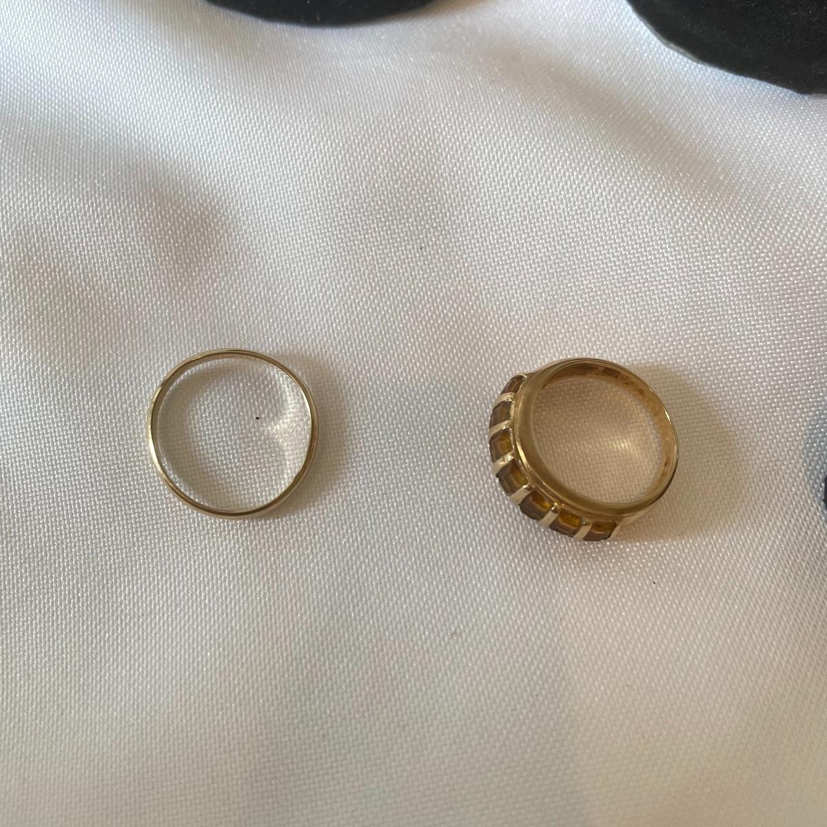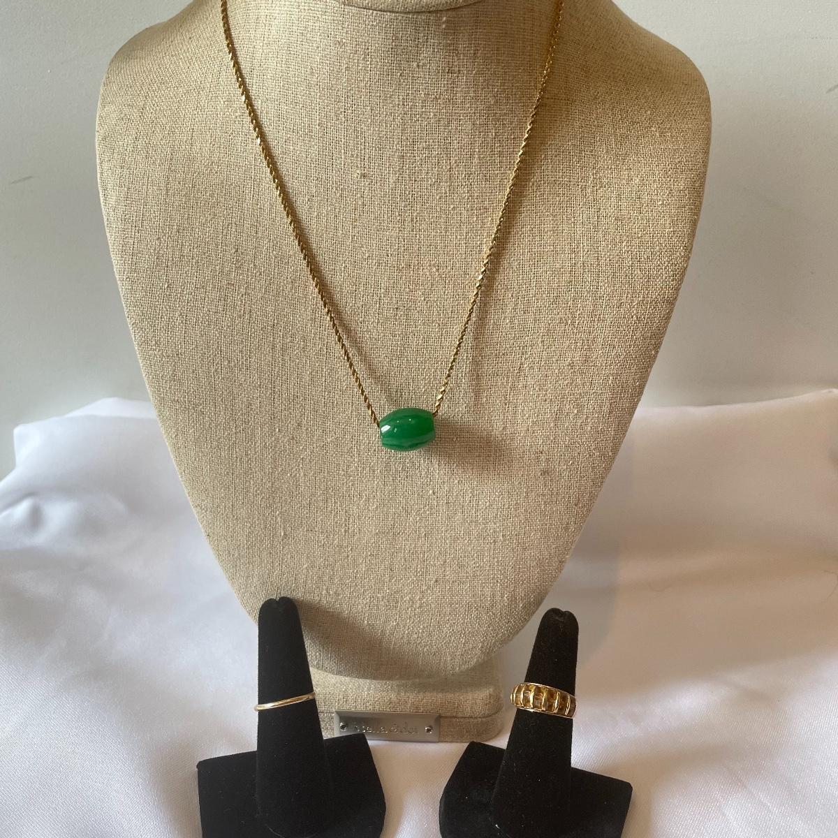 10KP band with amber colored stones and a thin band marked 10K. Lot also includes a jade colored glass bead on an 18” 10K chain. Shipping available.