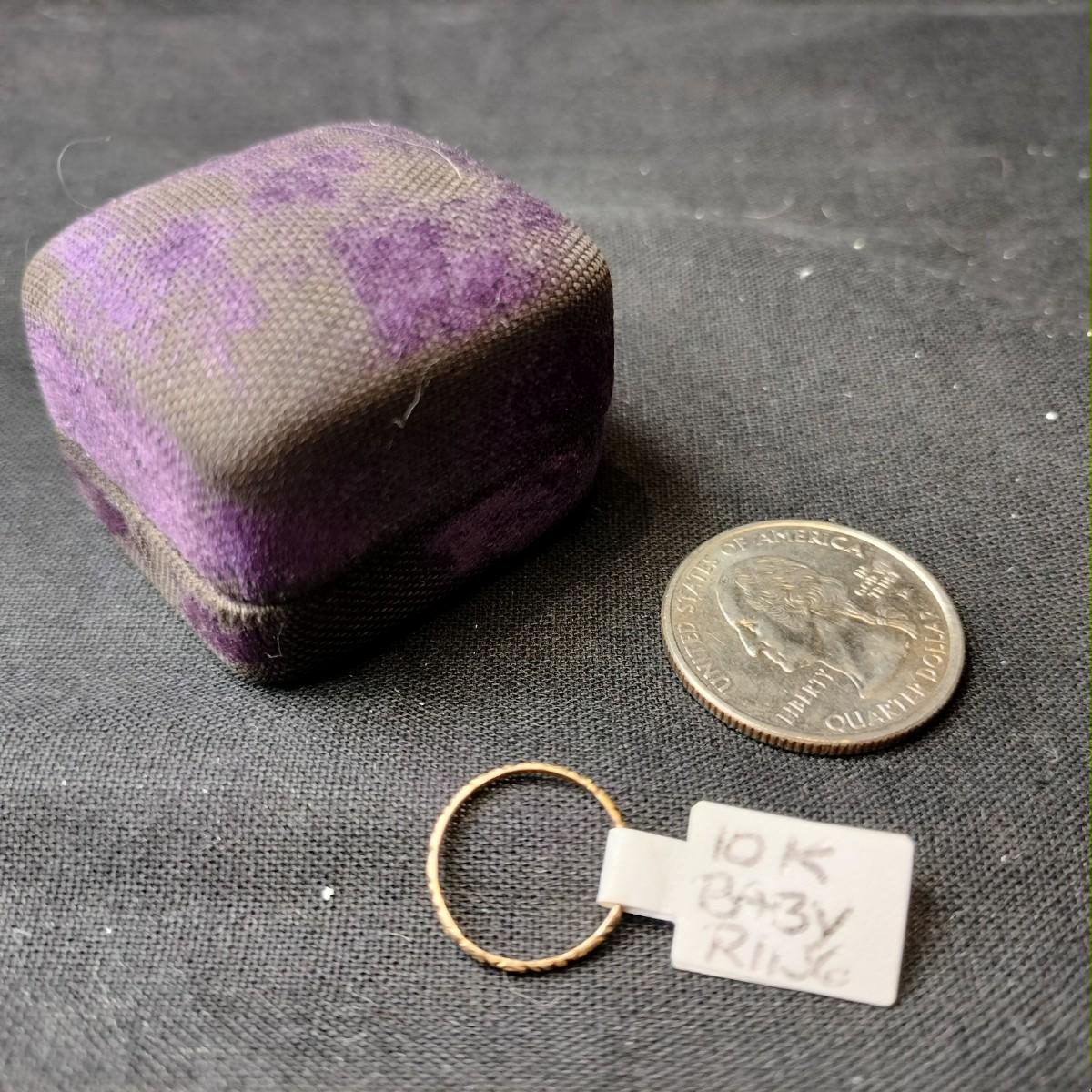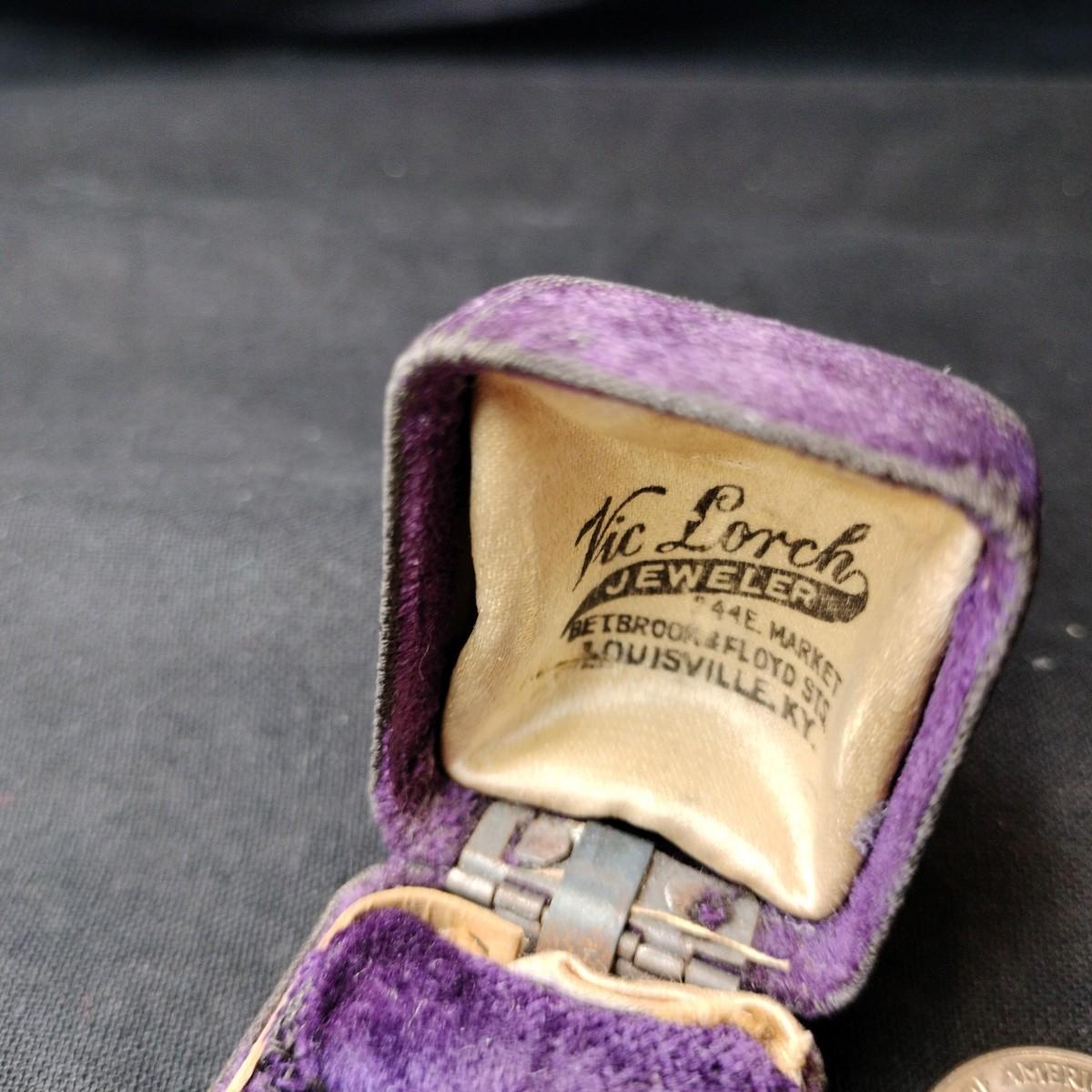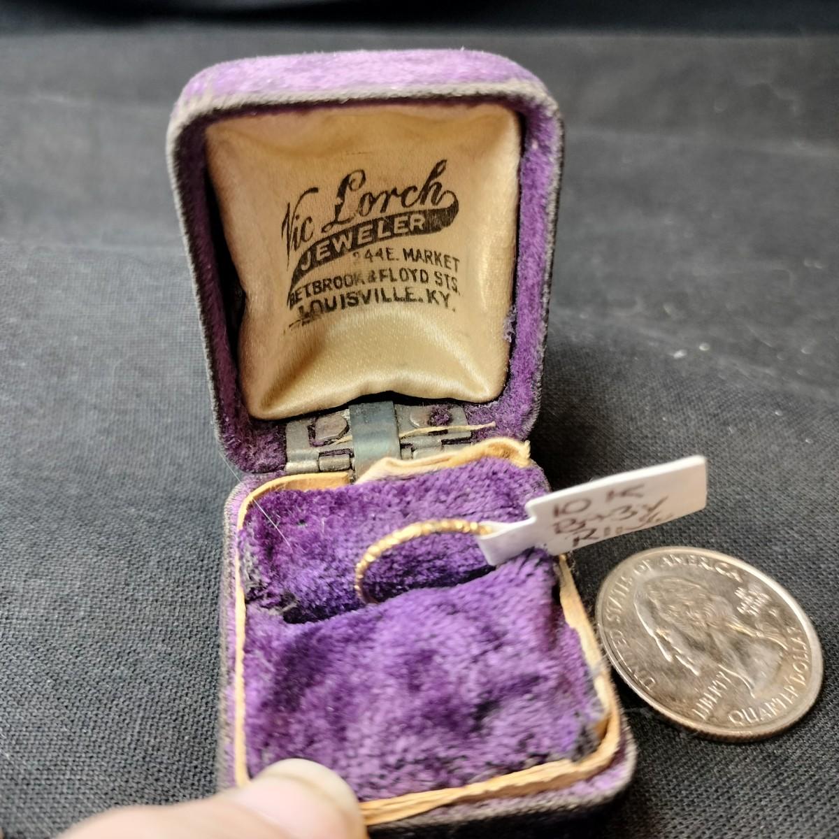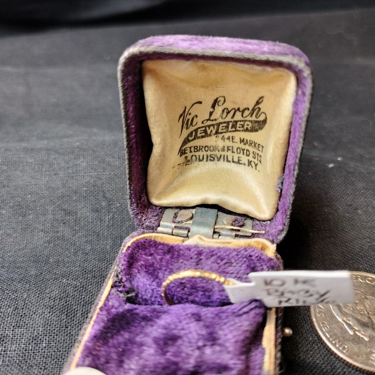 This auction lot is for a 10K Gold Baby Ring in Antique Box. This item is a very tiny 10K Gold Baby Ring in a wonderful old ring box. Box is from Vic. Lorch Jeweler - Louisville, KY,. We don't know which is neater the box or the ring.