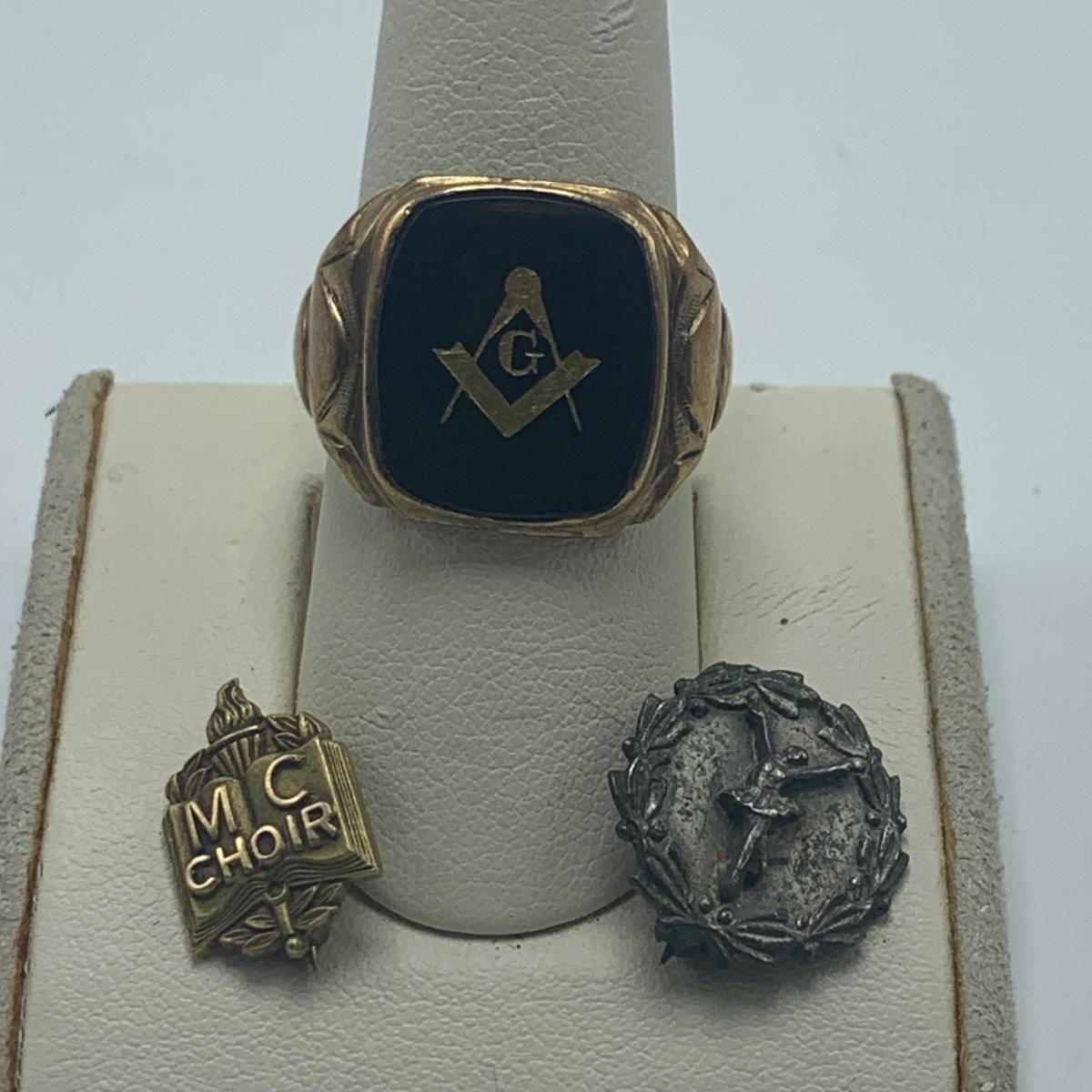 Masonic ring that has a center stone that appears to be black onyx. Ring is stamped “˜10K SA’. Ring is approximately size 9/10. Two small pins are included as well. MC Choir is stamped “˜10K’ and the ballerina is stamped “˜Sterling’.