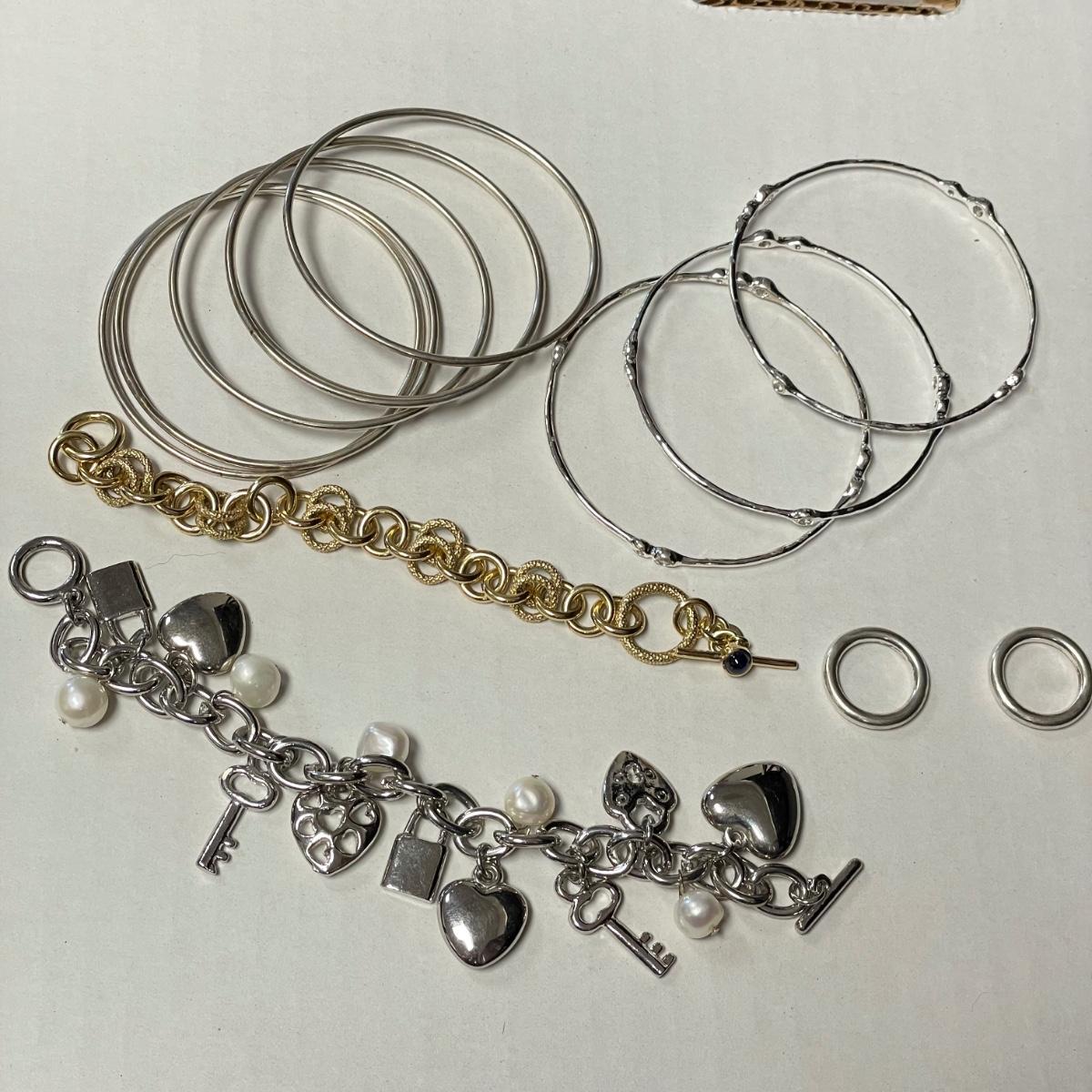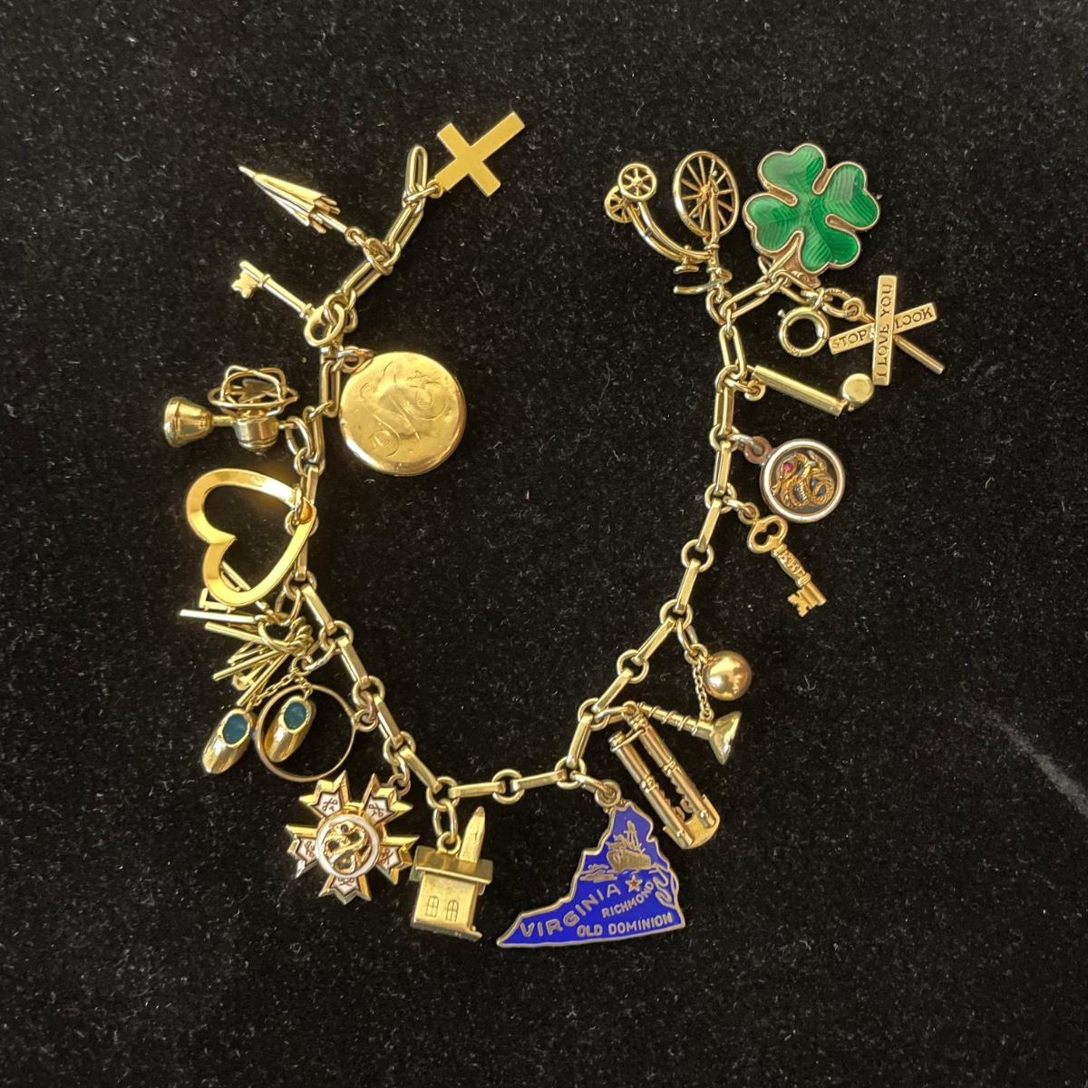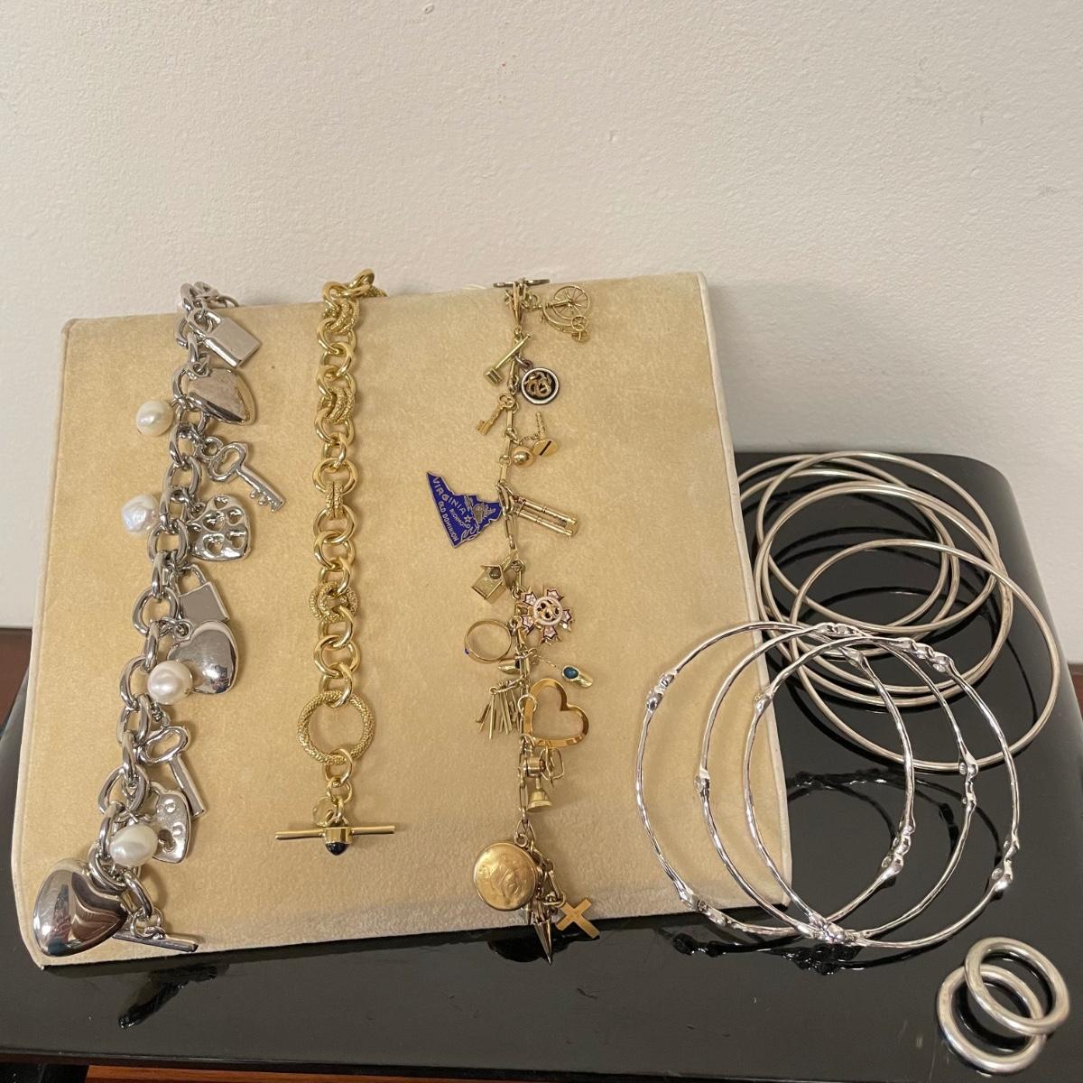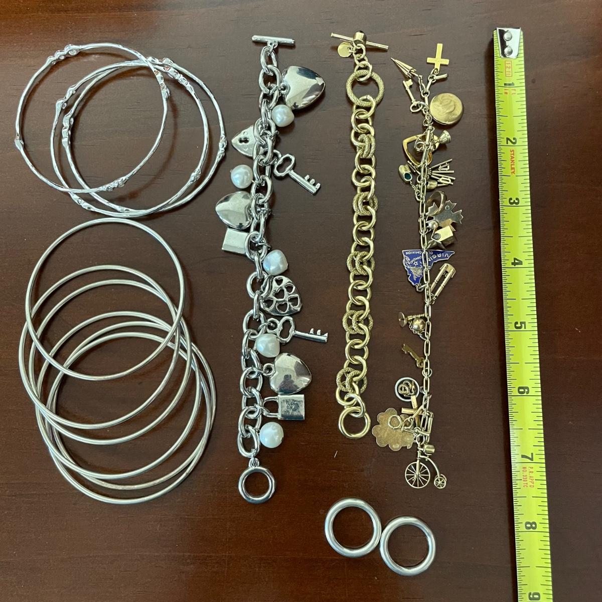 Lot features linked gold bracelet marked 10K by J Bohan with a cobalt blue colored gem in its toggle clasp. The charm bracelet has a spring ring clasp marked 14k and multiple fun and unique charms. Known markings include Sterling on the clover and Virginia charms, 14k on the church and 10k on the desk fan and cross. Lot also includes a shiny silver colored heart & locket charm bracelet that appears to have fresh water pearls. An extra pair of thick round chain pieces and two sets of bangles are also in this collection. See images. Shipping available. All sales are final. No returns or refunds. Please bid accordingly.